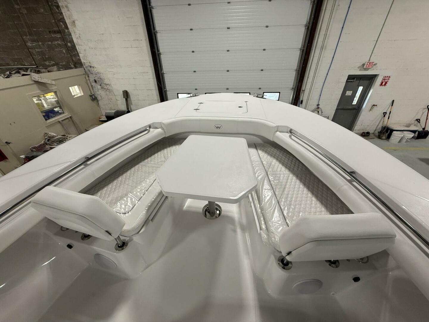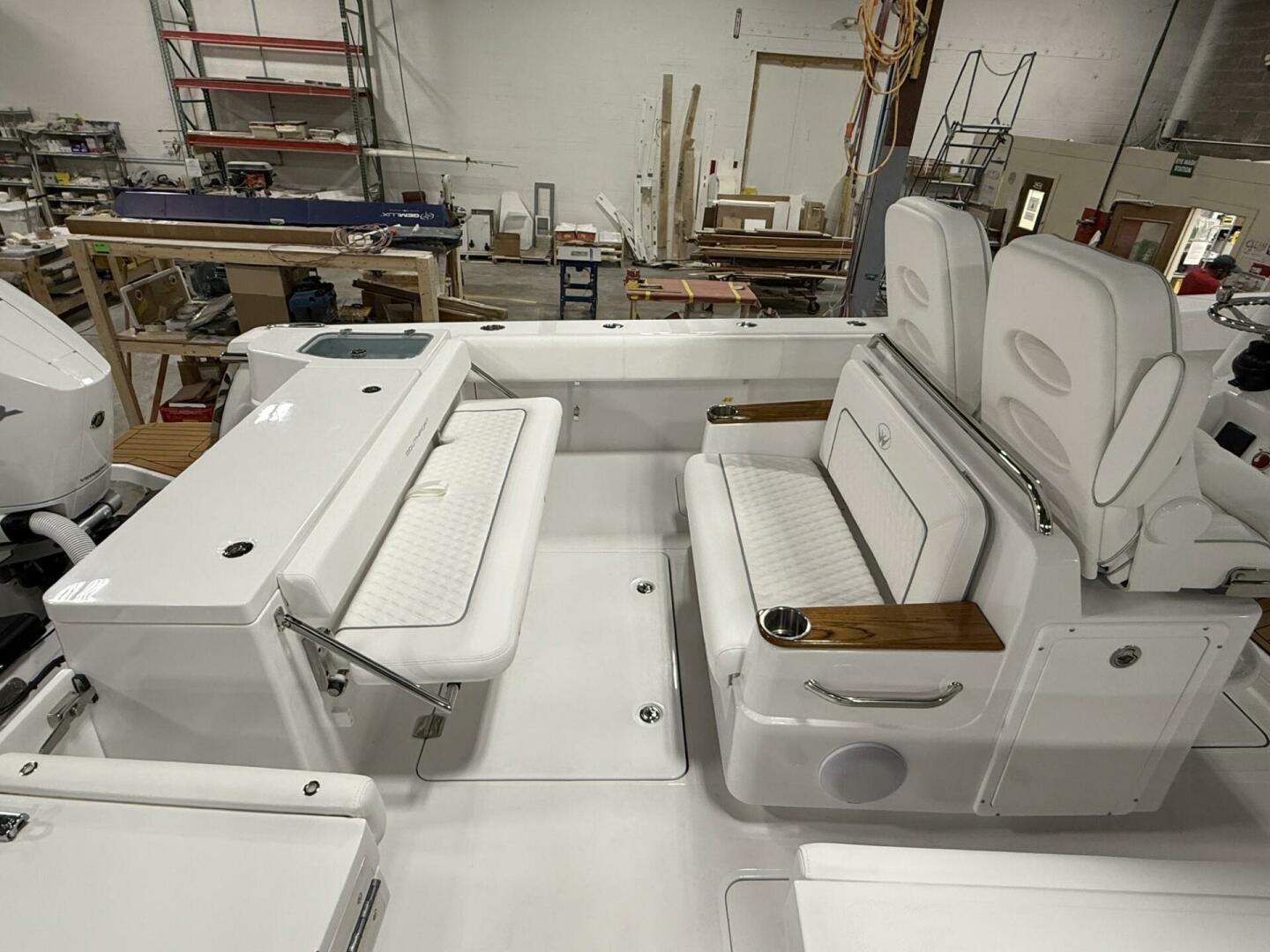 - Mezzanine Rear Facing Seating with Cooler Tubs Beneath Seats, Tackle Storage, Trash Can, Solid Surface Armrest Caps