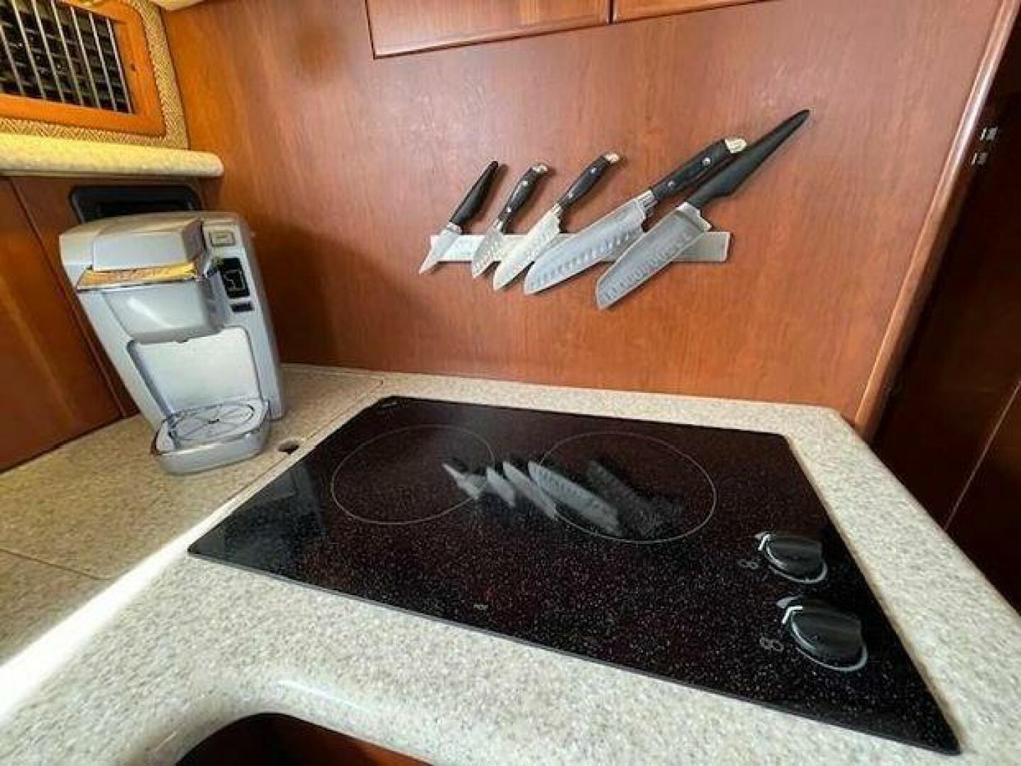 The 43 Sport Bridge boasts one of the largest flybridges of any boat in its class. With its ample seating and wide foredeck, this spacious bridge provides all the room and comfort you need to cruise and entertain in style. Silverton's SideWalk, a unique set of molded steps connecting the bridge to the foredeck, makes access between both safe and convenient whether you're underway, anchored or handling lines. Inside, you'll discover two private staterooms and two full heads complemented by a plush salon finished in fine cherry wood and a full-amenity galley. A wealth of additional standard features like solid Corian countertops, designer fabrics and a 20" flat screen TV remind you that you're aboard a Silverton.