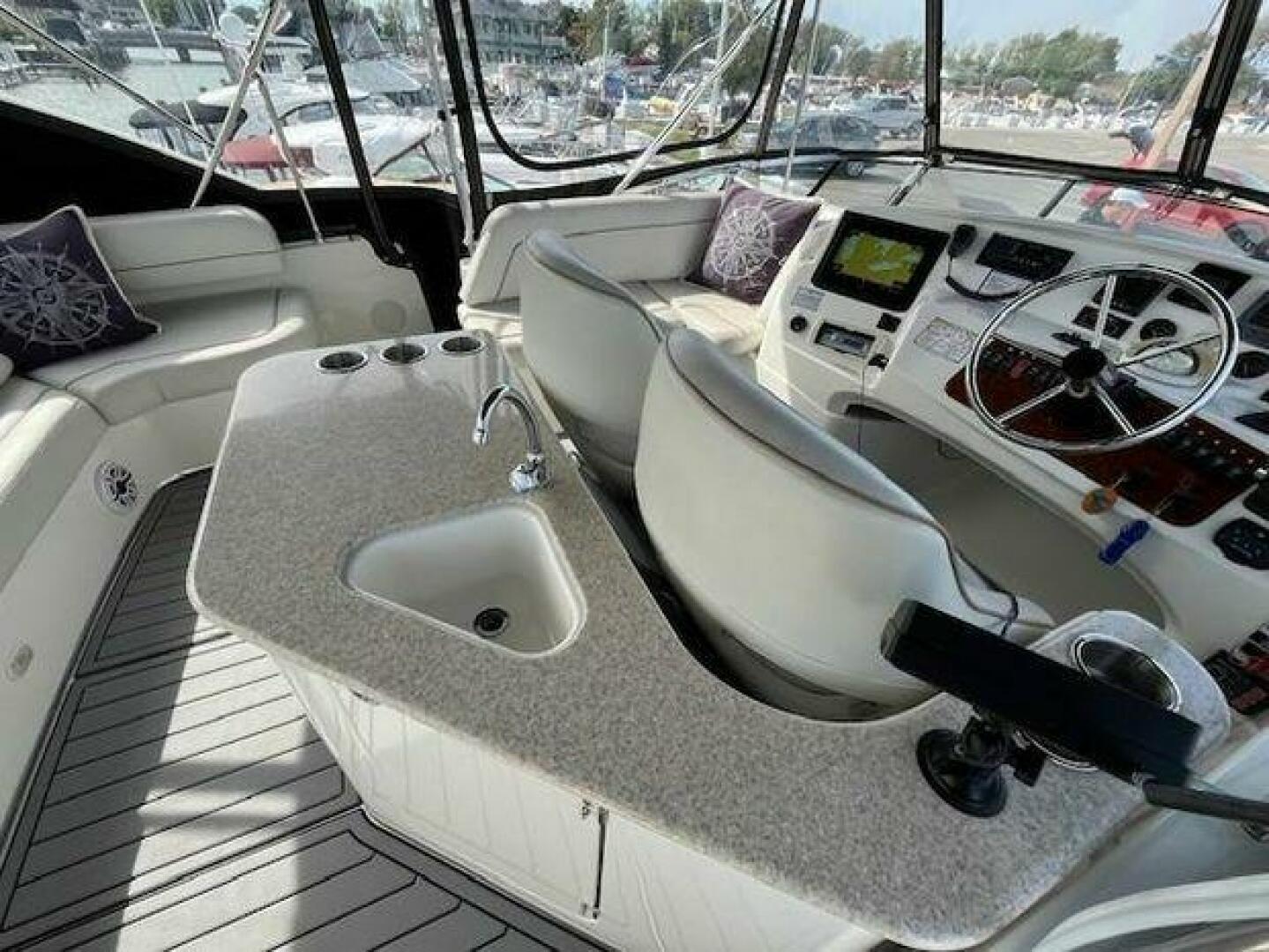 Freshwater / Great Lakes boat since new this vessel features Twin Volvo Penta TAMD75P EDC Diesel Engines (480 HP each) with 1200 original hours. Notable features include but are not limited to the following: Air-Conditioning & Heat (3-Units) (2) Heads (Vacuflush) w/Vanity/Sink/Stall Showers, Central Vacuum System, Kohler 8Kw Generator, Windlass Anchor w/Foot Pedal & Helm Controls, Complete Electronics Package (NEW Garmin FPSMAP 1243XSV Multifunction GPS/Radar/Chartplotter w/US & Canada Navionics & Charts, NEW Garmin Grid 20 Remote Control, NEW Garmin GMR Fantom Dome Radar, Speed Log and Depth Sounder, West Marine Multifunction VHF Marine Radio, Danforth Compass, and Volvo Engine Monitor and Multi-Function Display). Oversized Horn Cluster for Semi-Like Sound. Premium Stereo System w/JL Audio and Amp, (2) LCD-Flat Screen Televisions (Including a Retractable TV in the Salon that Disappears from View. She Features The Main Deck Cabin Boasts an Immense Salon with Convertible Sofa, Loveseat and Entertainment Center, a Superbly Equipped Galley and Separate Dinette Area. Cherry is Featured Throughout the Yacht in Joinery, Doors and Bulkheads in High Gloss and Satin Accents. This Yacht Comes with Supple Leather Seating Throughout and has Six Spacious Berths plus MUCH more!