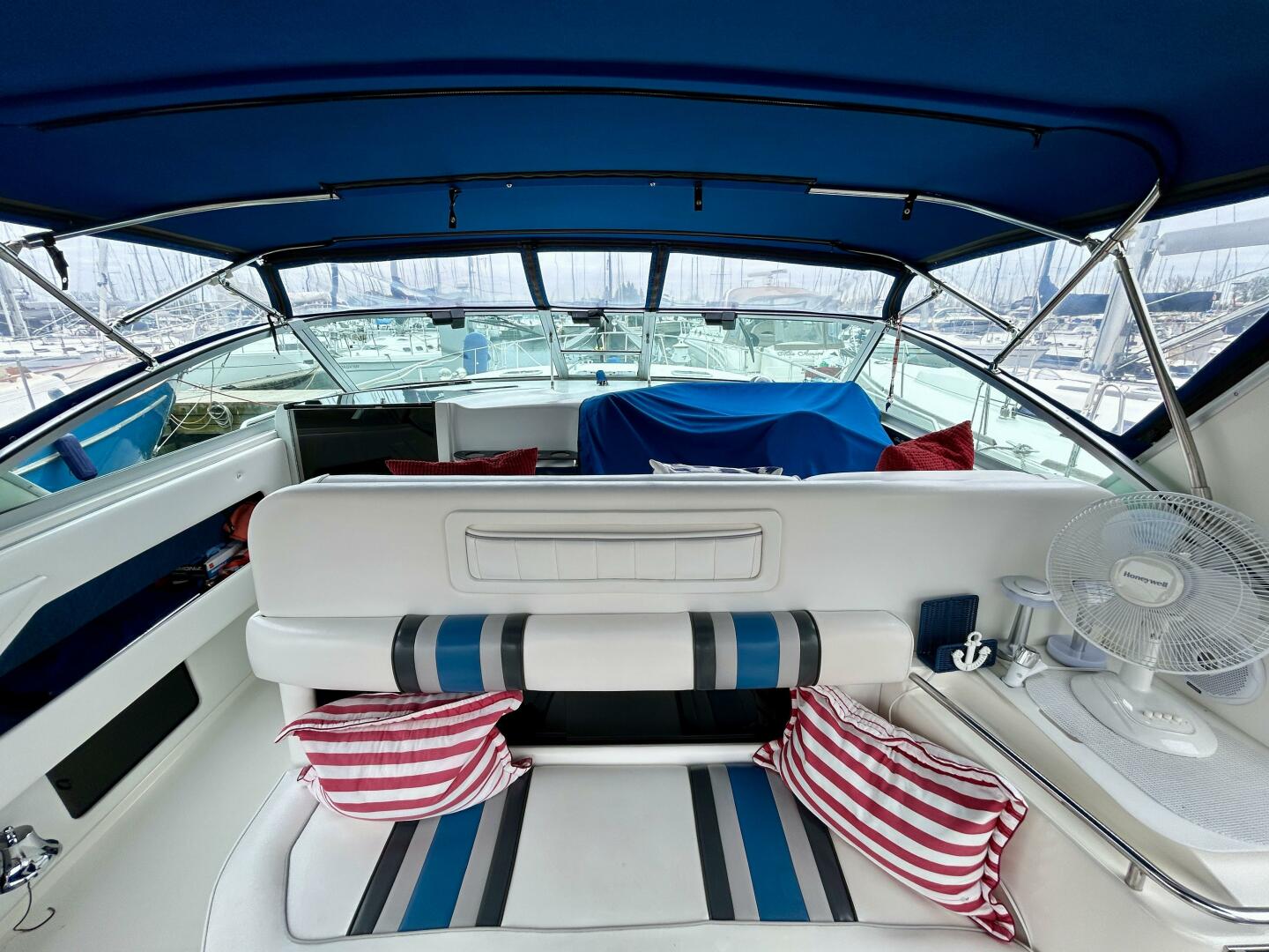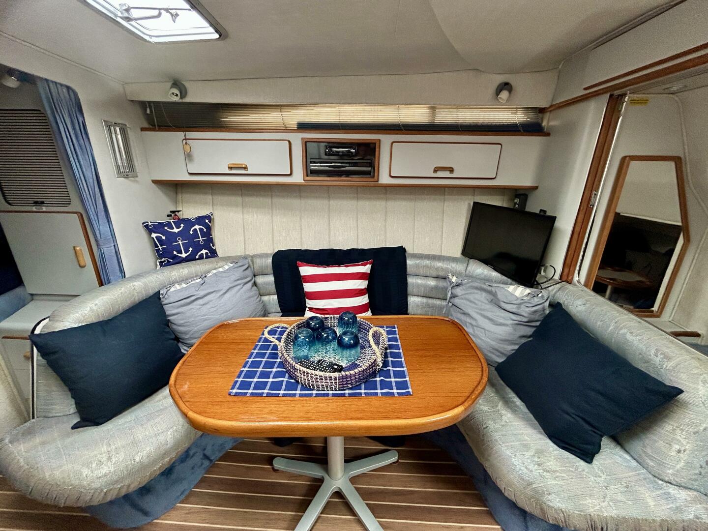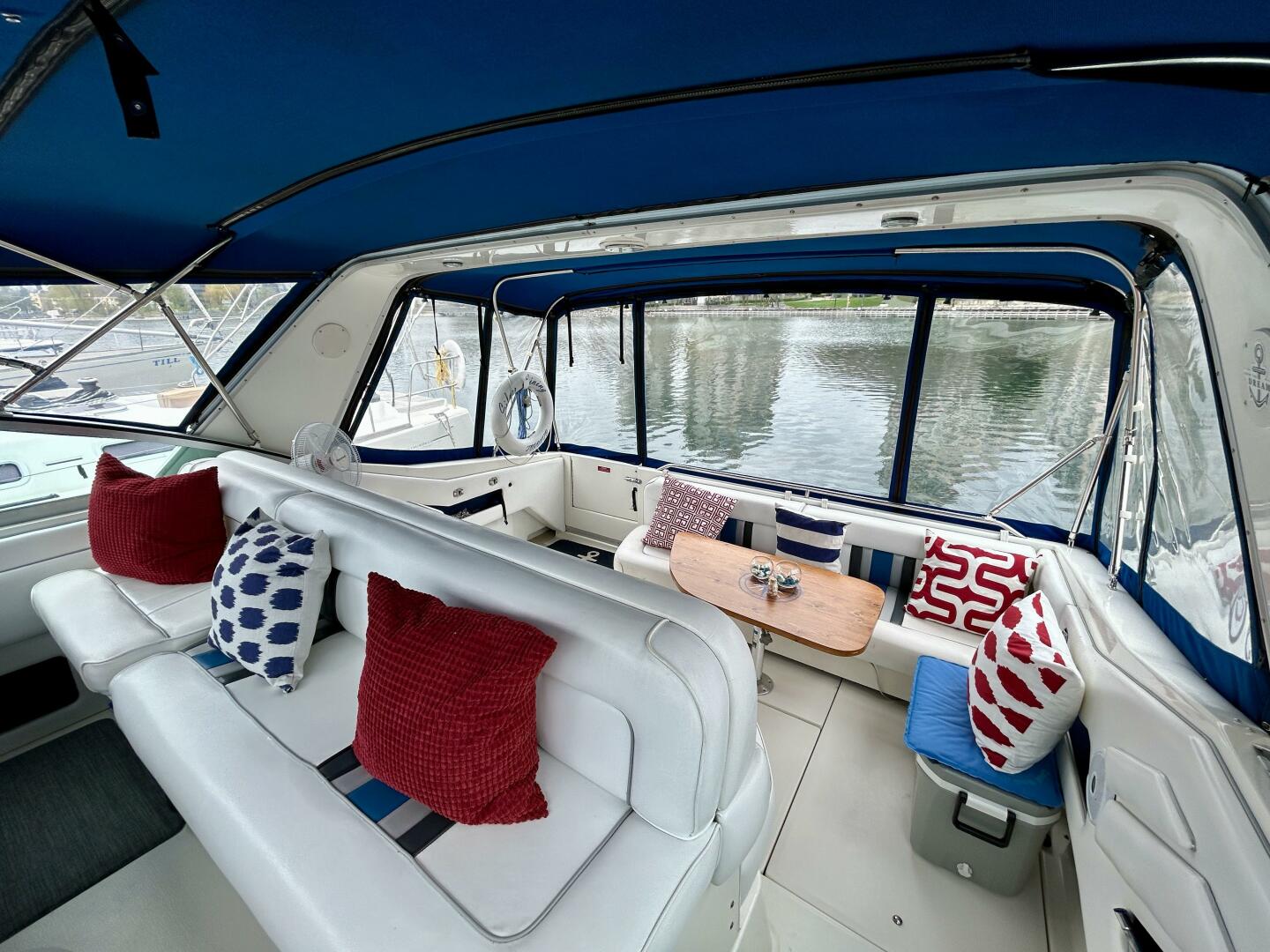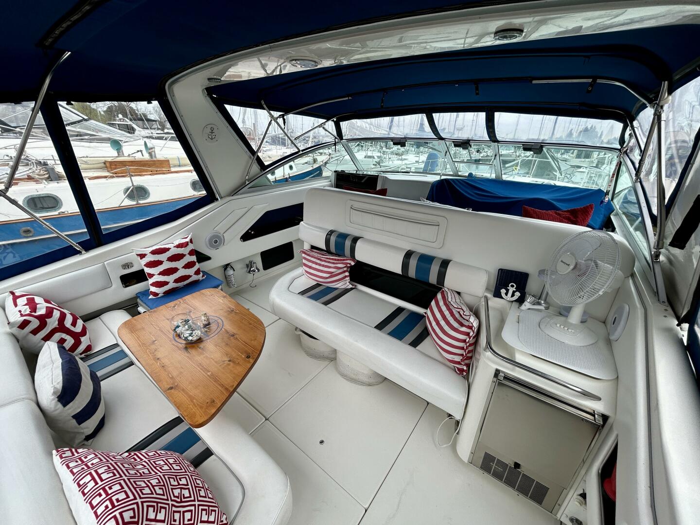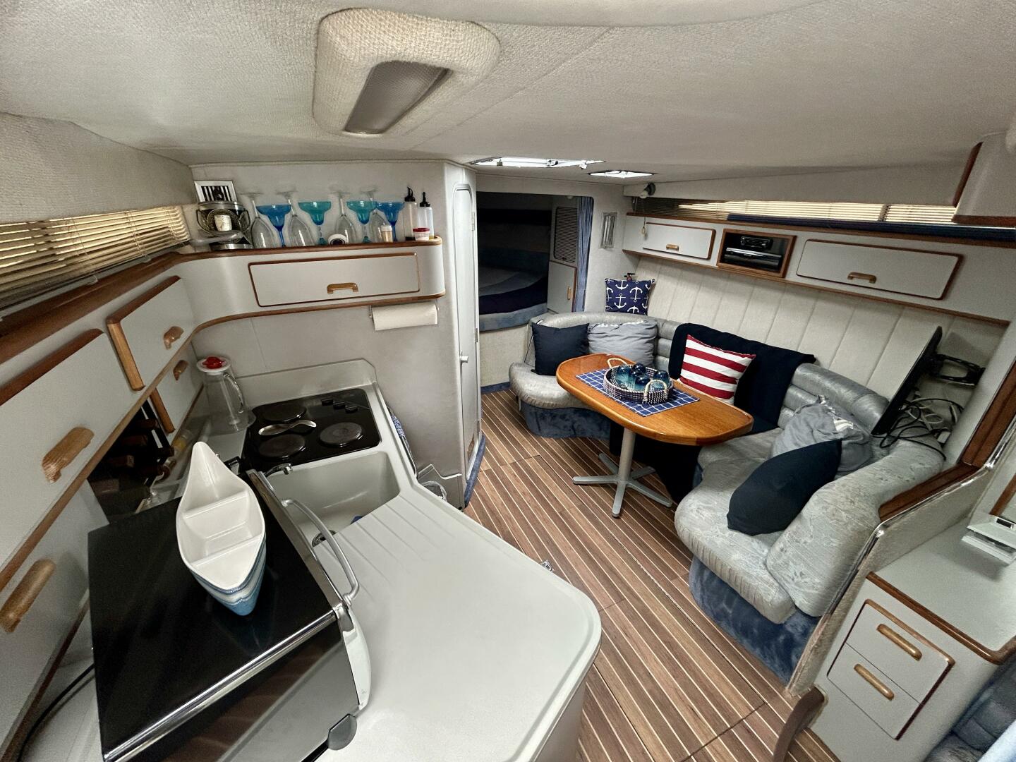 Like many Sea Rays, the 350 Sundancer has aged well. First introduced in 1990s (later called a 370) the sleek lines were considered a Stylish boat then, and is still a handsome design by today's standards for an express cruiser. The 12ft4in beam offers great stability and ample interior room for 6 to sleep. The salon is dominated by the large semi-circular dinette that converts to a berth, forward you will find the main berth and aft is the sunken conversation pit that also converts into a berth. There is a large galley with teak flooring, a microwave and 3-burner cooktop. Topside you will find seating for a small crowd with three full sized bench seats. There is also a wet bar with a sink and ice maker. Powered by twin Mercruiser 7.41L engines, the Sea Ray 350 is said to cruise in the low 20-knot range and reach a top speed of just under 30-knots.