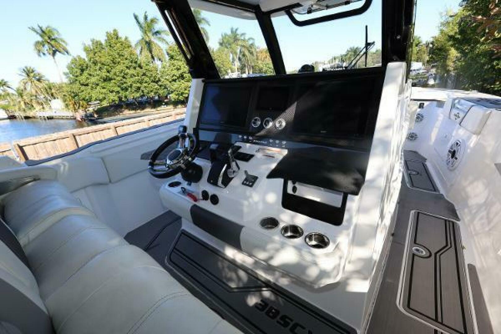 With the 38SCX, we take Speed & Luxury to new heights. The boat's next-generation T-Top extends to the gunwale sides, covers the optional second row bolsters and features a protective three-piece ventilated glass windshield. Exclusively Fountain, the SCX includes a host of standard upgrades including premium six-color upholstery and Marine Mat on the cockpit sole, gunwales, and T-Top. Upfront, a new powered high-low table is perfect for entertaining. The forward chaise lounge has been completely restyled and is wide enough for two with supersized insulted storage underneath. Aft, an elegantly redesigned full-width bench has an ice chest under the mid position armrest. Sacrificing no creature comforts, inverter-powered air conditioning is standard in both the cockpit and cabin. An optional 5KW Panda generator provides around-the-clock comfort on steamy summer nights. Belowdecks, the all new oversized cabin includes a couch that converts to a full-size sleeper. A large tinted window emits light and creates a spacious feel.