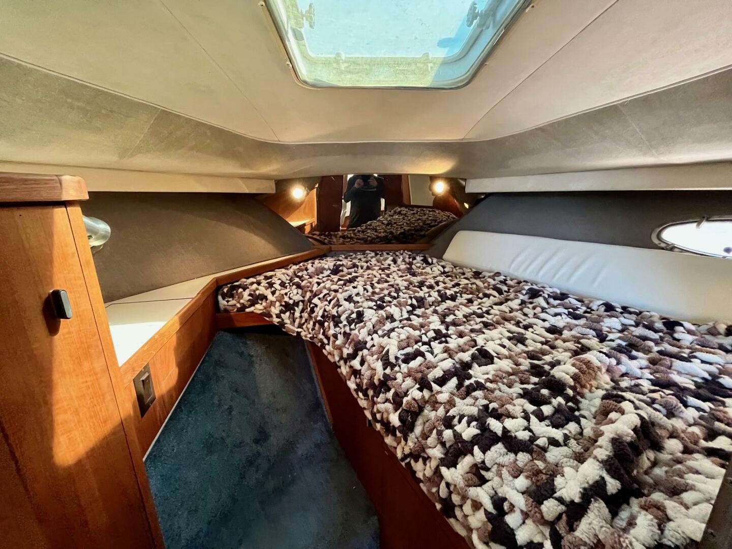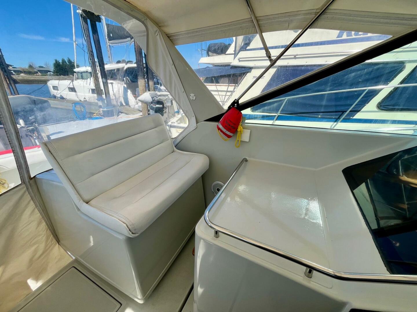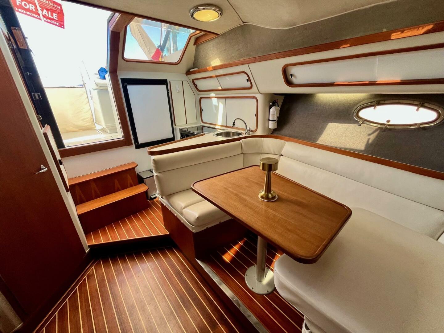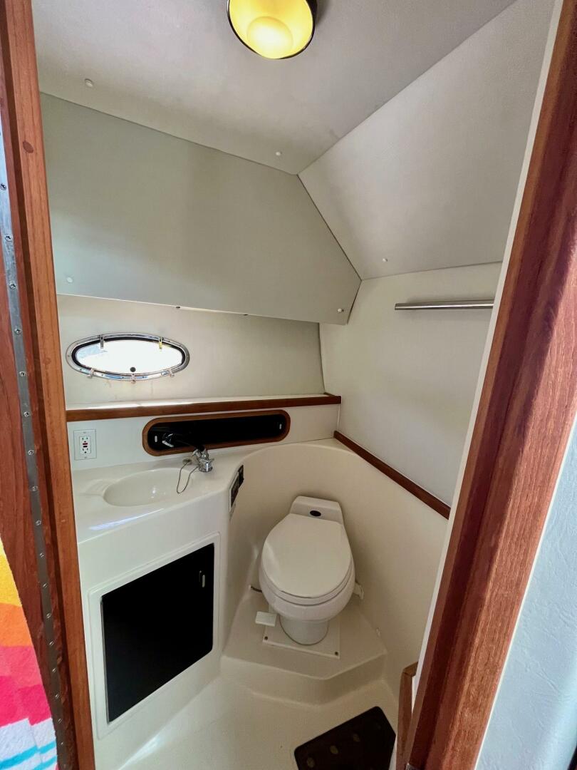 Inside, rich teak accents and a thoughtfully designed layout create a warm, inviting escape. The private forward stateroom offers a cozy double berth with ample storage while a convertible settee and wraparound dinette provide extra space for overnight guests. The fully equipped galley, complete with a refrigerator, stove, microwave, and sink, ensures you can dine in style no matter how far you roam. The enclosed head with vanity, electric toilet, and shower adds a touch of home on the water.