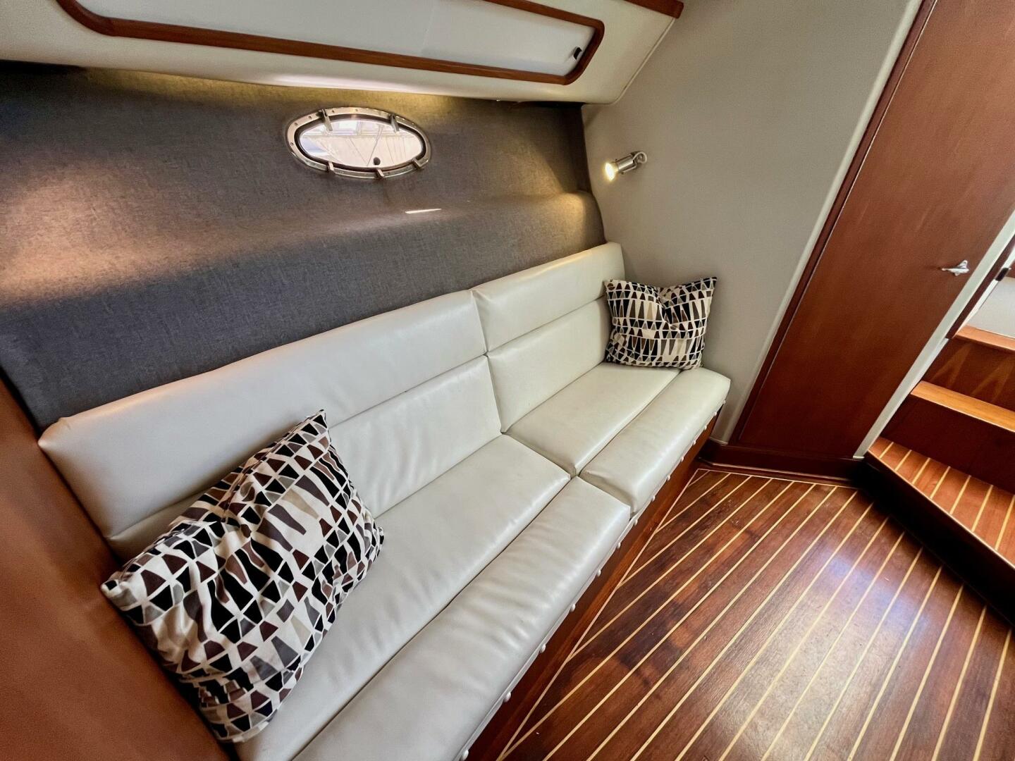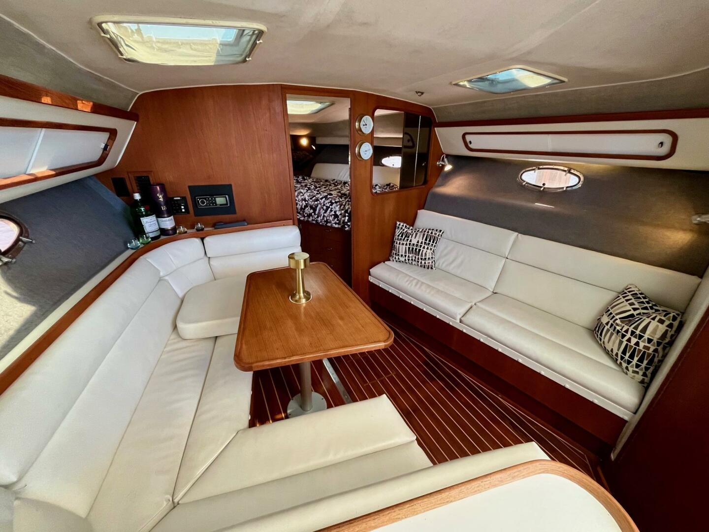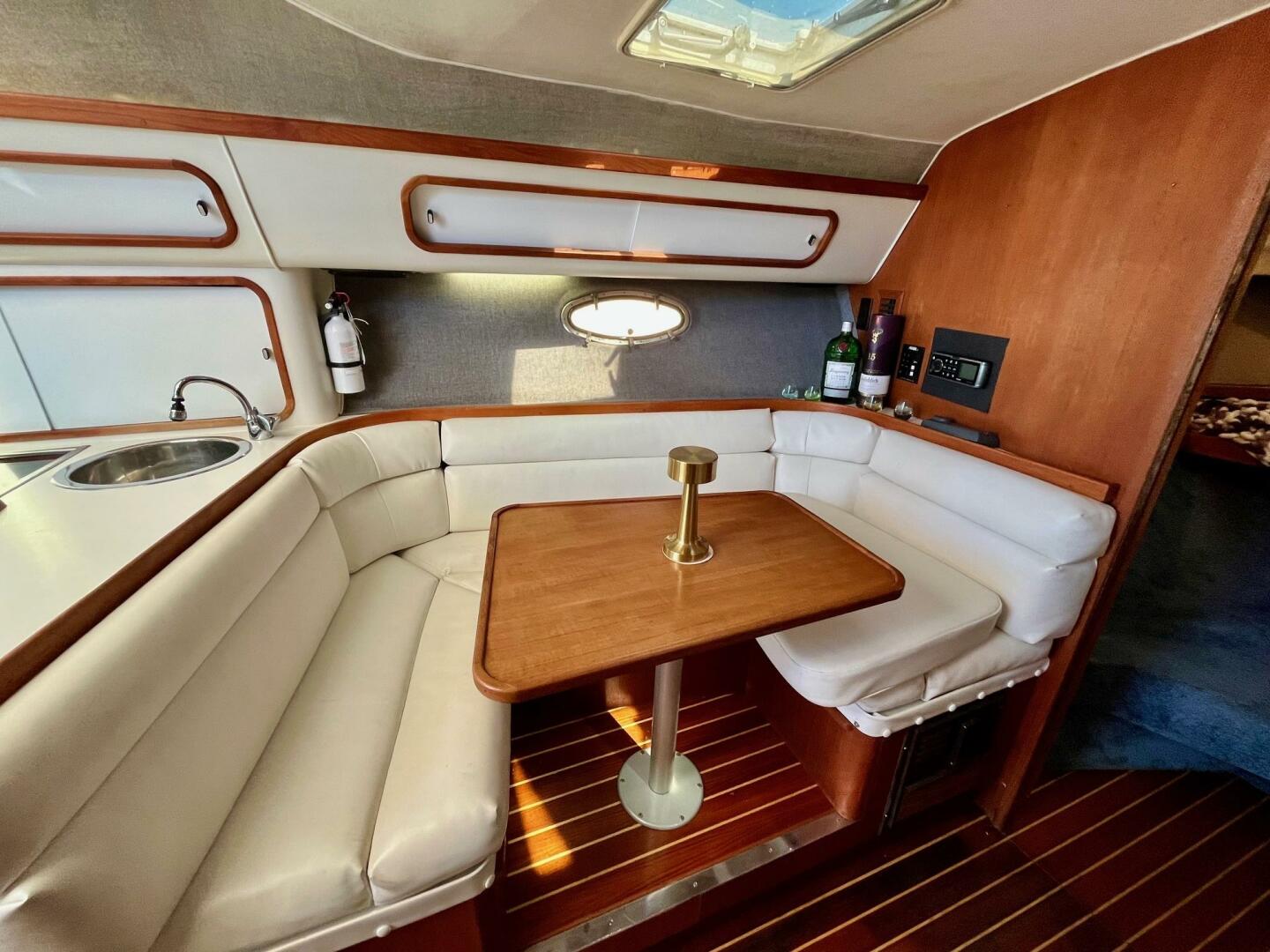 Inside, rich teak accents and a thoughtfully designed layout create a warm, inviting escape. The private forward stateroom offers a cozy double berth with ample storage while a convertible settee and wraparound dinette provide extra space for overnight guests. The fully equipped galley, complete with a refrigerator, stove, microwave, and sink, ensures you can dine in style no matter how far you roam. The enclosed head with vanity, electric toilet, and shower adds a touch of home on the water.