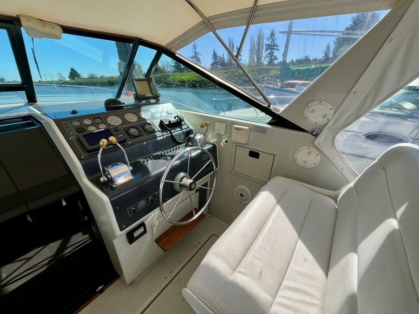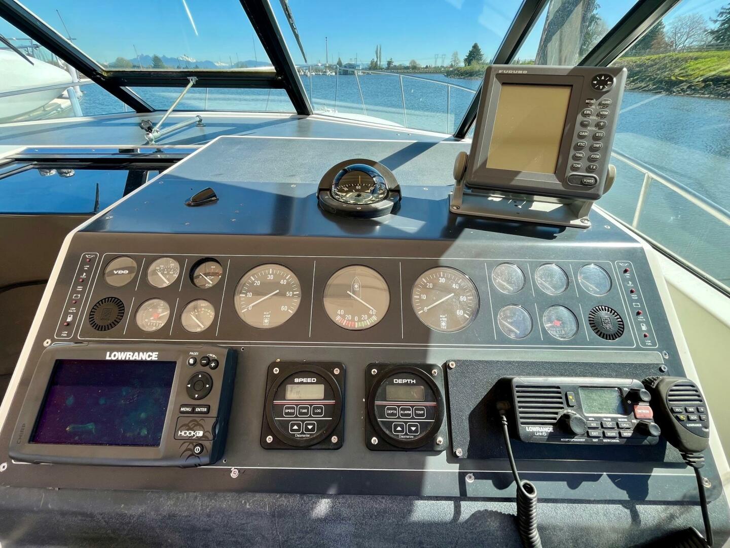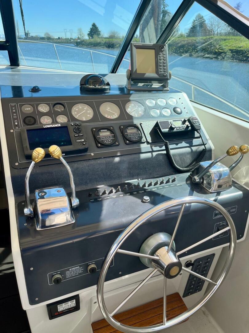 Twin 350 horsepower Crusader 454 engines push you effortlessly across the water, cruising at 21 knots with a top speed of 30. Its modified V hull slices through waves with confidence while the spacious cockpit, equipped with plush seating, a transom door, and bolsters, sets the stage for reeling in your next big catch or sipping cocktails at sunset.