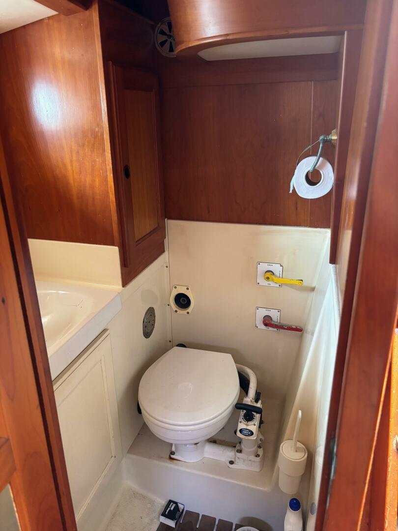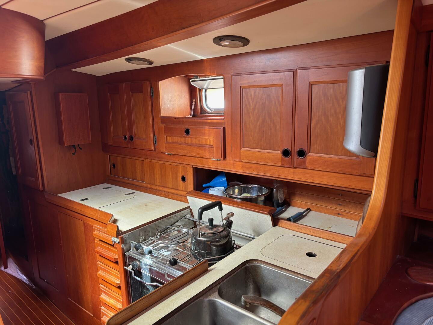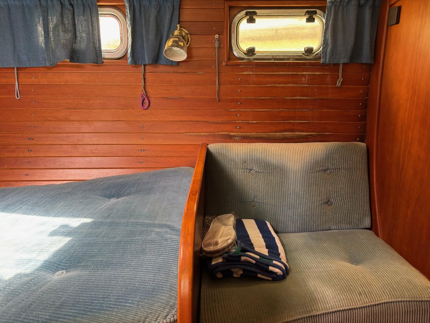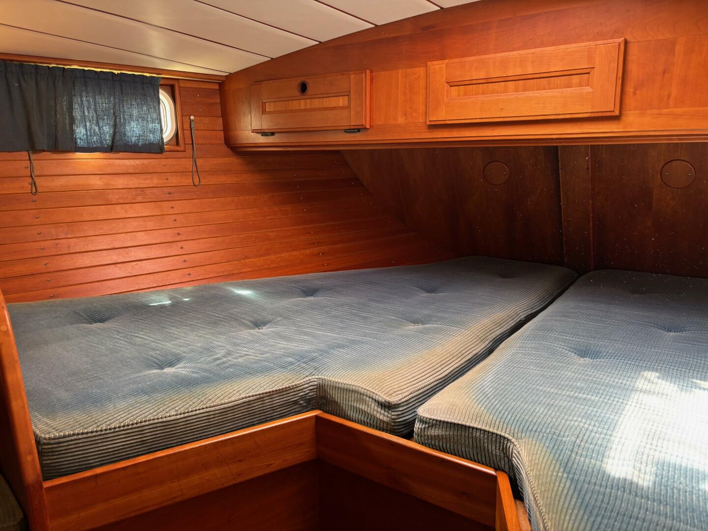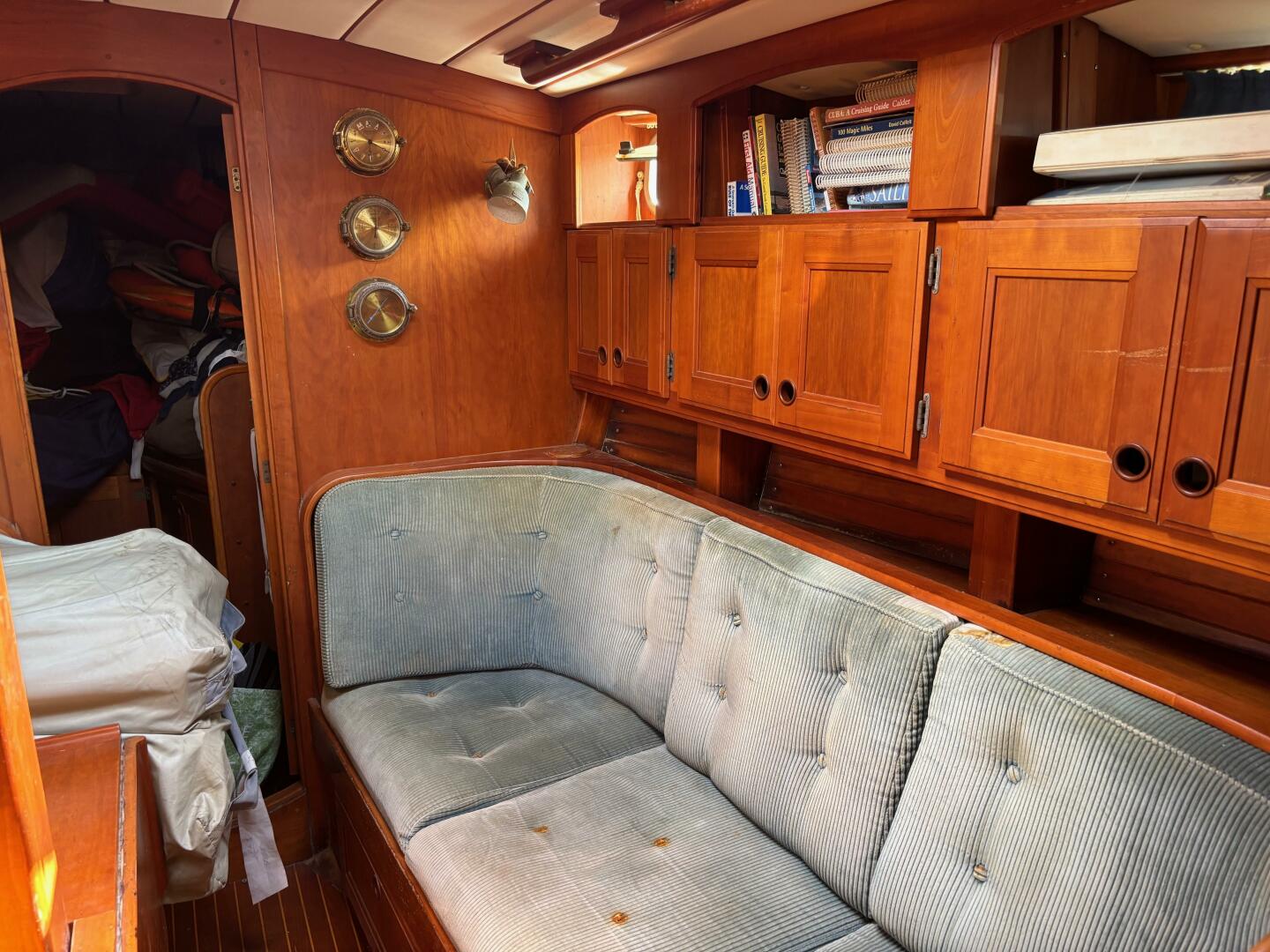 On deck, Barfly features wide side decks, robust stainless hardware, and classic teak surfaces that still show the quality of her original build. The center cockpit is deep and secure, offering excellent visibility and protection, making her ideal for offshore conditions or long stays at anchor. The layout is practical, safe, and thoughtfully designed for a couple or small crew handling her short-handed. Below deck, the story continues. Stepping into Barfly’s interior, you’re welcomed by warm mahogany joinery, a spacious layout, and an unmistakable sense of quality. The main saloon is cozy yet open, with a solid drop-leaf table and generous seating, perfect for hosting guests or relaxing after a day on the water. The galley is efficient and seagoing, with ample storage and workspace. Opposite is a nav station, just as you’d expect on a true offshore yacht. Accommodation is generous, with a forward guest cabin and a large, private owner’s cabin aft with a comfortable double berth and plenty of storage. Barfly has been well cared for, and while she could certainly benefit from some maintenance, cosmetic attention, and an upgrade or two, she’s a sound, capable platform ready for new adventures.
