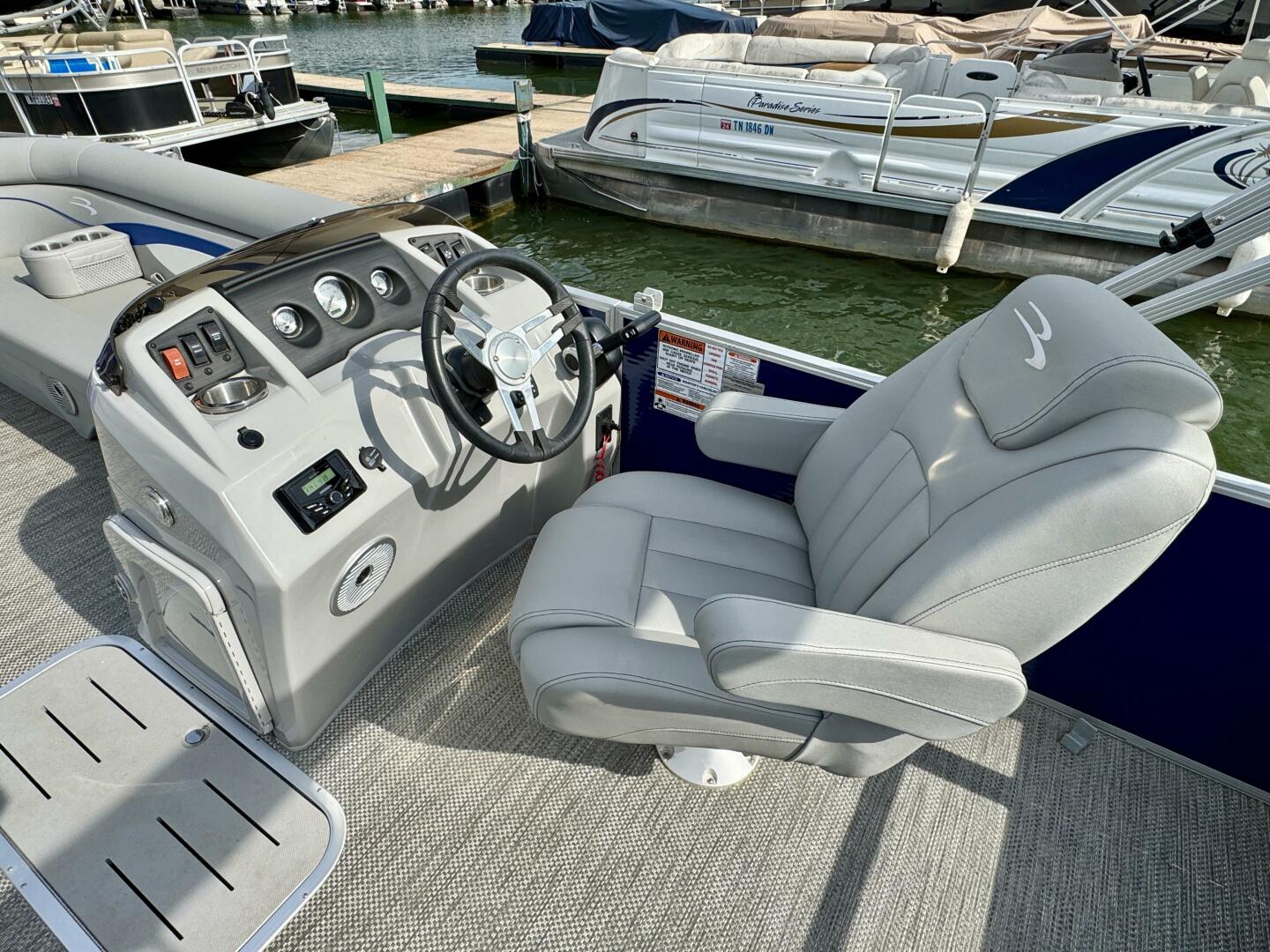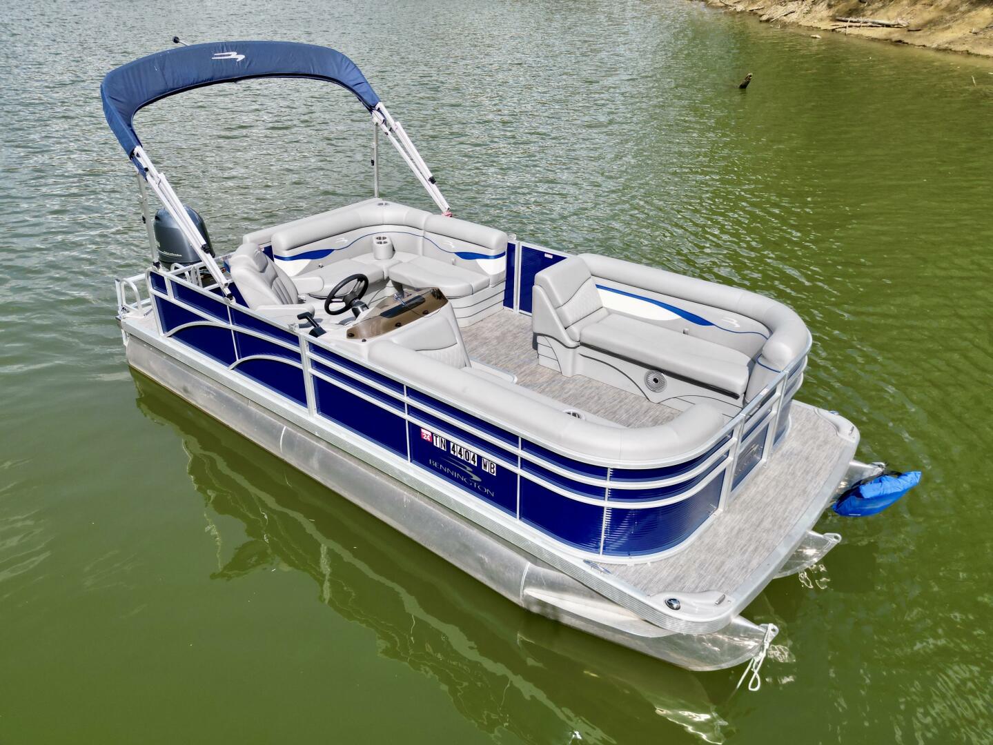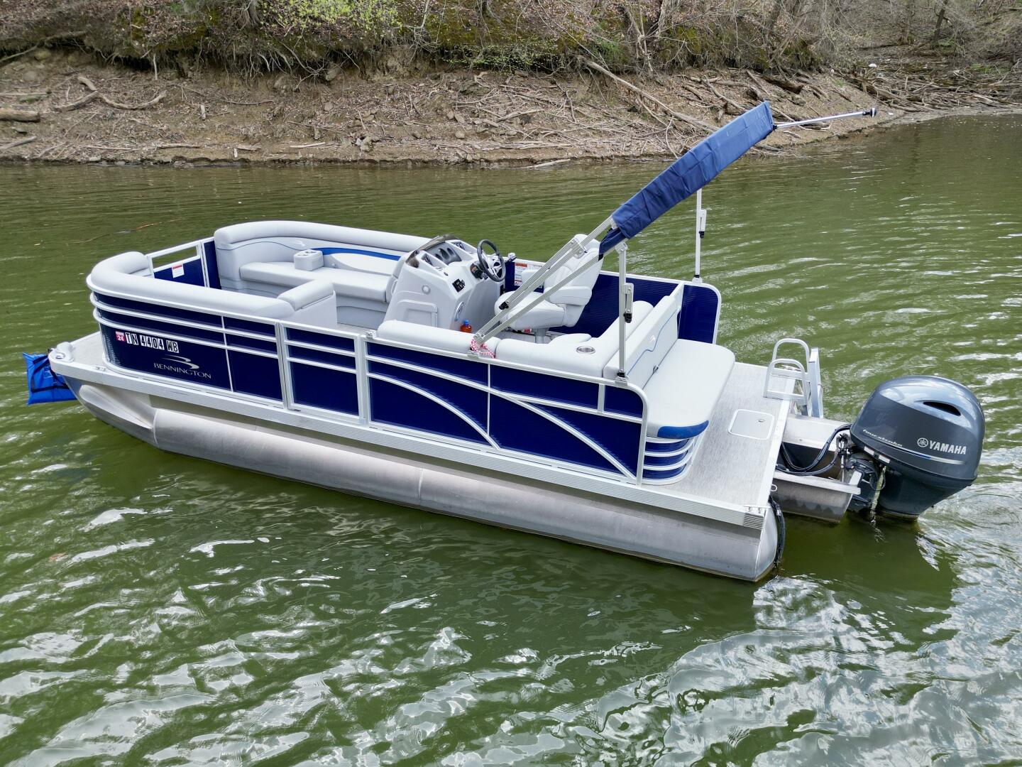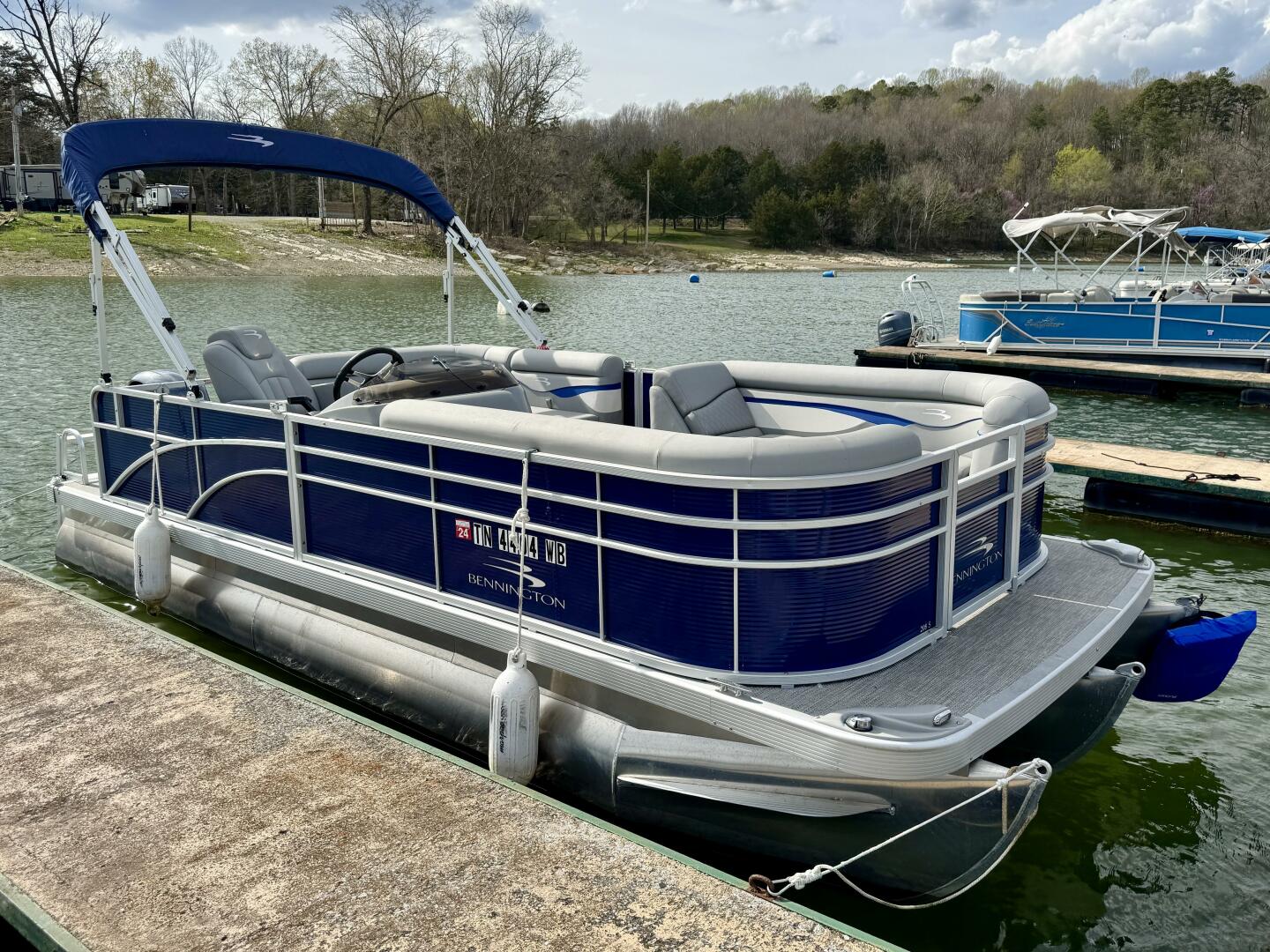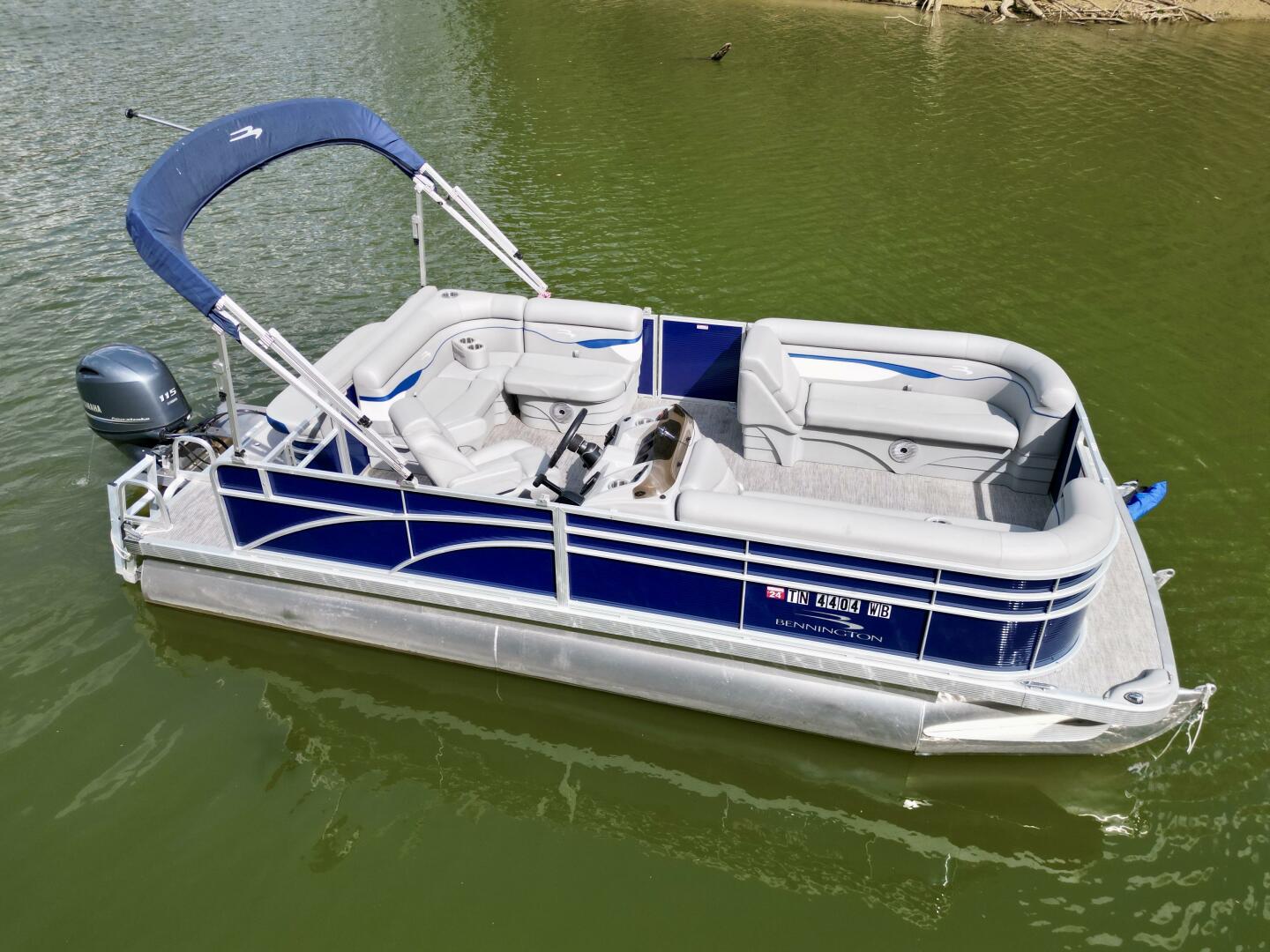 This One-Owner 2024 Bennington 208 SLJ SPS Tritoon For Sale on Norris Lake Tennessee is equipped with a 115HP Yamaha 4-stroke outboard motor (with transferable warranty) and features a bimini top, mooring cover, sea-star hydraulic steering with tilt steering wheel, luxury woven vinyl flooring, the SPS performance package with 25'' diameter pontoons, lifting strakes on the center pontoon, an aluminum under-deck wave shield, an in-floor storage compartment, a kicker stereo with 6 illuminated speakers, a garmin depth/fish finder/sonar with gps and integrated compass, a 12 volt power outlet, docking lights, a battery switch, an integrated livewell, rated for 11 persons, always fresh water use, a transferable covered slip on Norris Lake Tennessee is available, plus transferable Bennington Warranty through July 8th of 2033 and more!