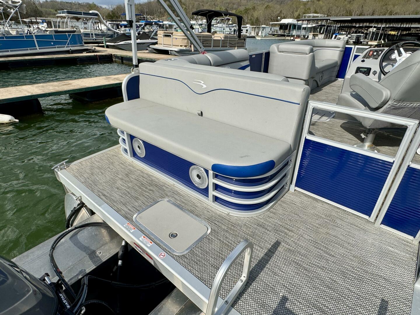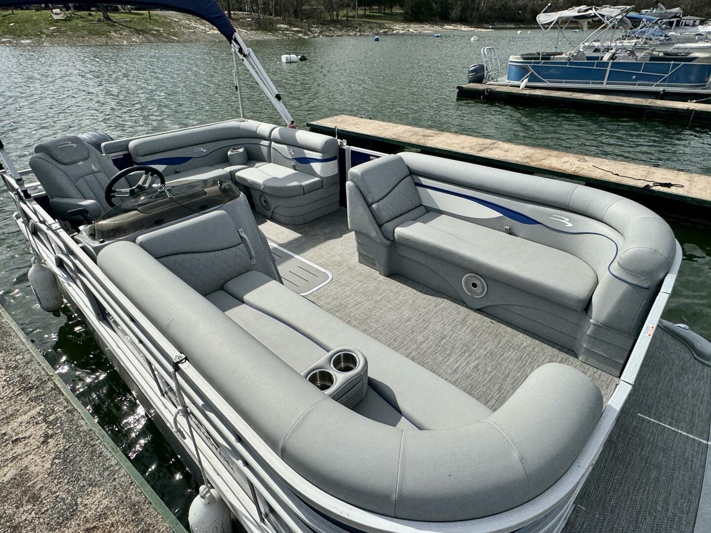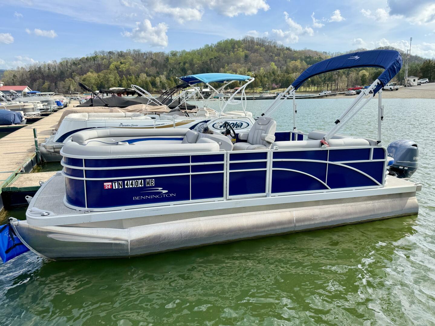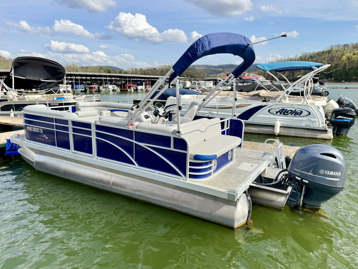 This One-Owner 2024 Bennington 208 SLJ SPS Tritoon For Sale on Norris Lake Tennessee is equipped with a 115HP Yamaha 4-stroke outboard motor (with transferable warranty) and features a bimini top, mooring cover, sea-star hydraulic steering with tilt steering wheel, luxury woven vinyl flooring, the SPS performance package with 25'' diameter pontoons, lifting strakes on the center pontoon, an aluminum under-deck wave shield, an in-floor storage compartment, a kicker stereo with 6 illuminated speakers, a garmin depth/fish finder/sonar with gps and integrated compass, a 12 volt power outlet, docking lights, a battery switch, an integrated livewell, rated for 11 persons, always fresh water use, a transferable covered slip on Norris Lake Tennessee is available, plus transferable Bennington Warranty through July 8th of 2033 and more!