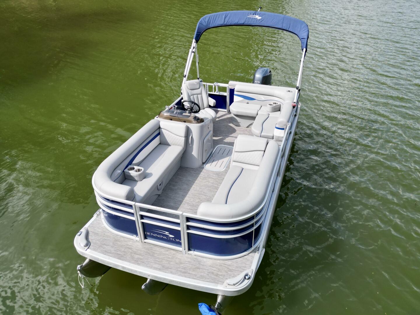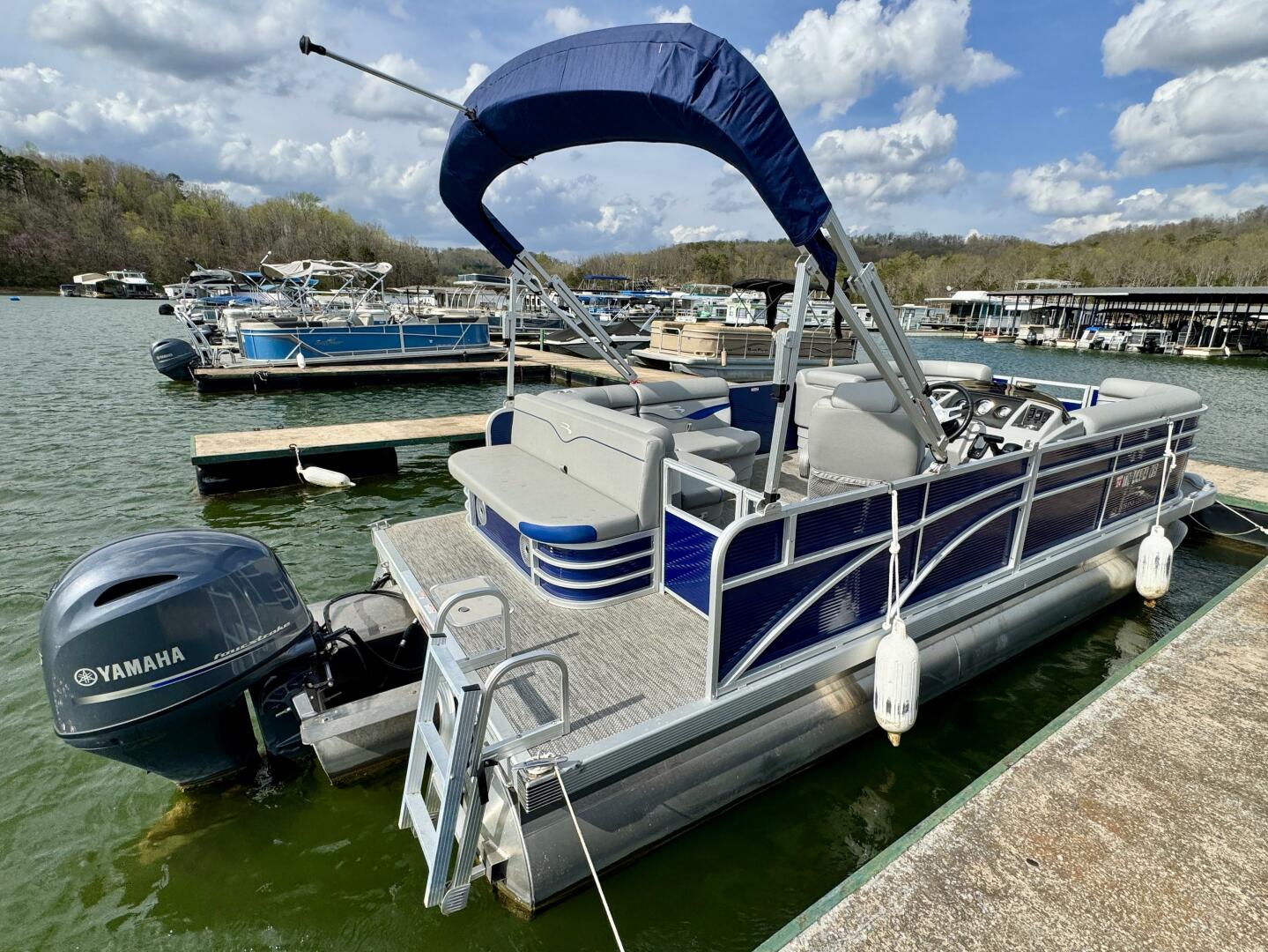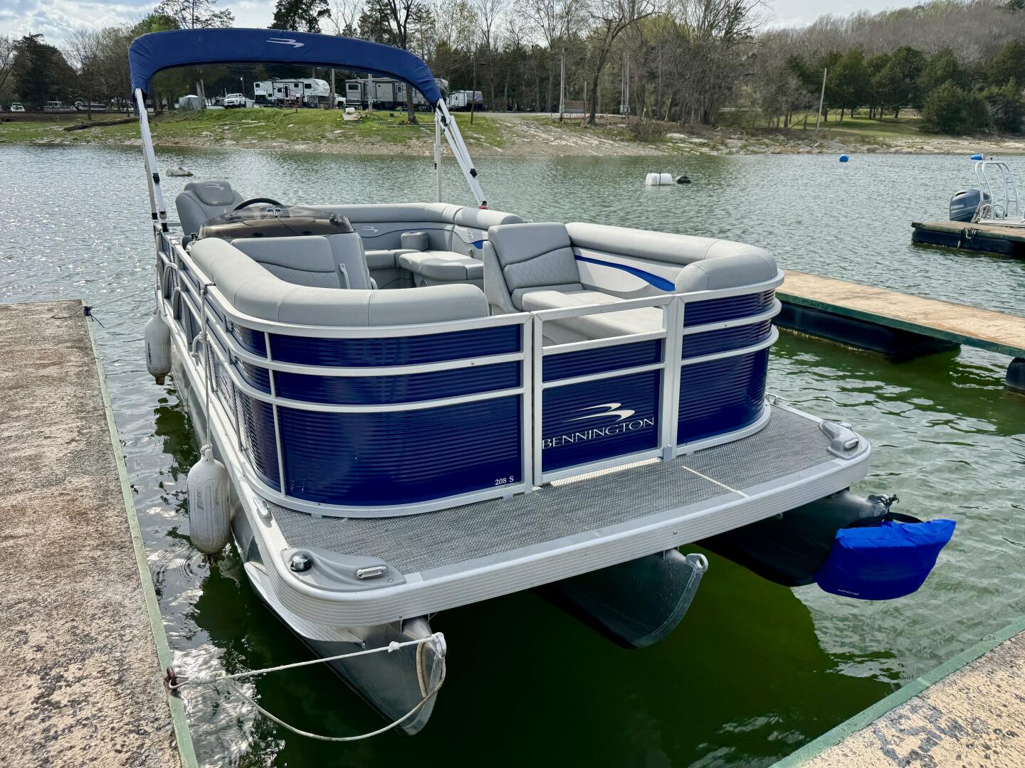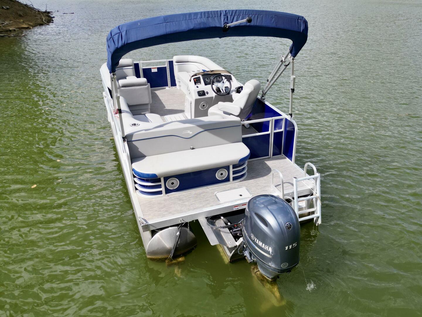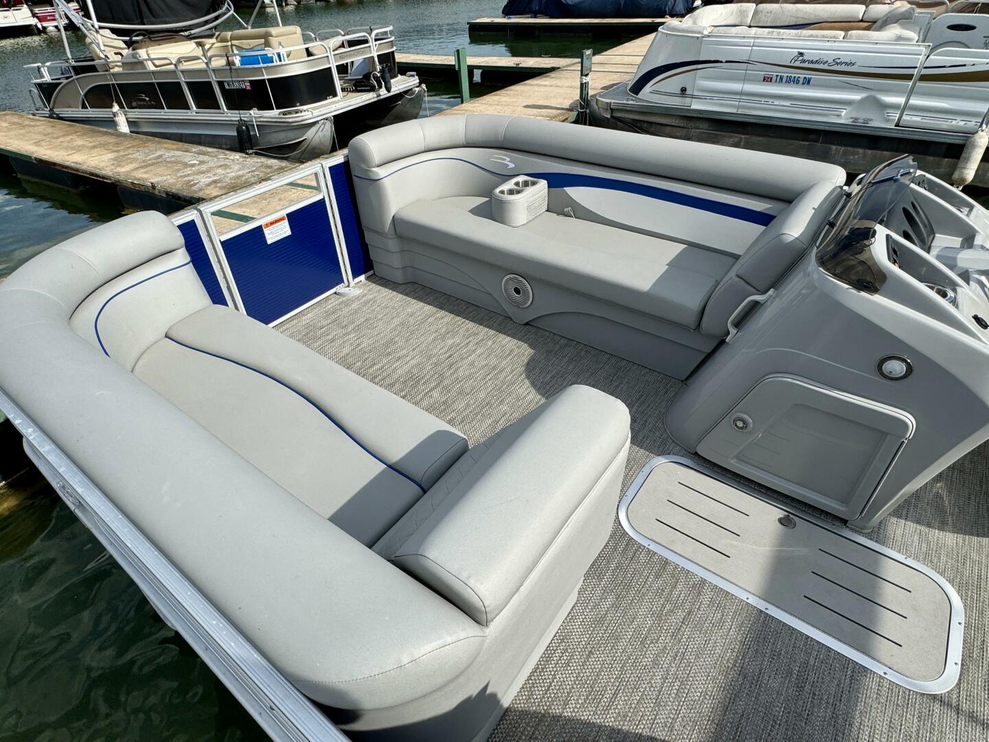 This One-Owner 2024 Bennington 208 SLJ SPS Tritoon For Sale on Norris Lake Tennessee is equipped with a 115HP Yamaha 4-stroke outboard motor (with transferable warranty) and features a bimini top, mooring cover, sea-star hydraulic steering with tilt steering wheel, luxury woven vinyl flooring, the SPS performance package with 25'' diameter pontoons, lifting strakes on the center pontoon, an aluminum under-deck wave shield, an in-floor storage compartment, a kicker stereo with 6 illuminated speakers, a garmin depth/fish finder/sonar with gps and integrated compass, a 12 volt power outlet, docking lights, a battery switch, an integrated livewell, rated for 11 persons, always fresh water use, a transferable covered slip on Norris Lake Tennessee is available, plus transferable Bennington Warranty through July 8th of 2033 and more!