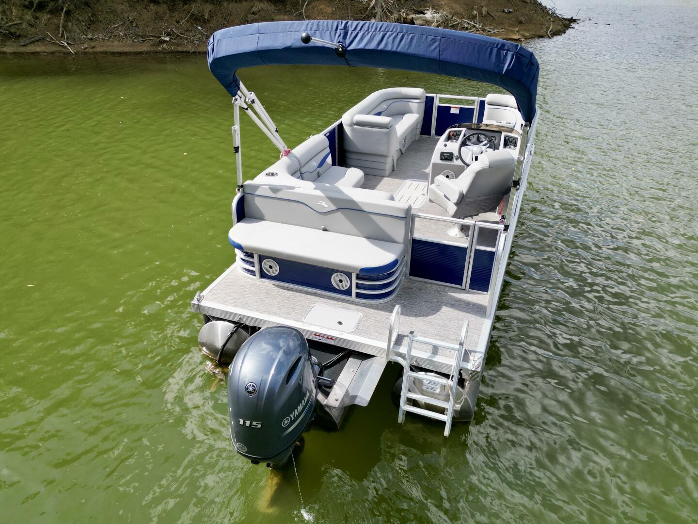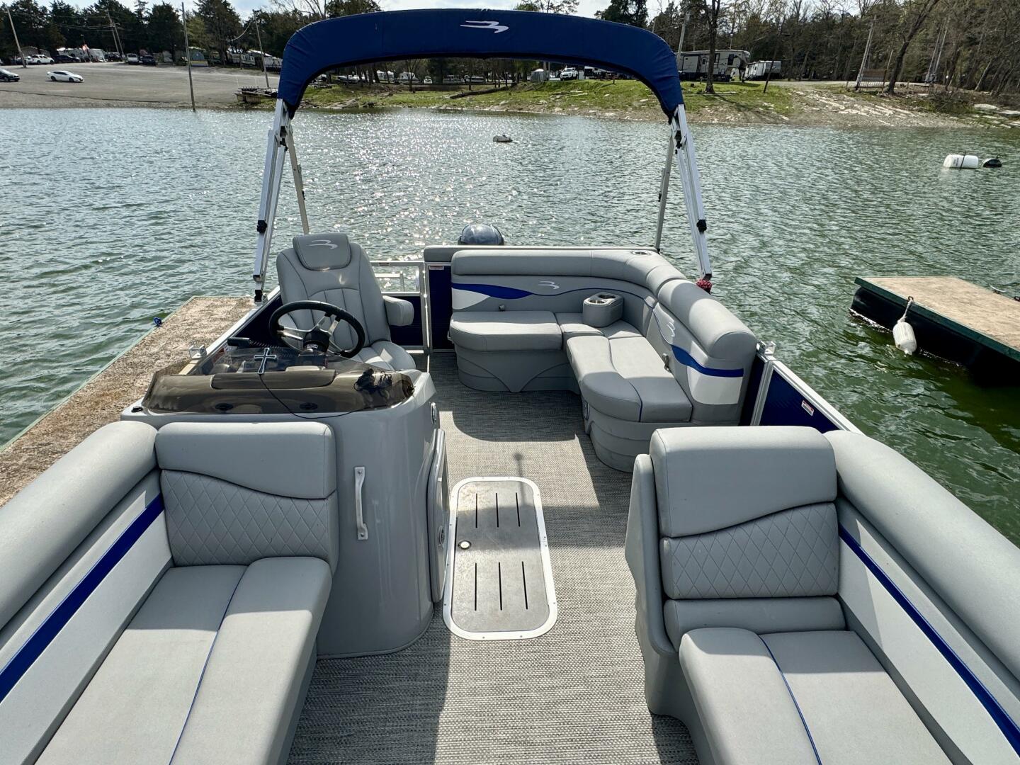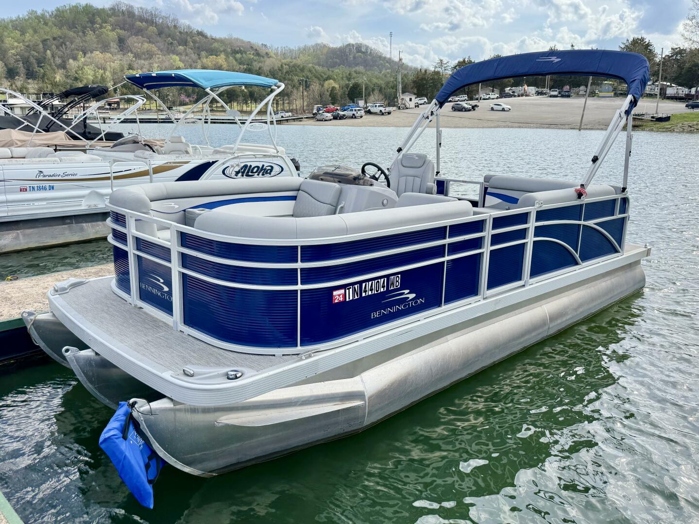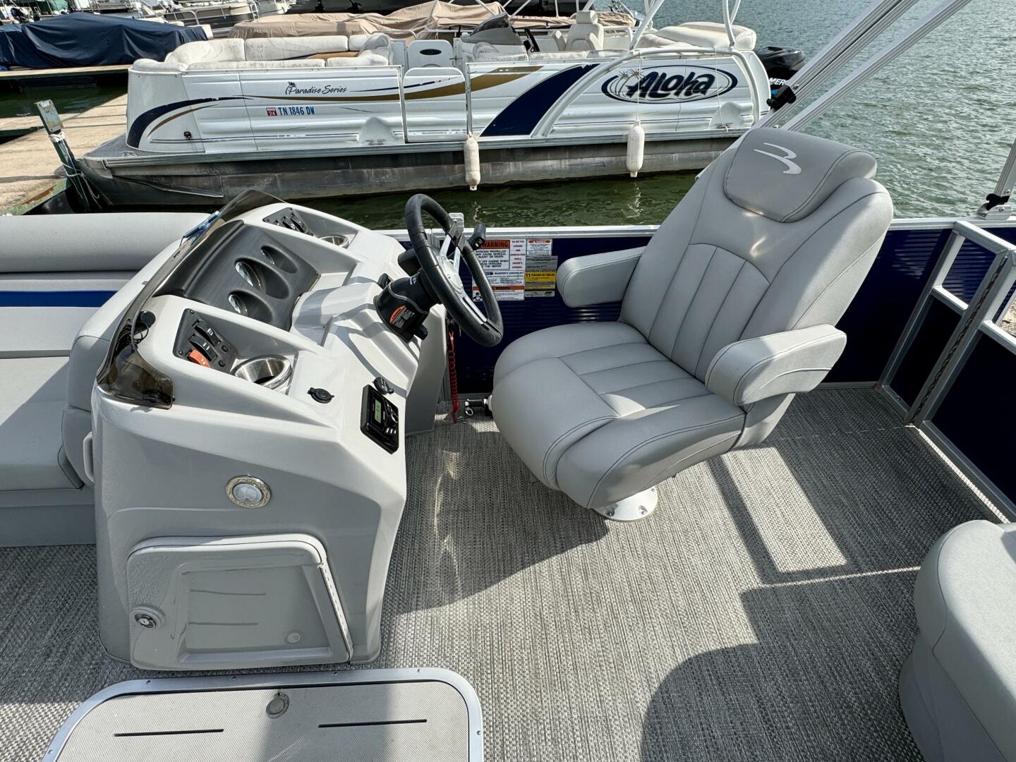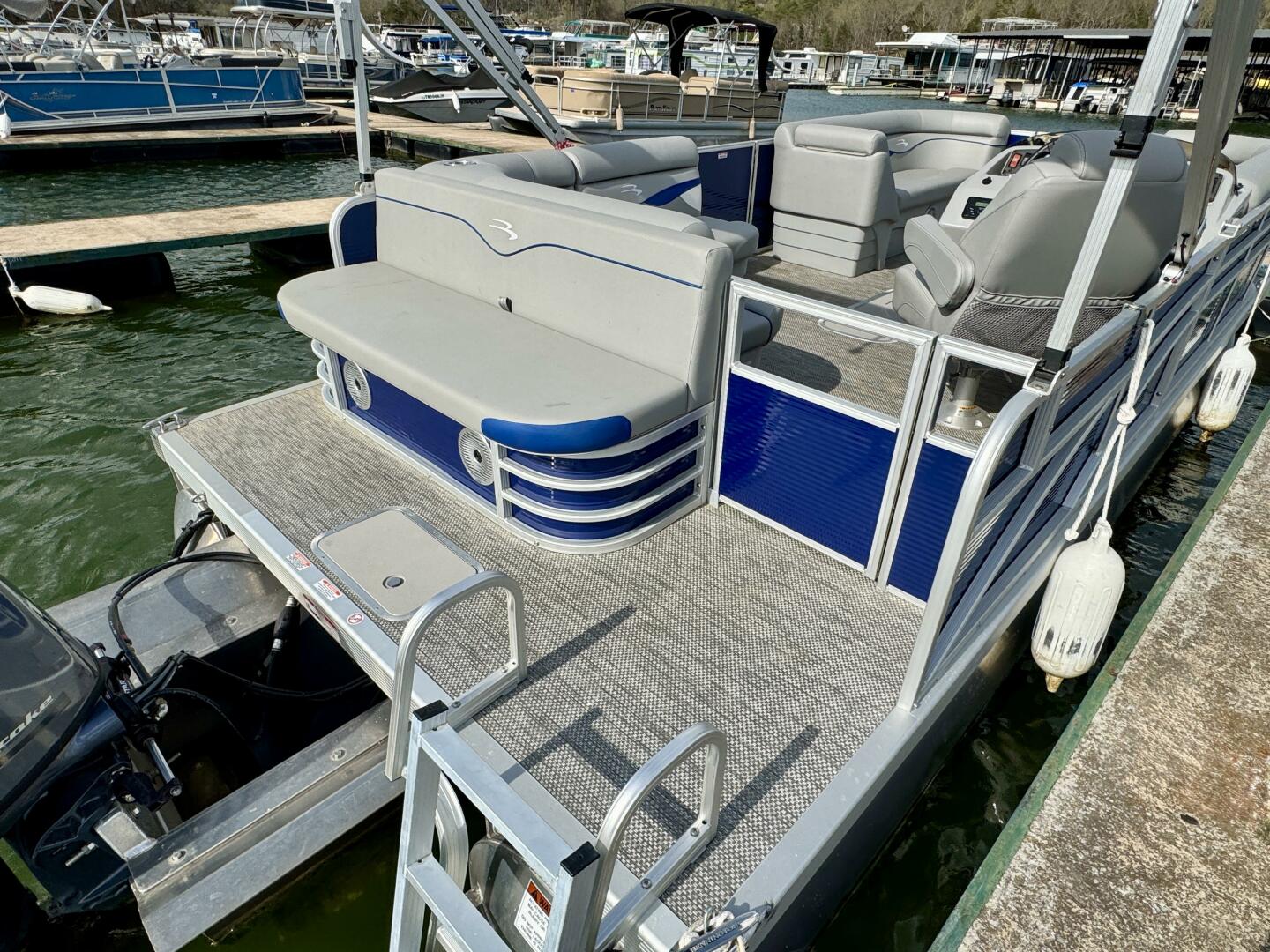 This One-Owner 2024 Bennington 208 SLJ SPS Tritoon For Sale on Norris Lake Tennessee is equipped with a 115HP Yamaha 4-stroke outboard motor (with transferable warranty) and features a bimini top, mooring cover, sea-star hydraulic steering with tilt steering wheel, luxury woven vinyl flooring, the SPS performance package with 25'' diameter pontoons, lifting strakes on the center pontoon, an aluminum under-deck wave shield, an in-floor storage compartment, a kicker stereo with 6 illuminated speakers, a garmin depth/fish finder/sonar with gps and integrated compass, a 12 volt power outlet, docking lights, a battery switch, an integrated livewell, rated for 11 persons, always fresh water use, a transferable covered slip on Norris Lake Tennessee is available, plus transferable Bennington Warranty through July 8th of 2033 and more!