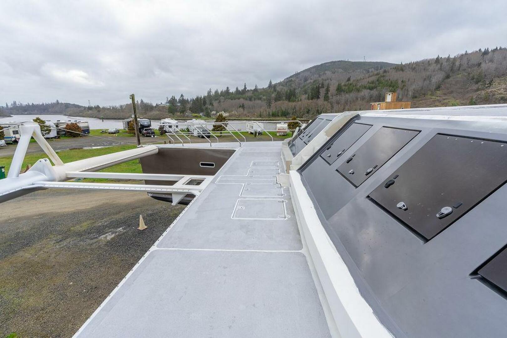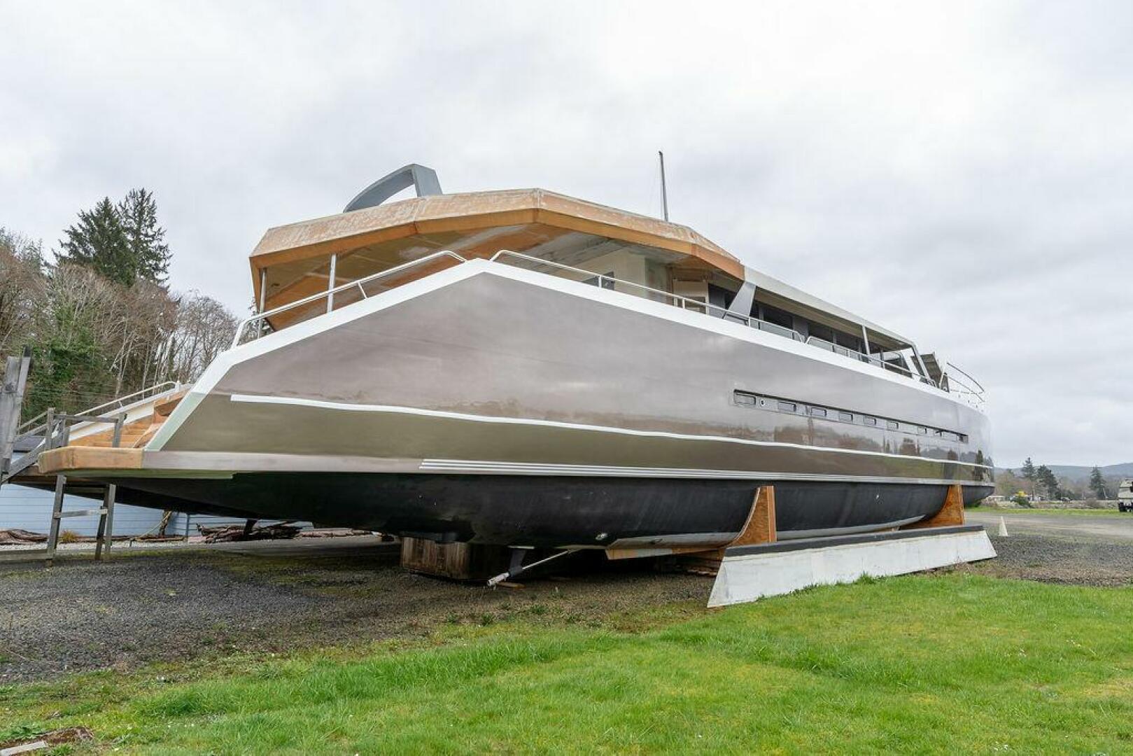 " We are continuing the build, and she is in the final fairing for painting. Forebeam has been installed and the drop-down beaching ladder which will allow the front bow net to be ordered. The aft deck shower and bathroom being completed while the aft deck bar or lounging area has not been started yet, that whole layout will be up to the new owner. Forward crew quarters are about finished as seen in photos. Engines are installed (Twin 315 HP Yanmar diesel), watermaker is here, 1800 GPD, more than a gallon per minute when running. Heat and A/C will be water chiller type systems as well as conventional heat pump type. The radar arch will also handle an awning for the upper aft deck lounging. The draft is about 5' with keel, rudders (Carbon fiber posts) and props (full feathering and adjustable pitch) also hang down. The planned colors are metallic 2 stage PPG paint, dark grey around windows, bronze hulls and light Gold Champagne topsides, all with clear coat."