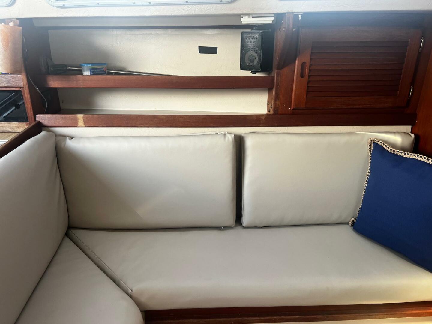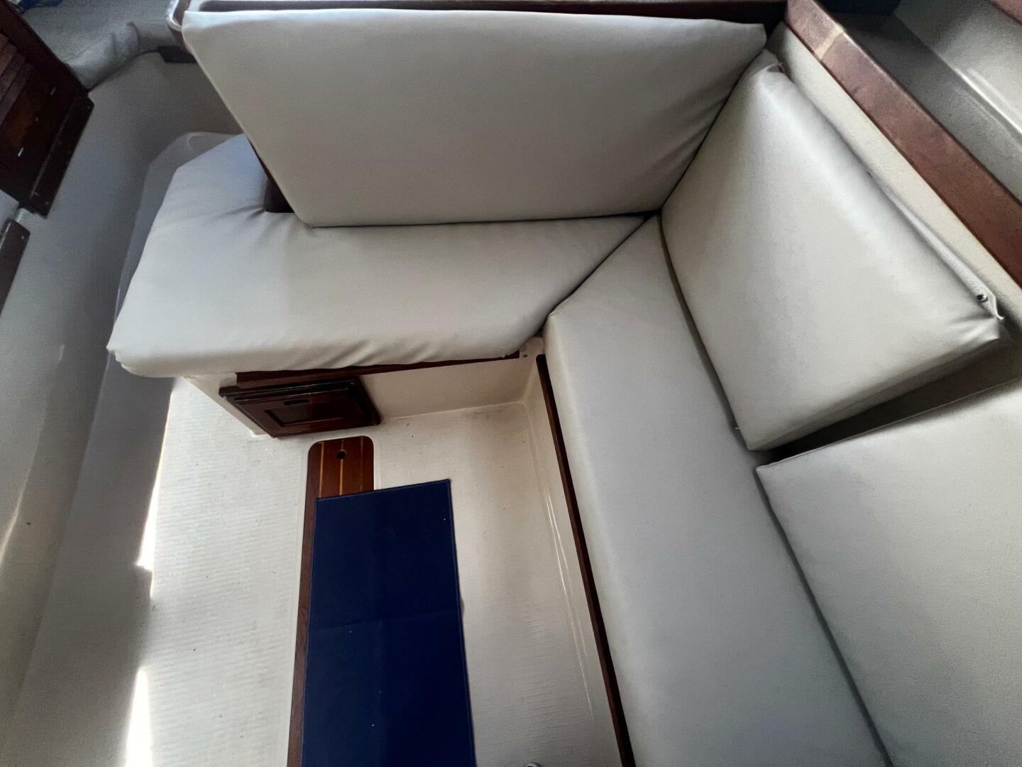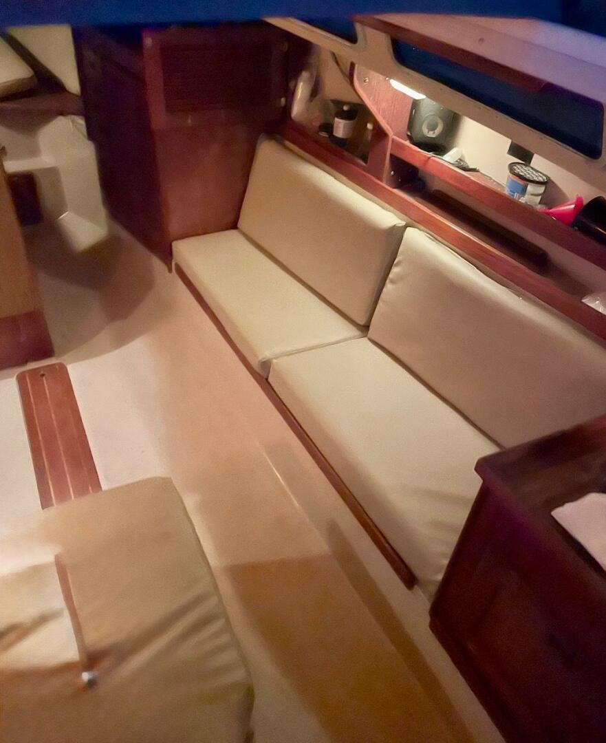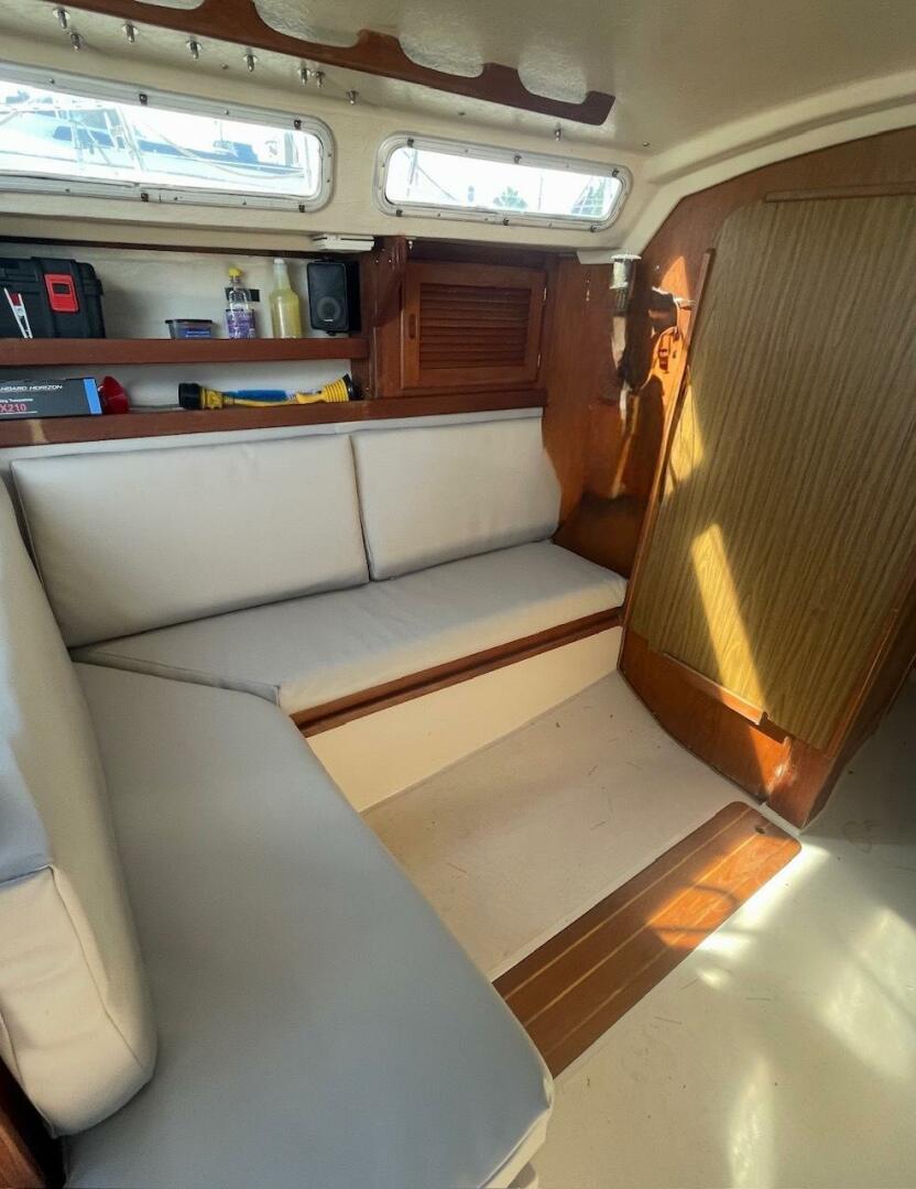 Storage is found behind and beneath the settees. There is storage above and outboard of each settee. The nav station is located all the way aft to starboard, across from the fully equipped, U-shaped galley.