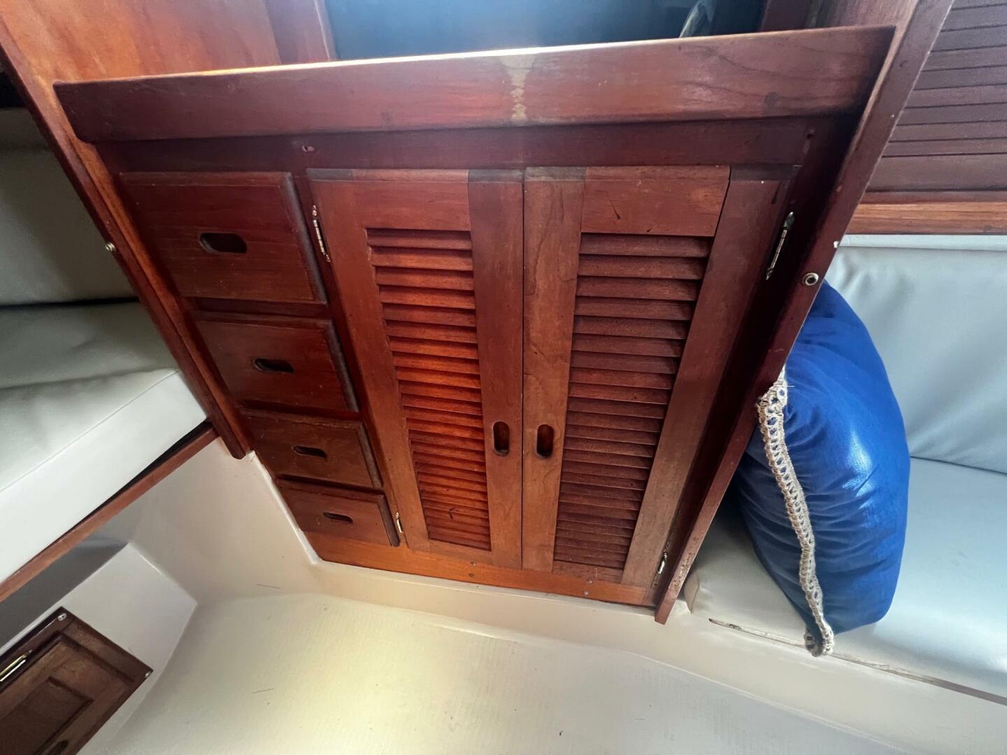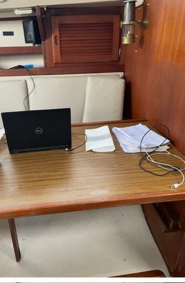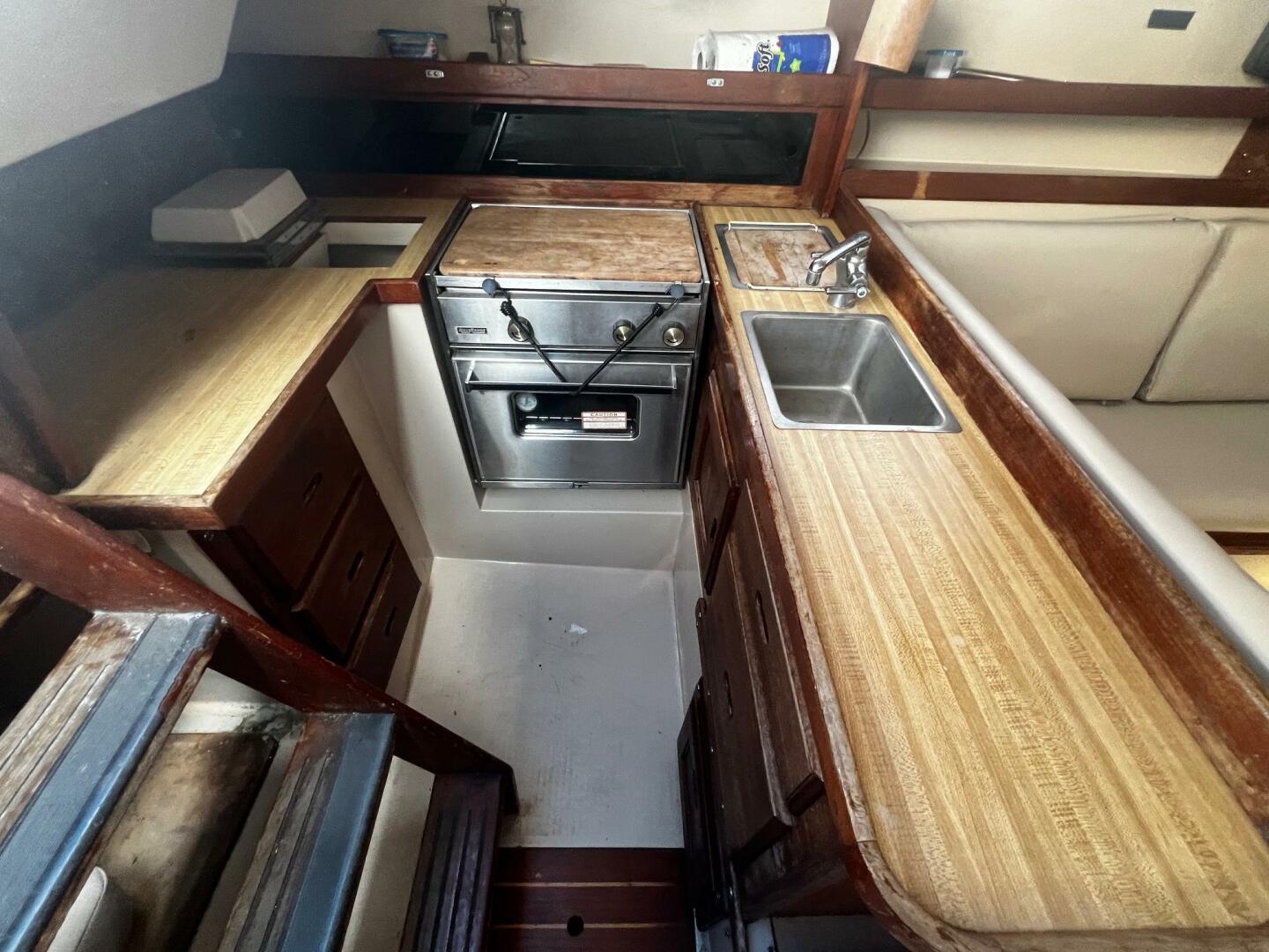 Storage is found behind and beneath the settees. There is storage above and outboard of each settee. The nav station is located all the way aft to starboard, across from the fully equipped, U-shaped galley.
