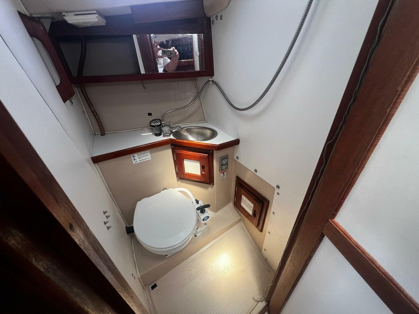 The roomy head is located just aft of the forward V-berth cabin on the port side. It is easily accessible from both the master cabin and the main salon. There is storage below the sink and in a sliding medicine locker above the sink. An overhead hatch provides excellent ventilation.