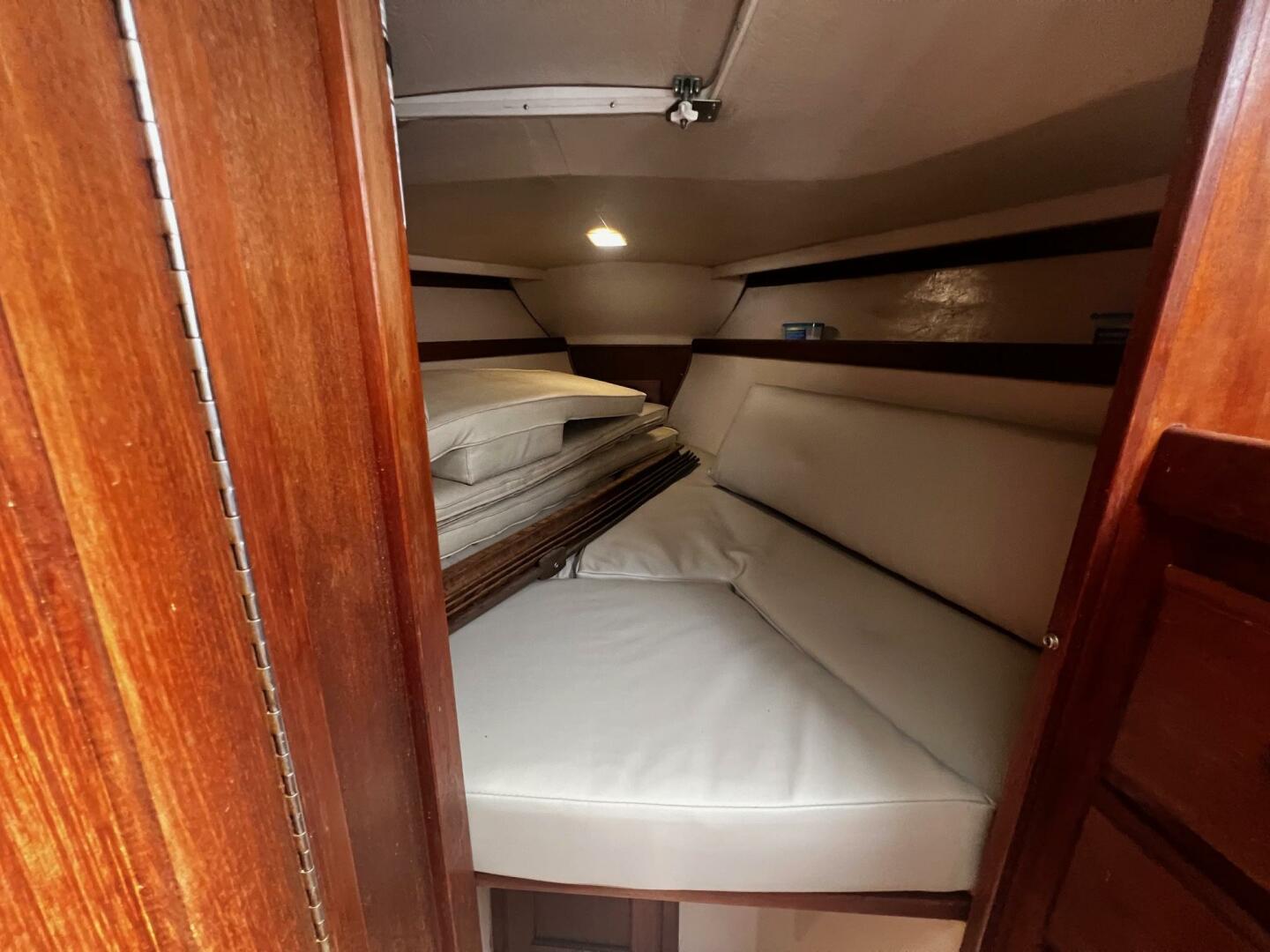 The master cabin is in the forepeak and has a large V-berth. Its main storage area is the chest-of-drawers and hanging locker in the passageway. Natural light and ventilation are provided overhead by an opening hatch.