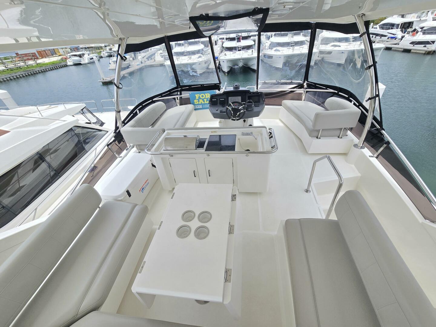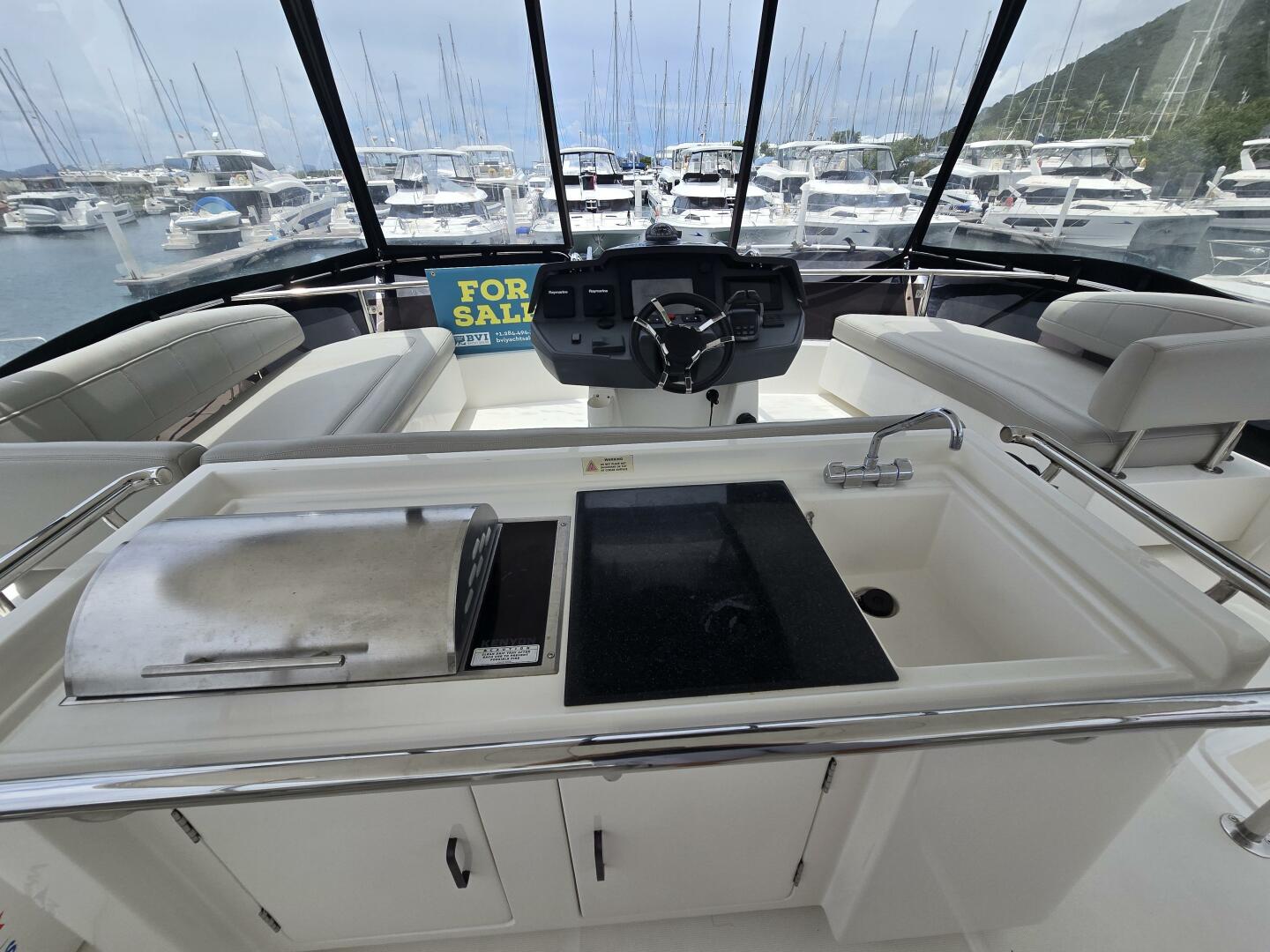 - Expansive flybridge with: Wet bar, Electric BBQ, Canvas & Lexan windscreen at helm