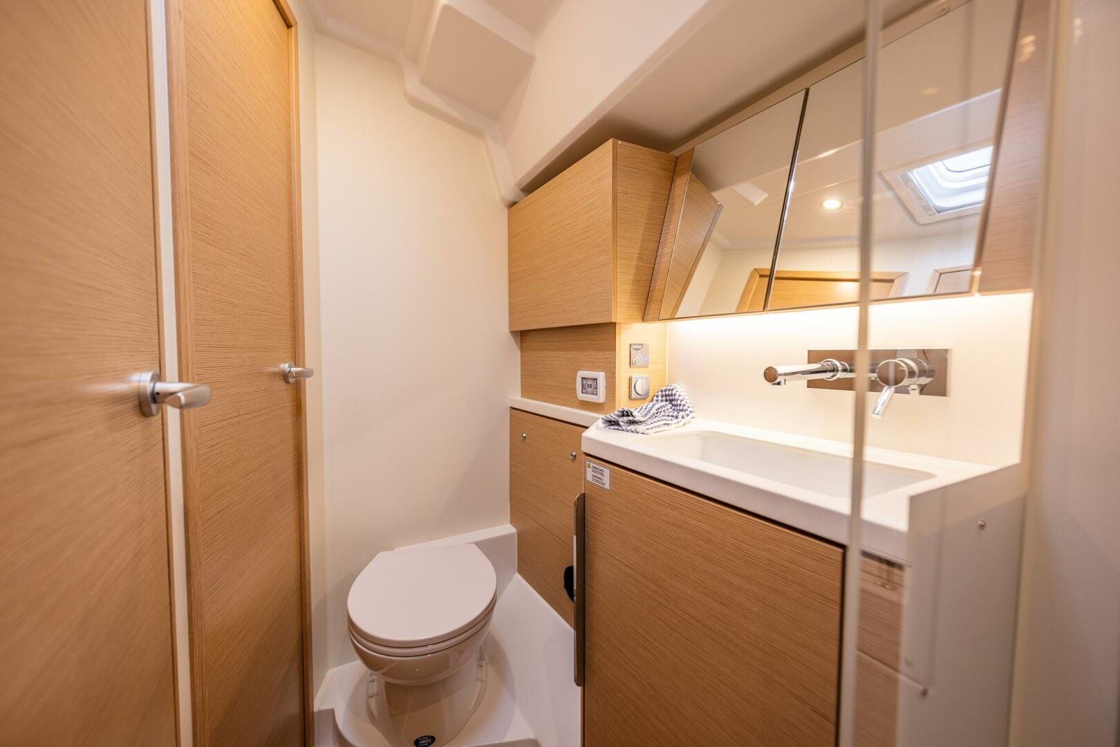 - Head with shower on port - with day head door access. Wet head on starboard. electric flush toilets