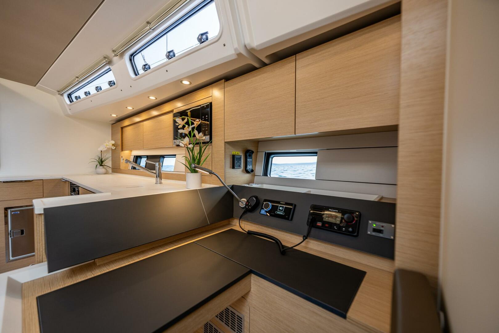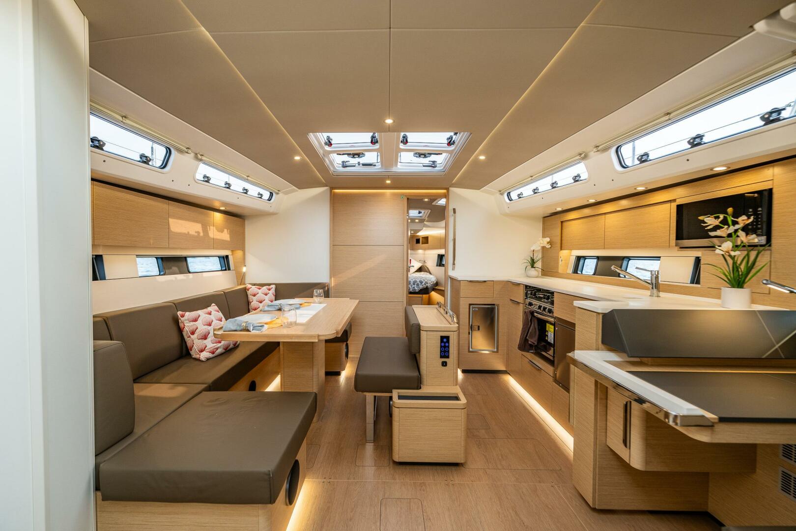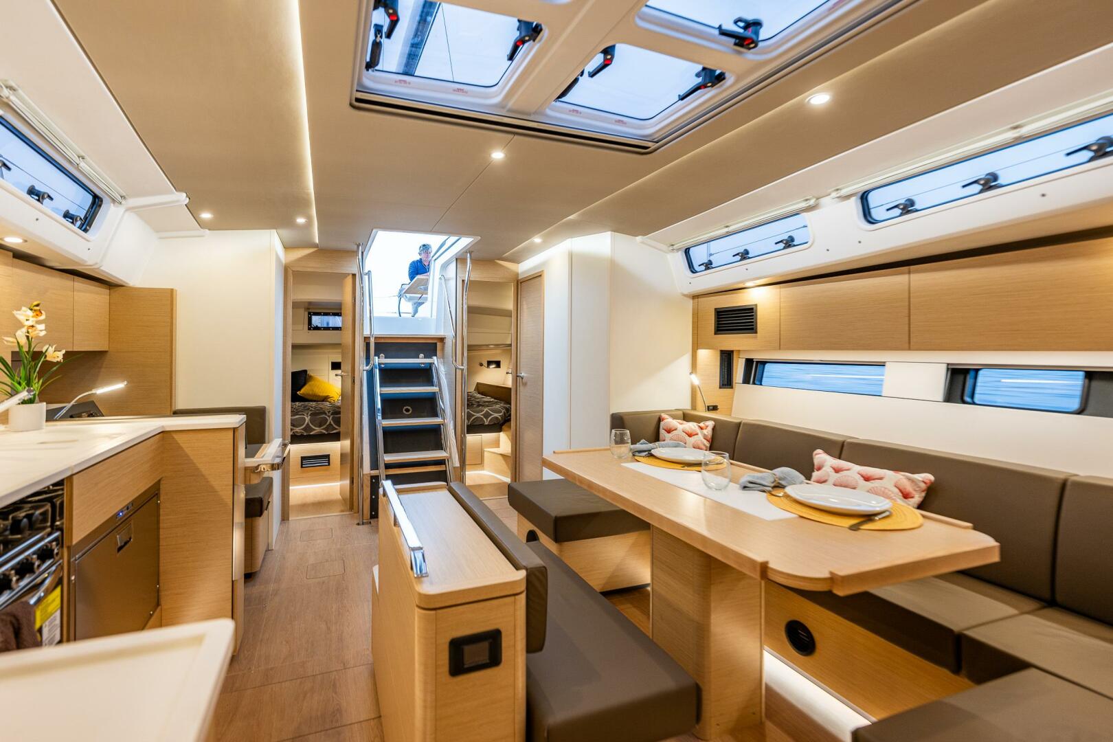 - Saloon with full functional U-galley and chart table on starboard and dining area with bar on port