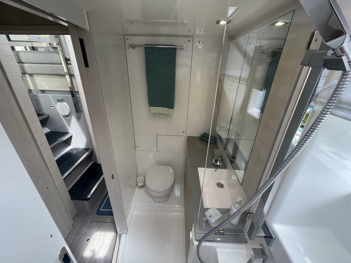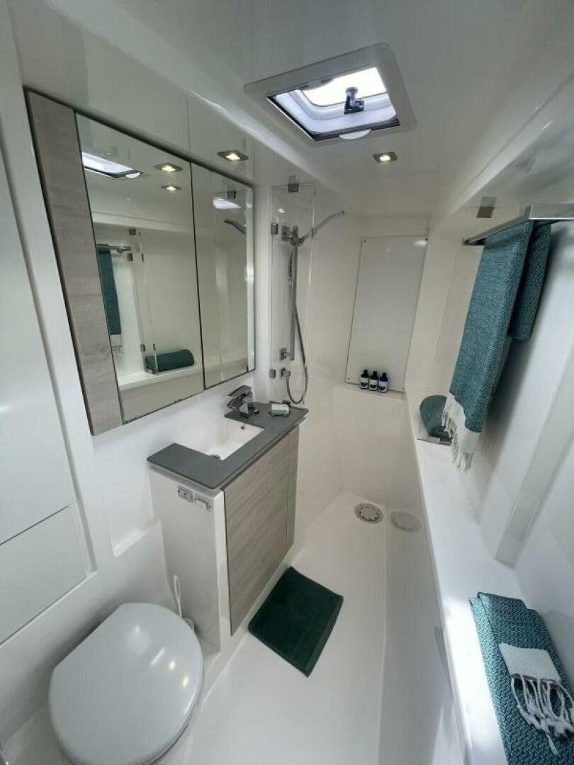 - Port forepeak crew berth and head incl. light, fan, large bowl electric toilet, holding tank, shower sump with electric pump, hand basin c/w combination faucet/shower mixer and outlet socket with USBs and A/C