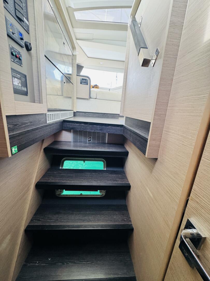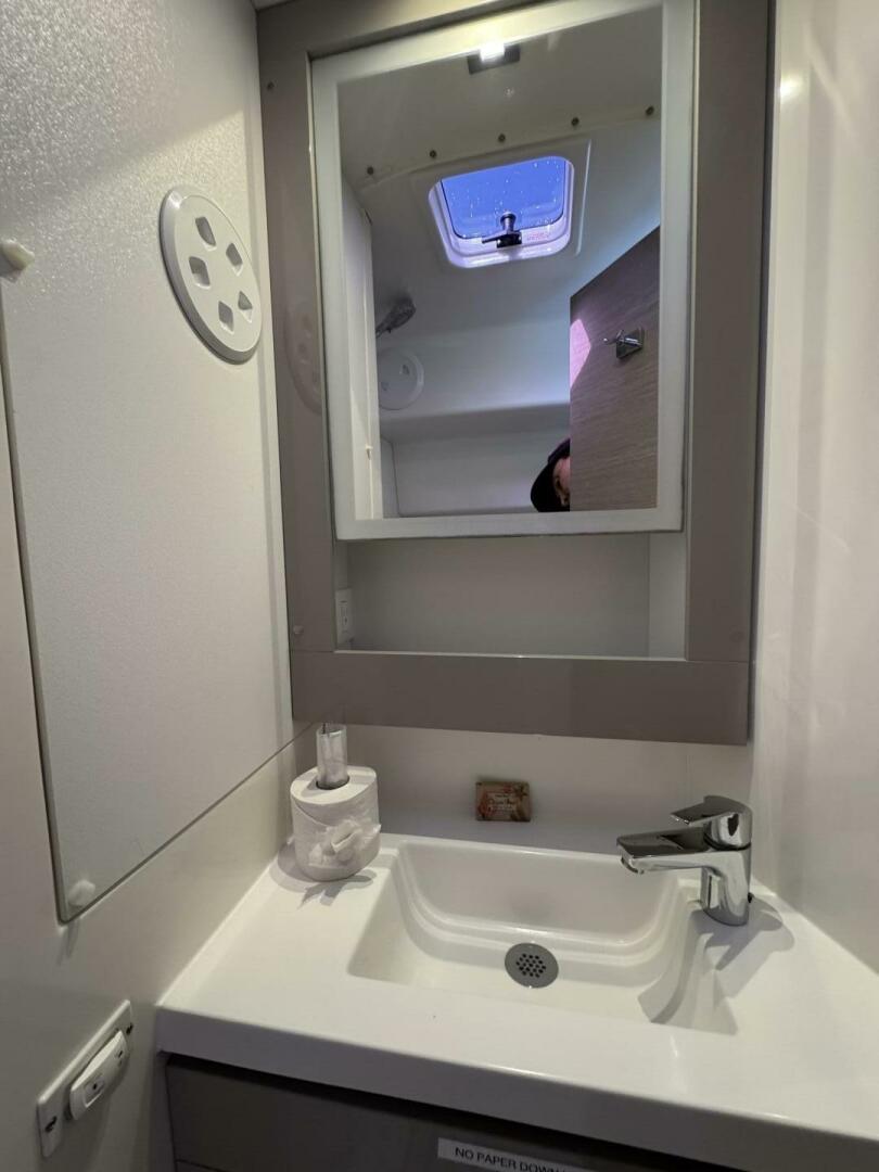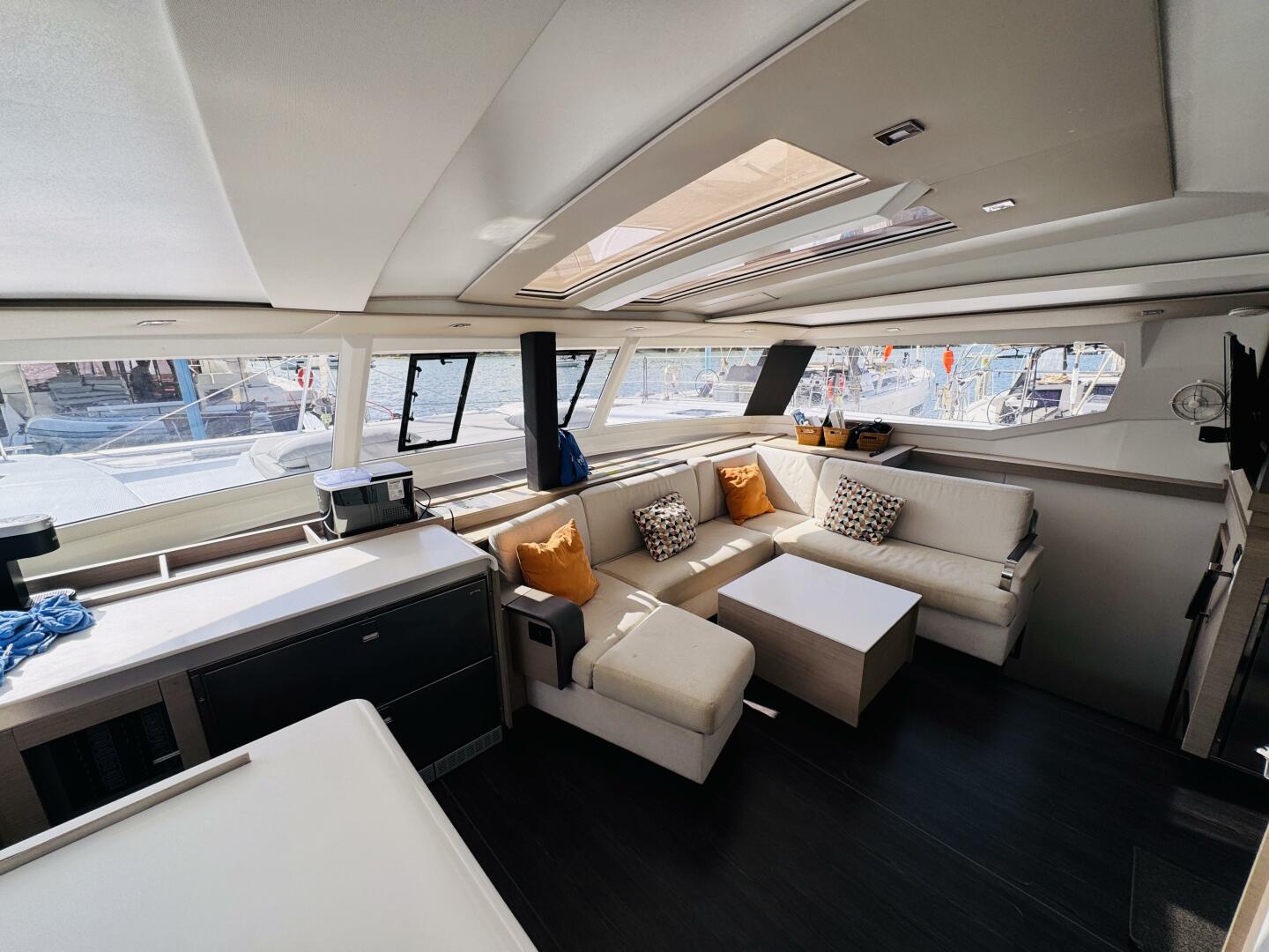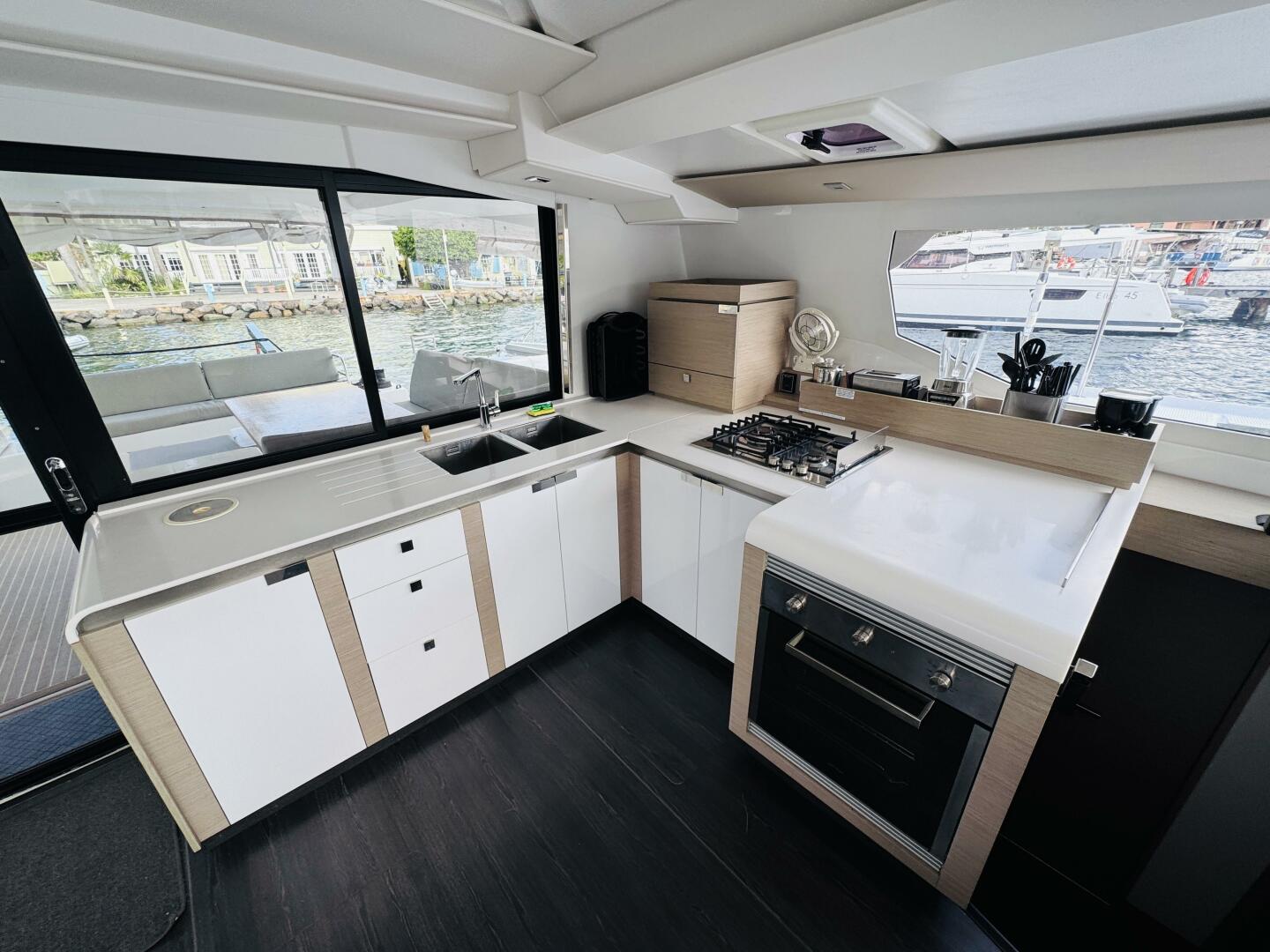 Inside, the saloon is a sun-drenched haven, with panoramic views and seamless indoor-outdoor flow thanks to wide sliding glass doors connecting the cockpit and interior. The U-shaped galley is a chef’s dream, boasting abundant counter space and over 1,400 liters of storage—perfect for gourmet meal prep or provisioning for longer passages. A comfortable lounge area and a fully equipped navigation station round out the saloon, offering everything needed for life on board.