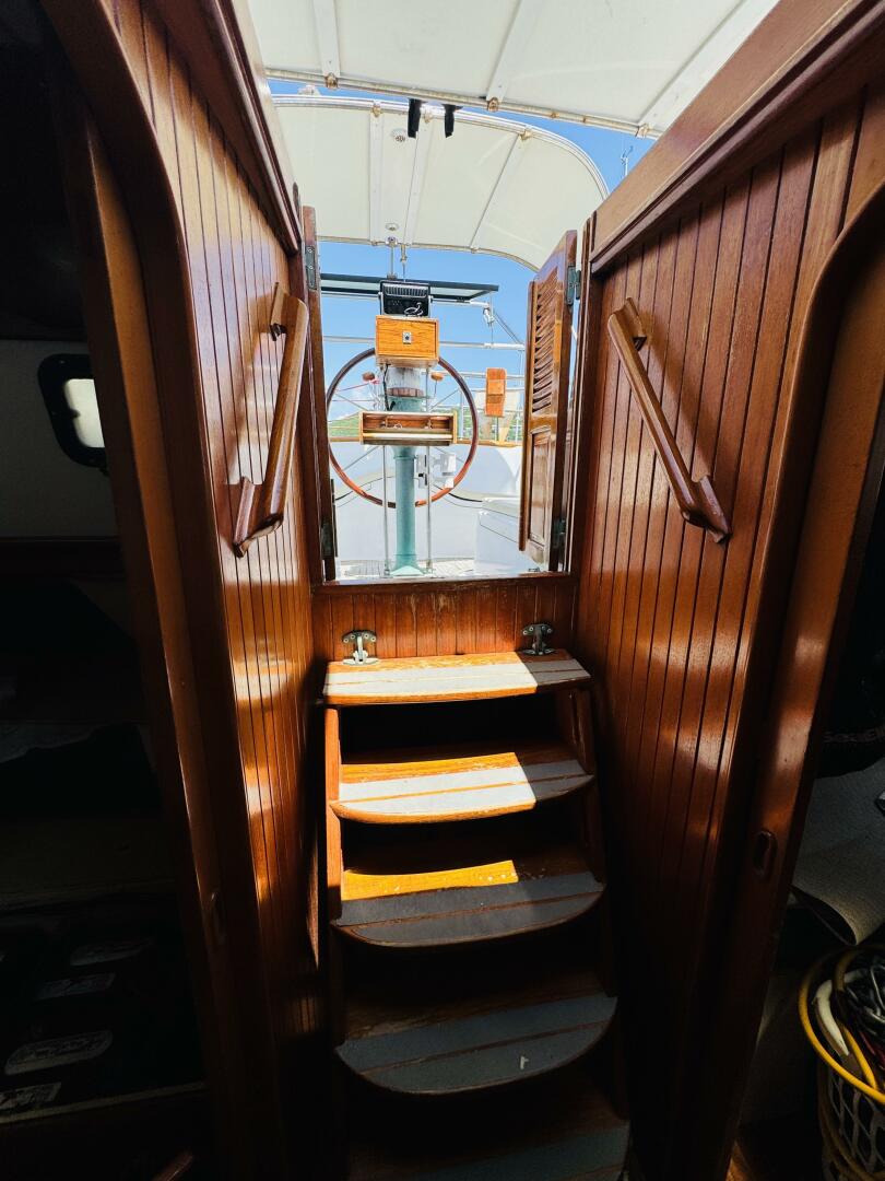 The interior of the Christina 43 reflects the craftsmanship Hans Christian Yachts is known for, with rich teak joinery and thoughtful layouts designed for comfort at sea. Most versions include two to three cabins, a forward Pullman berth, and an aft stateroom, often with one or two heads and enclosed showers. The salon is spacious and typically features a large dinette and cozy seating areas. The galley, usually arranged in a U-shape, provides generous storage, deep sinks, and modern amenities, supporting life aboard during extended voyages.