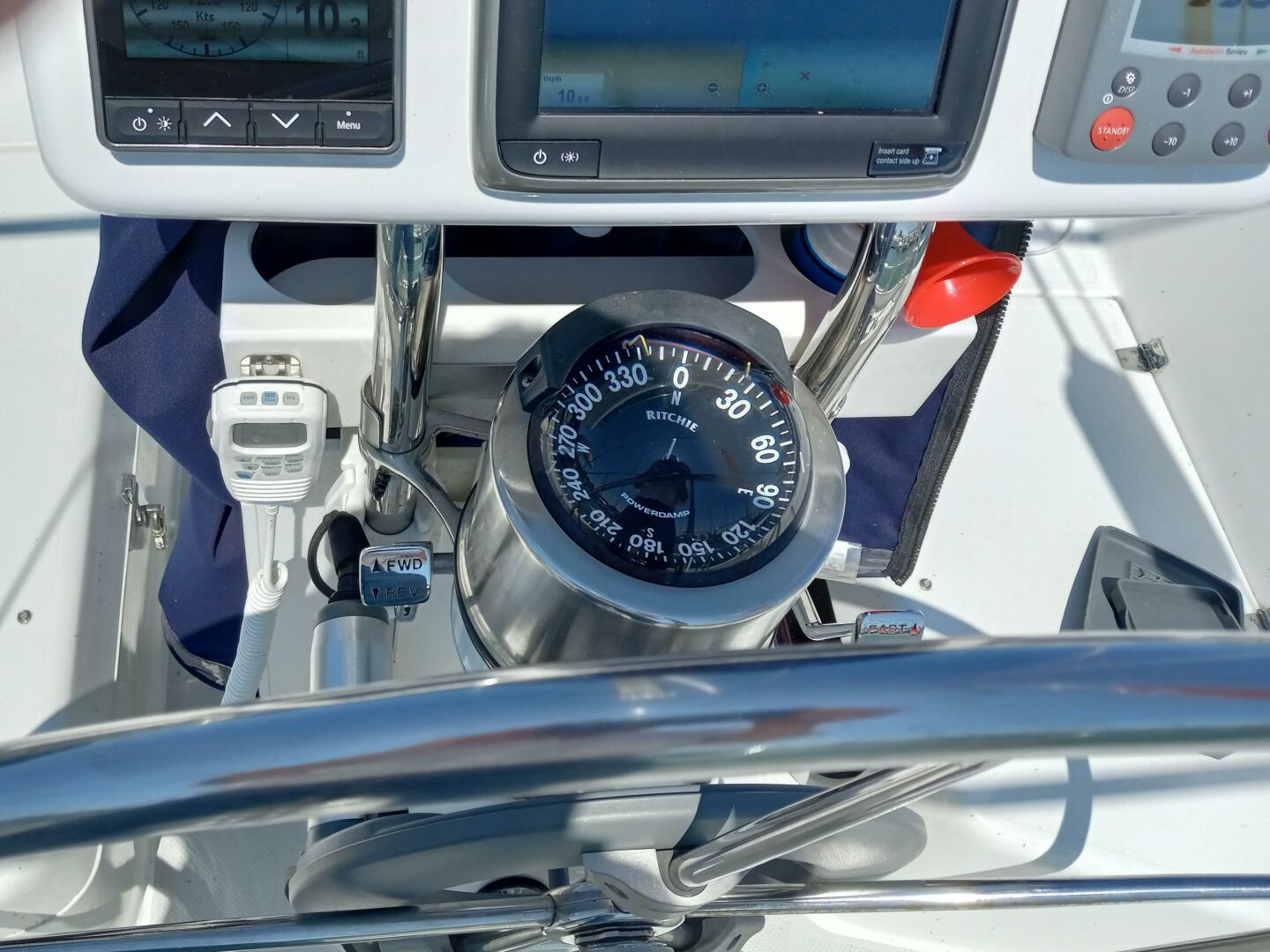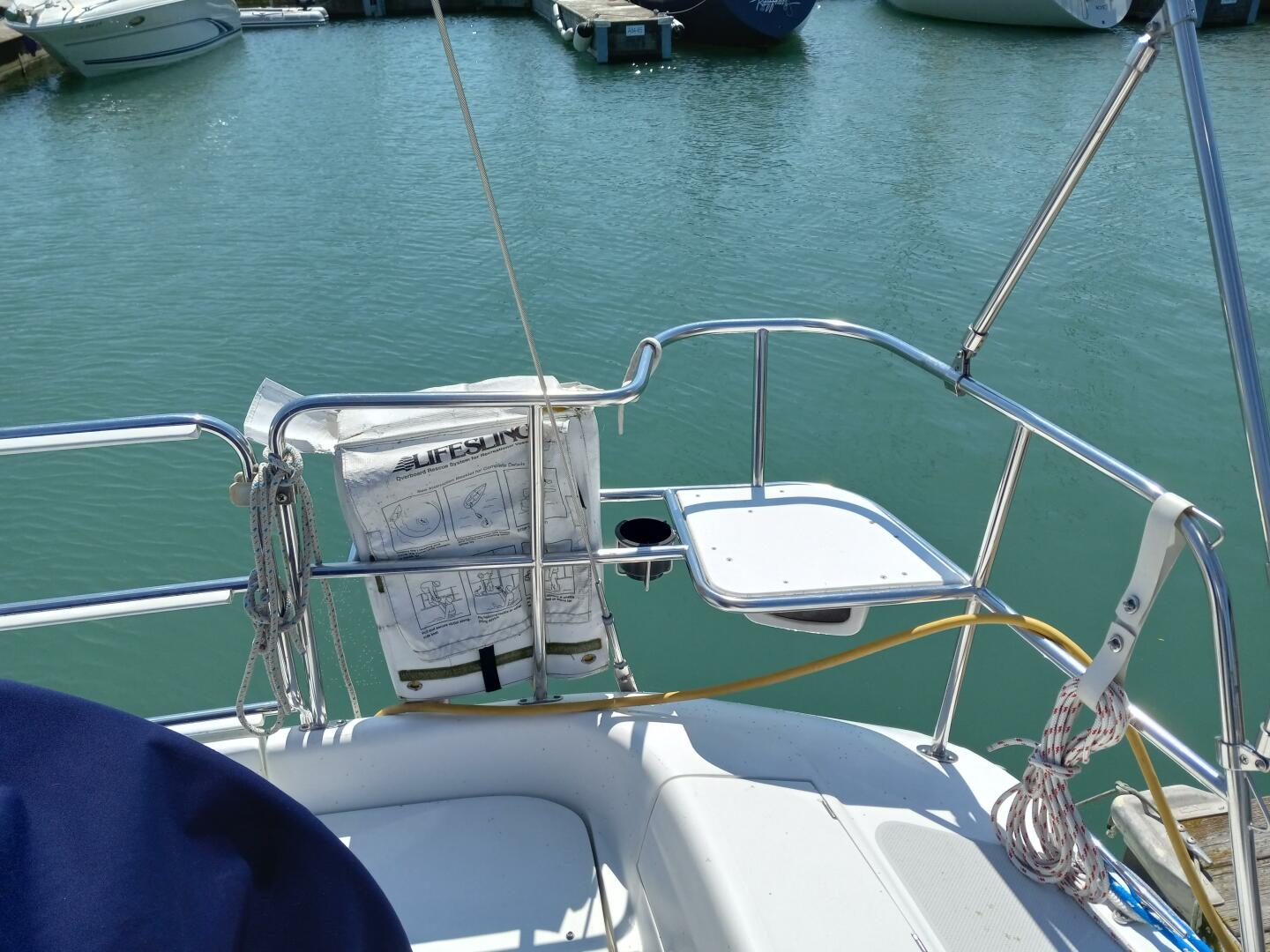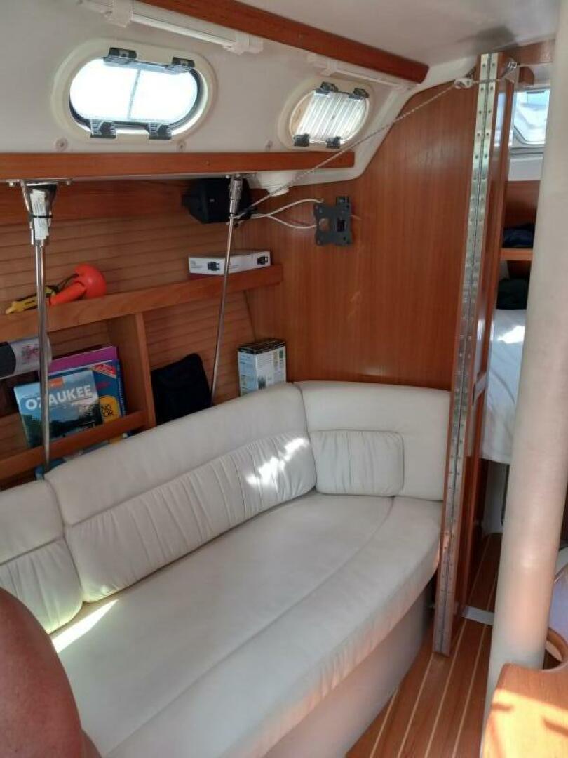 Step into the spacious cockpit which is easy to move around while sail trimming. The cockpit is also comfortable to enjoy relaxing with friends and family. The Catalina stern rails seats (with cup holders and cushions) won't stick into your back. Ample storage lockers in the seating leaves even more room for life jackets, boat hooks and all seat cushions. (white with grey piping matches deck) The lockers below will handle a week's worth of warm clothing and cocktail dresses:)
