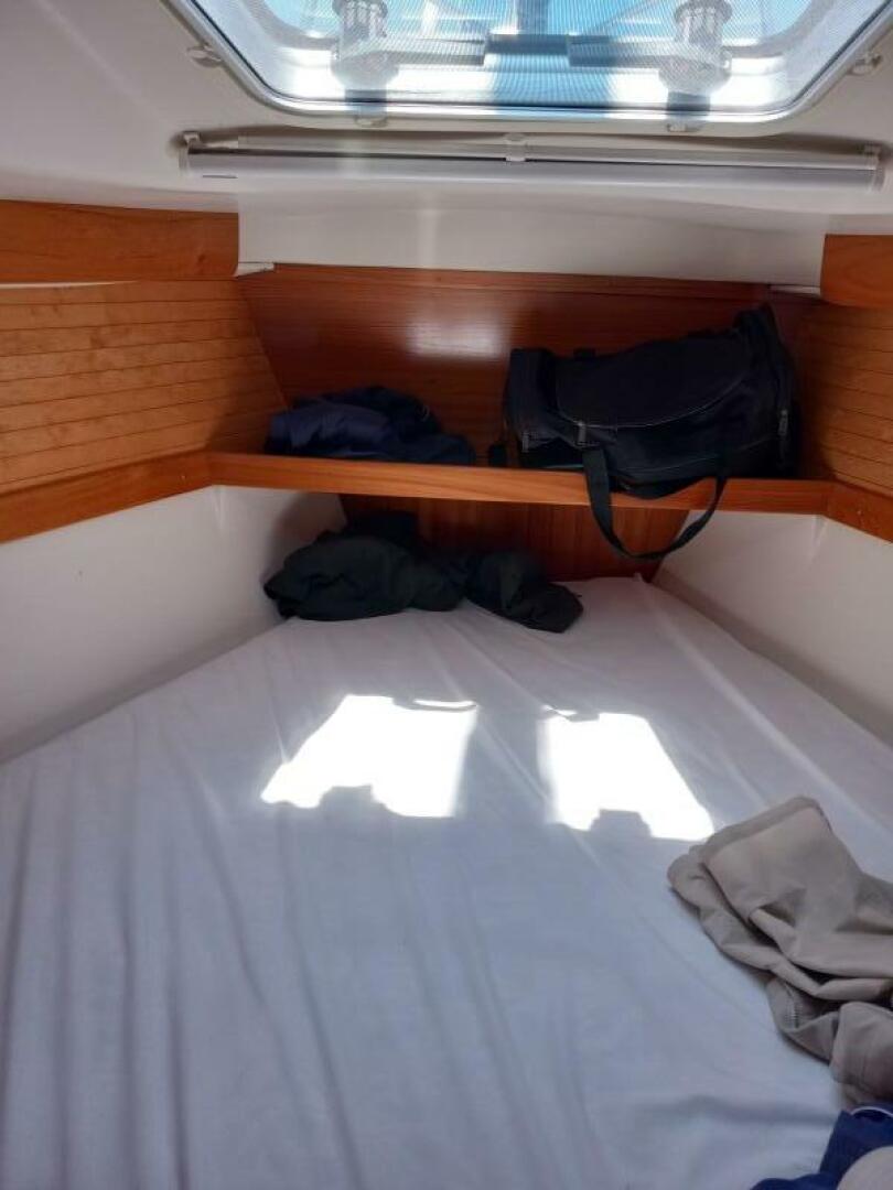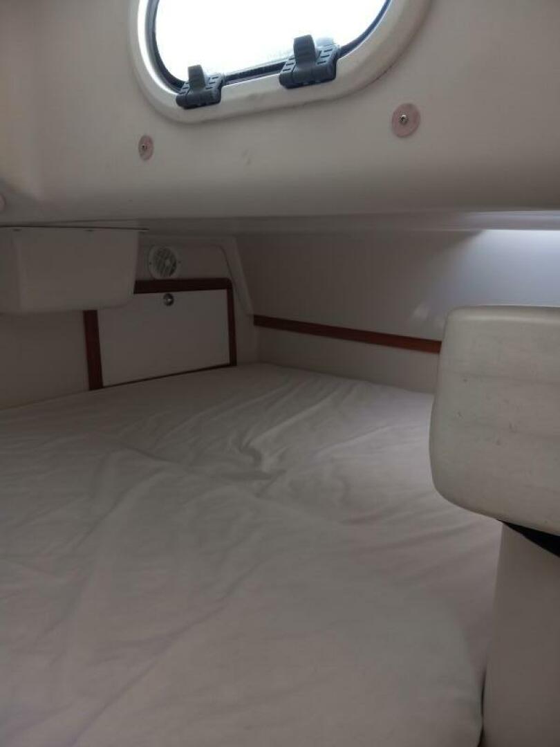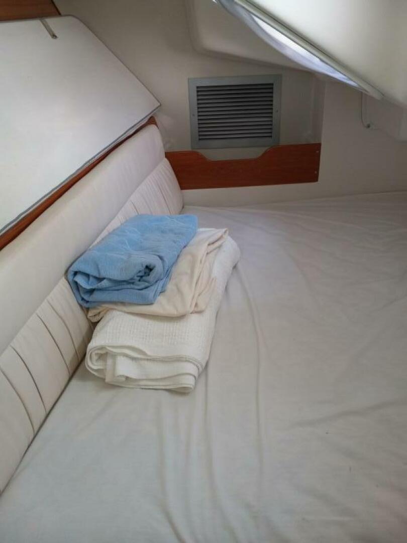 "LIBERTY TOO" has a very large two lid refrigerator, nice countertop access storage and multiple drop front cabinets. The saloon comfortably sits four at the table and other guests on the port settee. The head is aft and the master stateroom is amazingly spacious with queen berth and standing headroom (before crawling into slumber:) . A vee berth that sleeps two is forward and door closes for privacy.