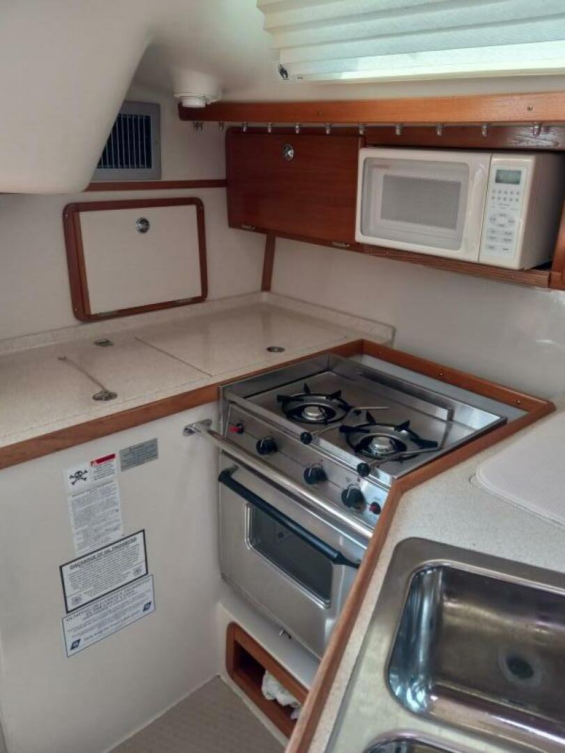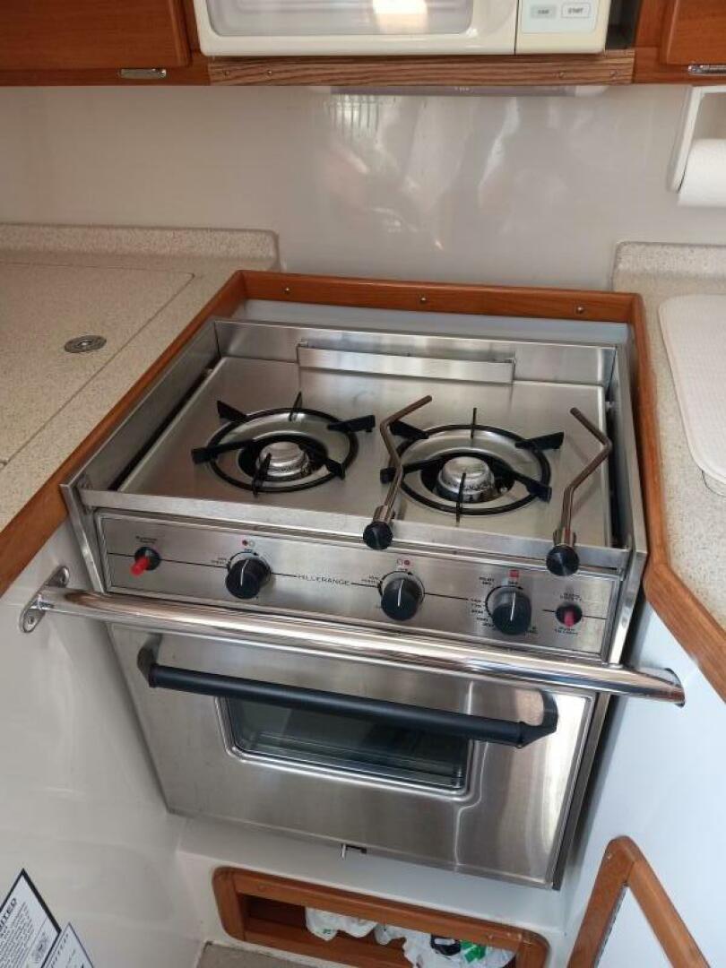 The galley is located to port with deep double sinks, a full range, gimbaled two burner stove with oven is easy to ignite plus, and a newer microwave makes cooking on board a breeze.