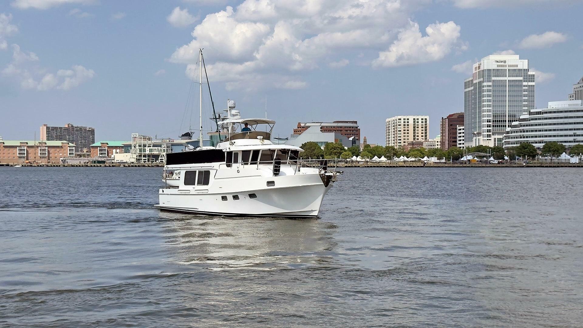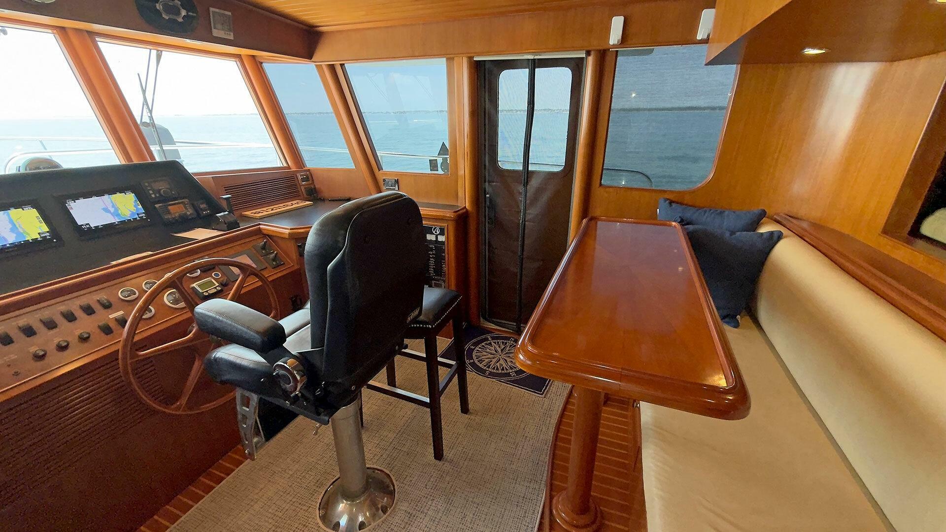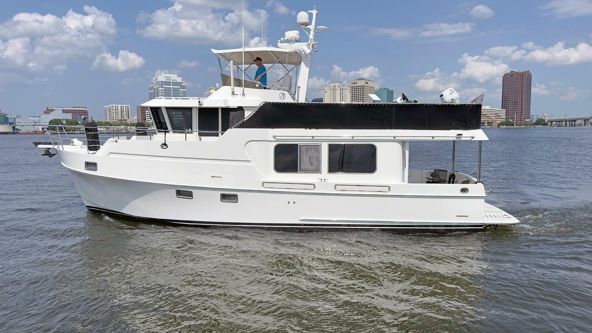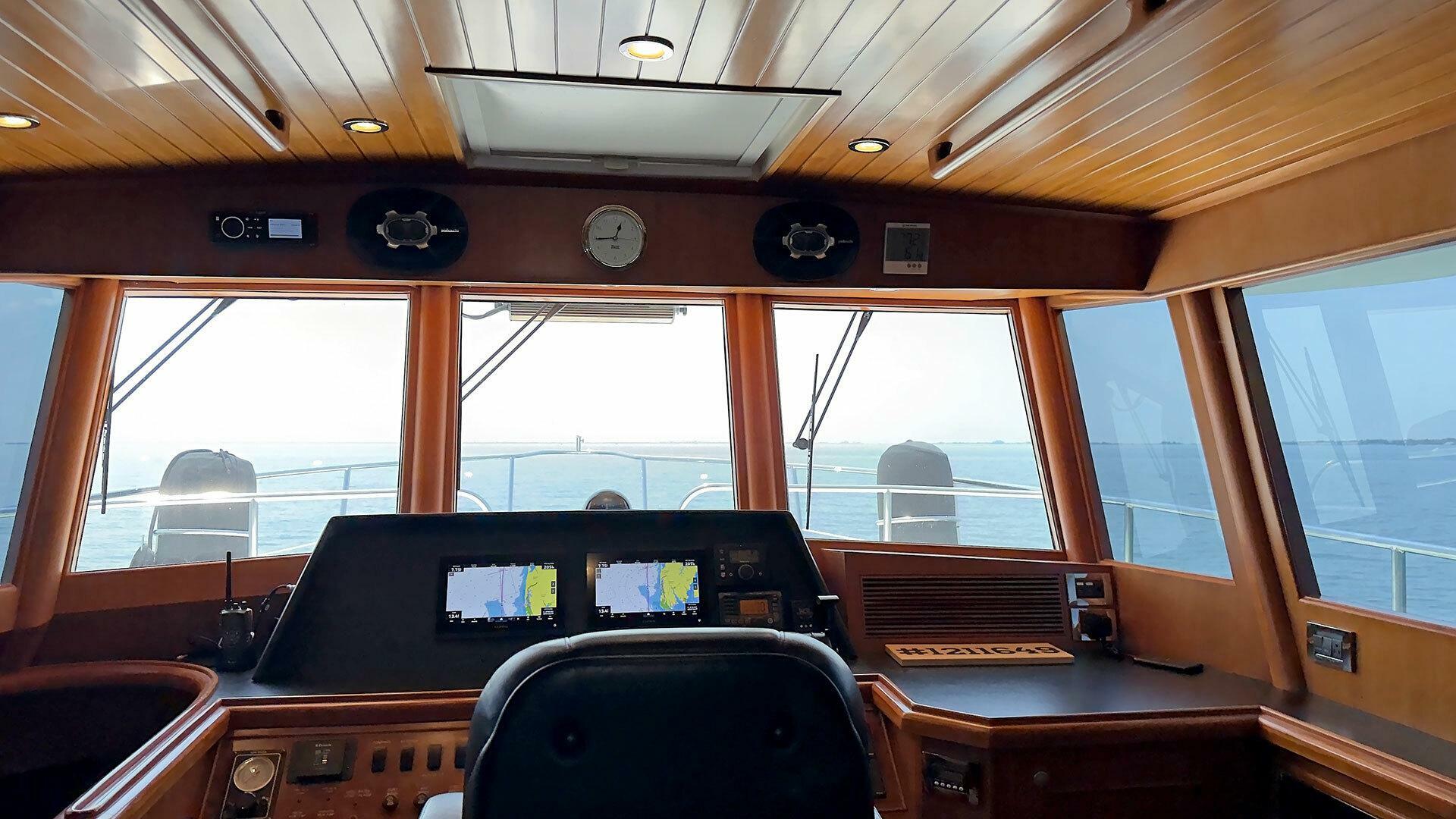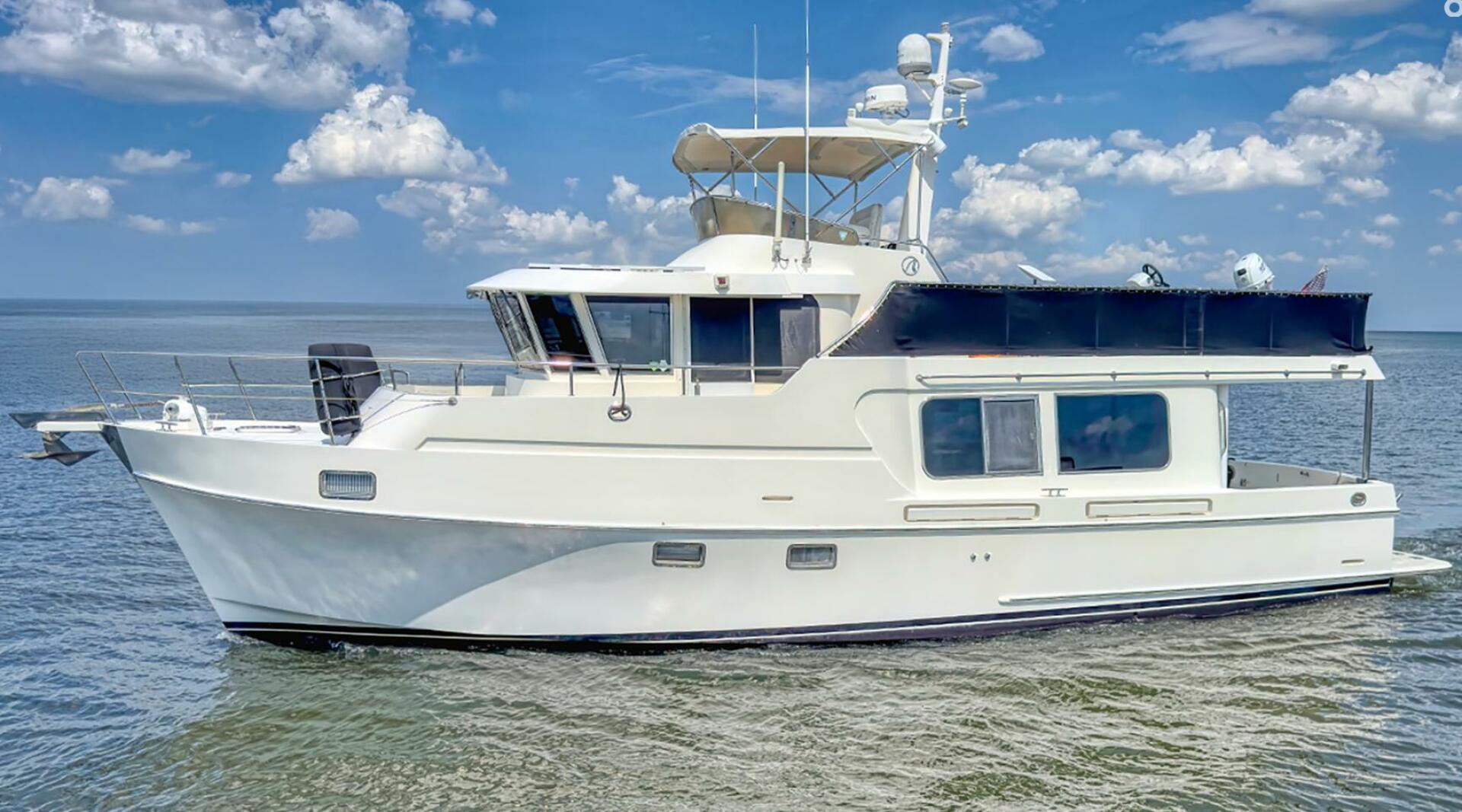Looking for a fuel-efficient coastal cruising trawler that can head straight to the Bahamas or do the Great Loop? Lightning is a 2007 Ocean Alexander 50 Classicco powered by a 300 HP John Deere 6068 enjoying a smooth ride underway courtesy of her Key Power active fins stabilizers.