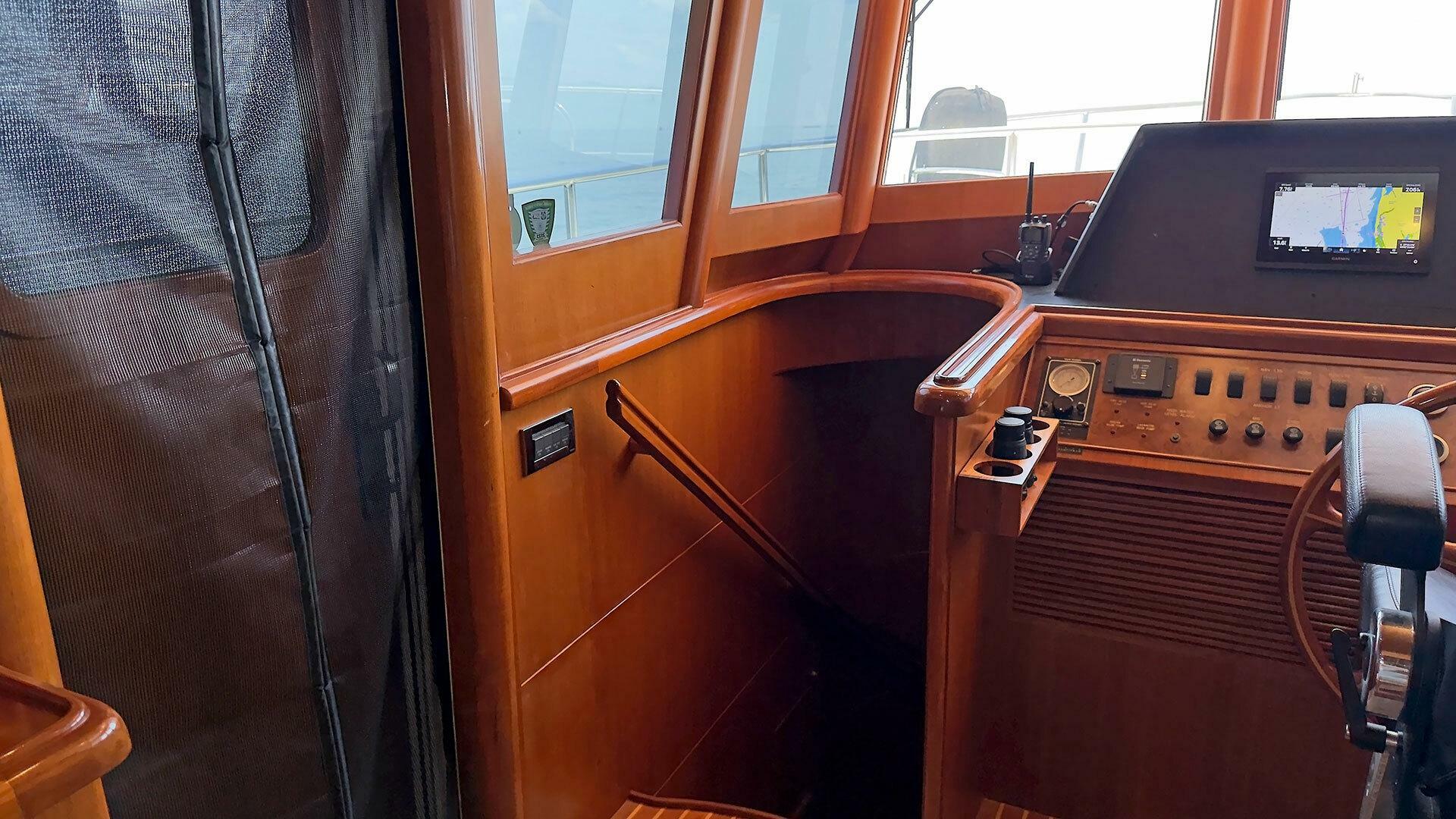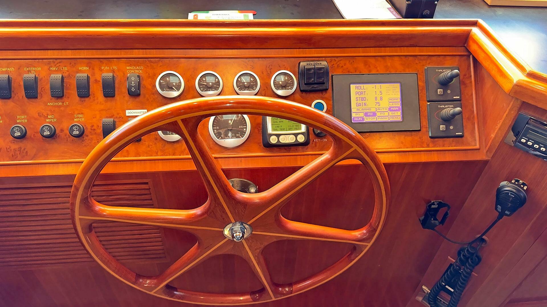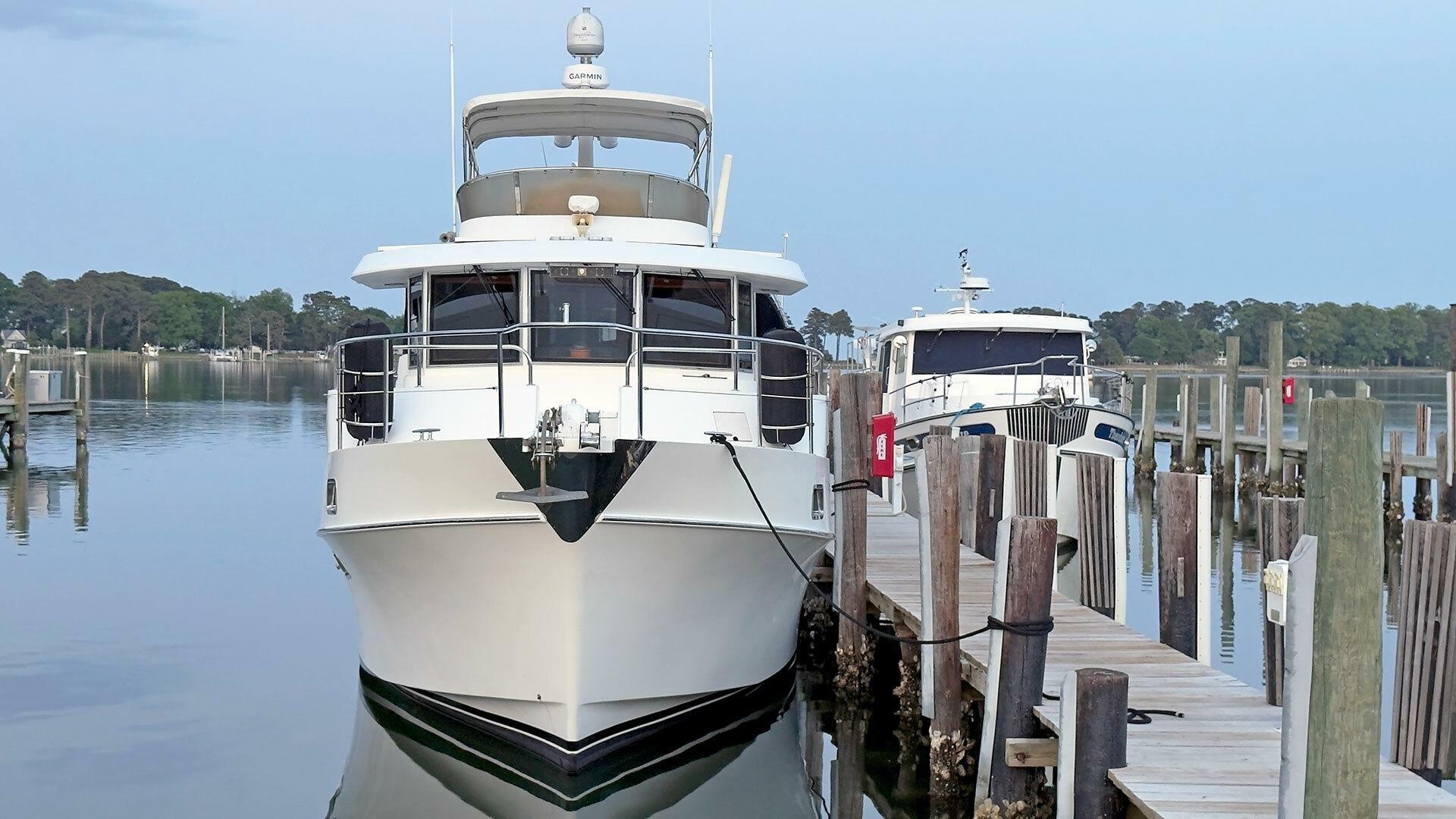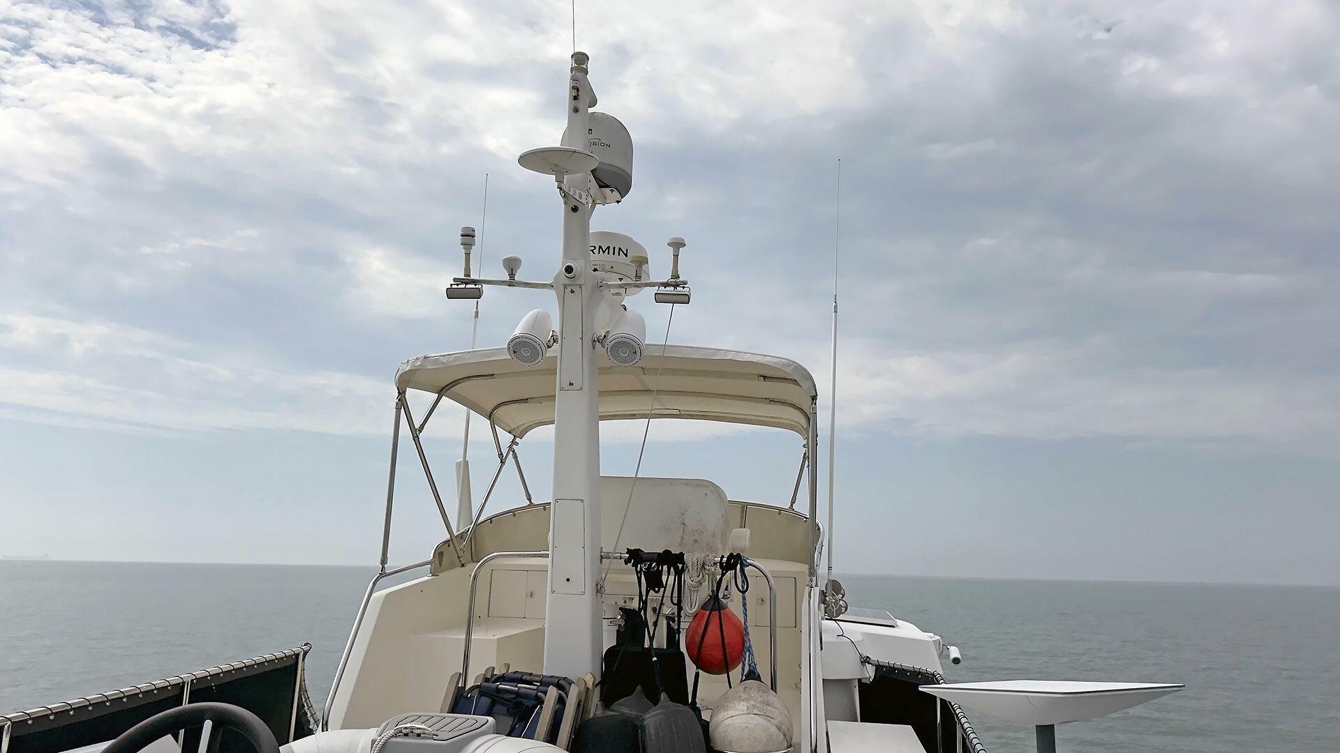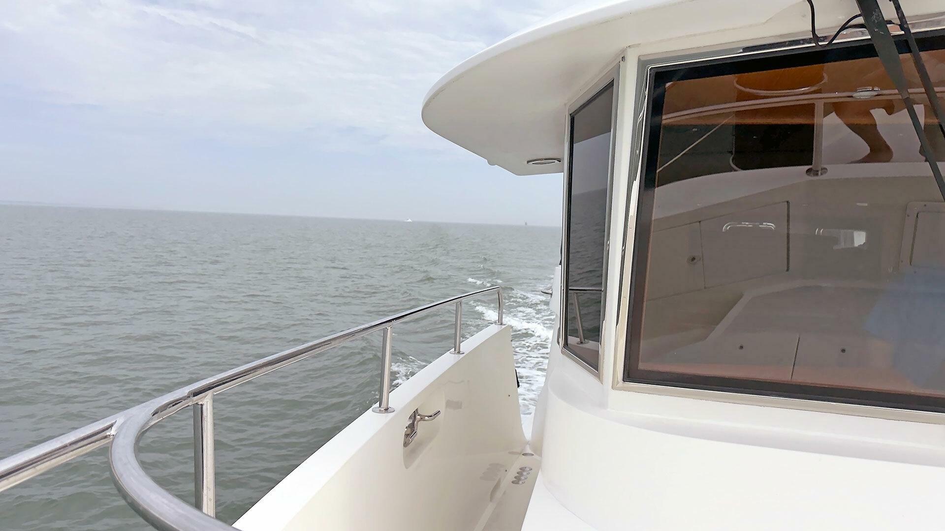 Looking for a fuel-efficient coastal cruising trawler that can head straight to the Bahamas or do the Great Loop? Lightning is a 2007 Ocean Alexander 50 Classicco powered by a 300 HP John Deere 6068 enjoying a smooth ride underway courtesy of her Key Power active fins stabilizers.