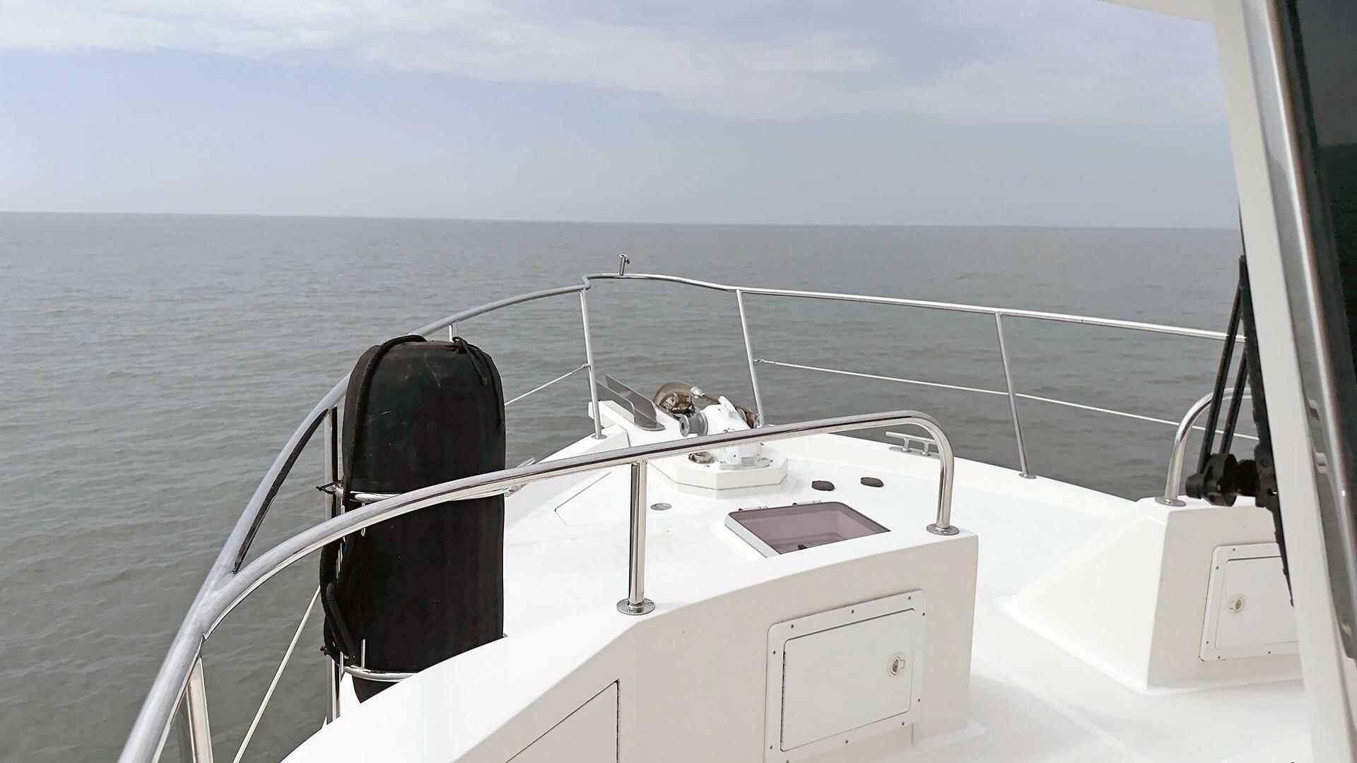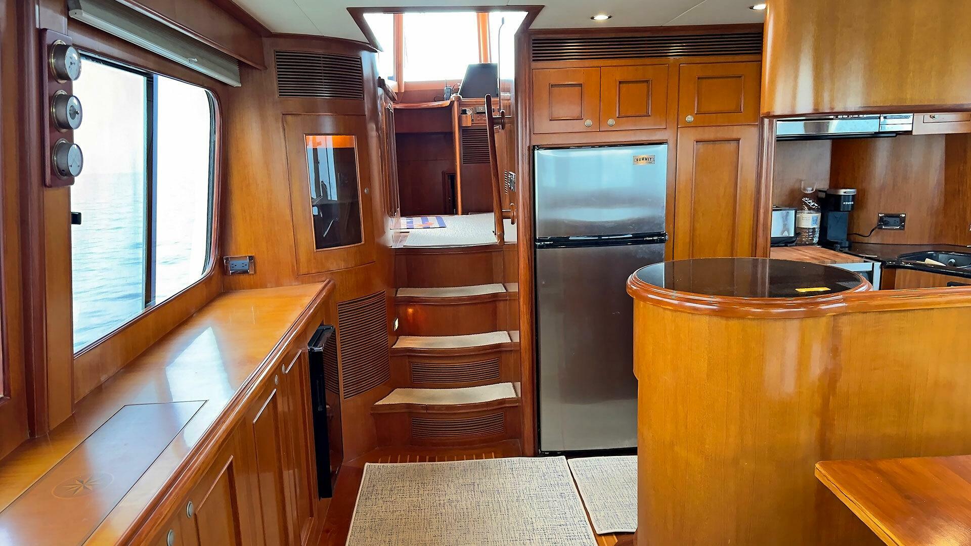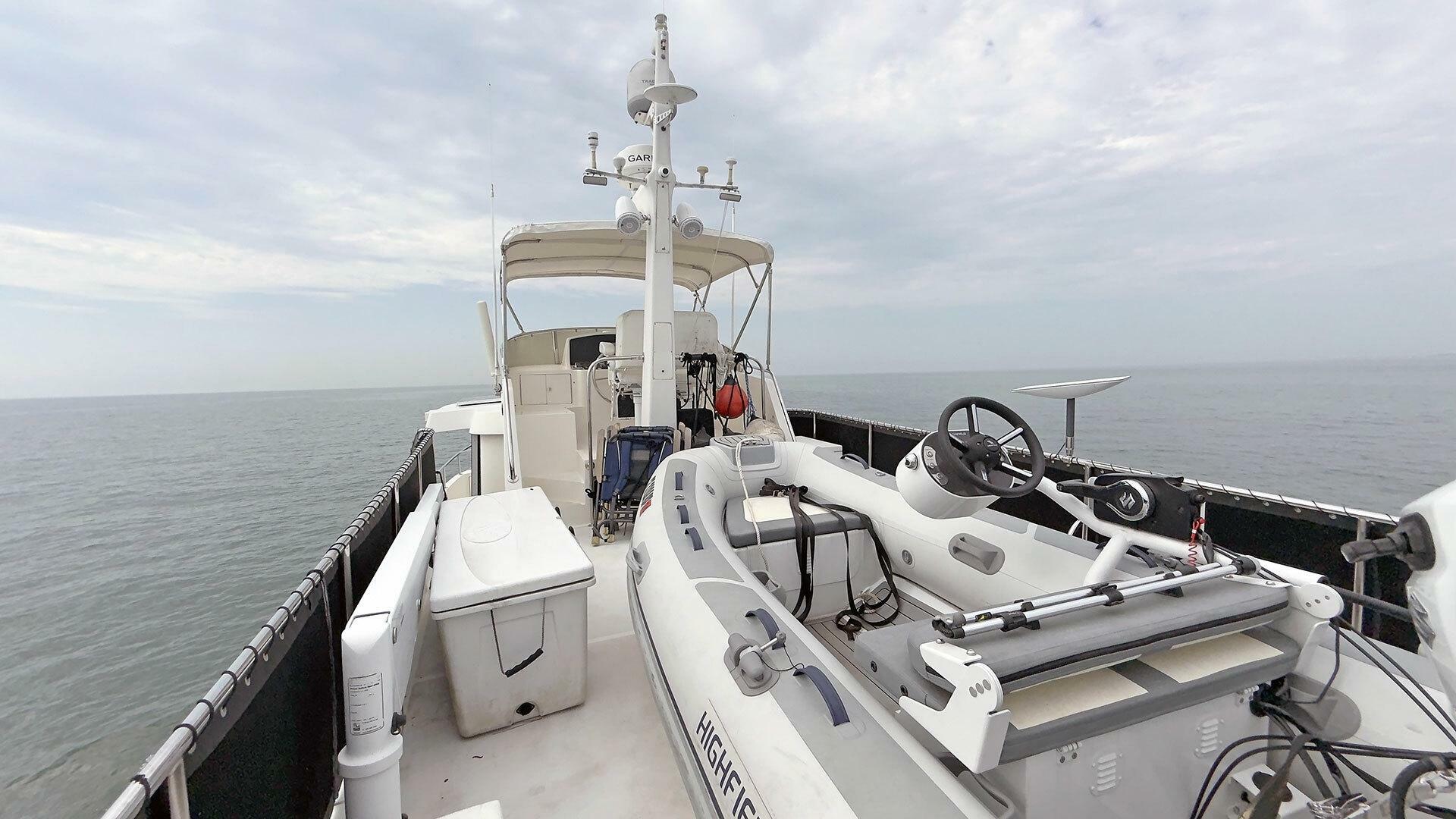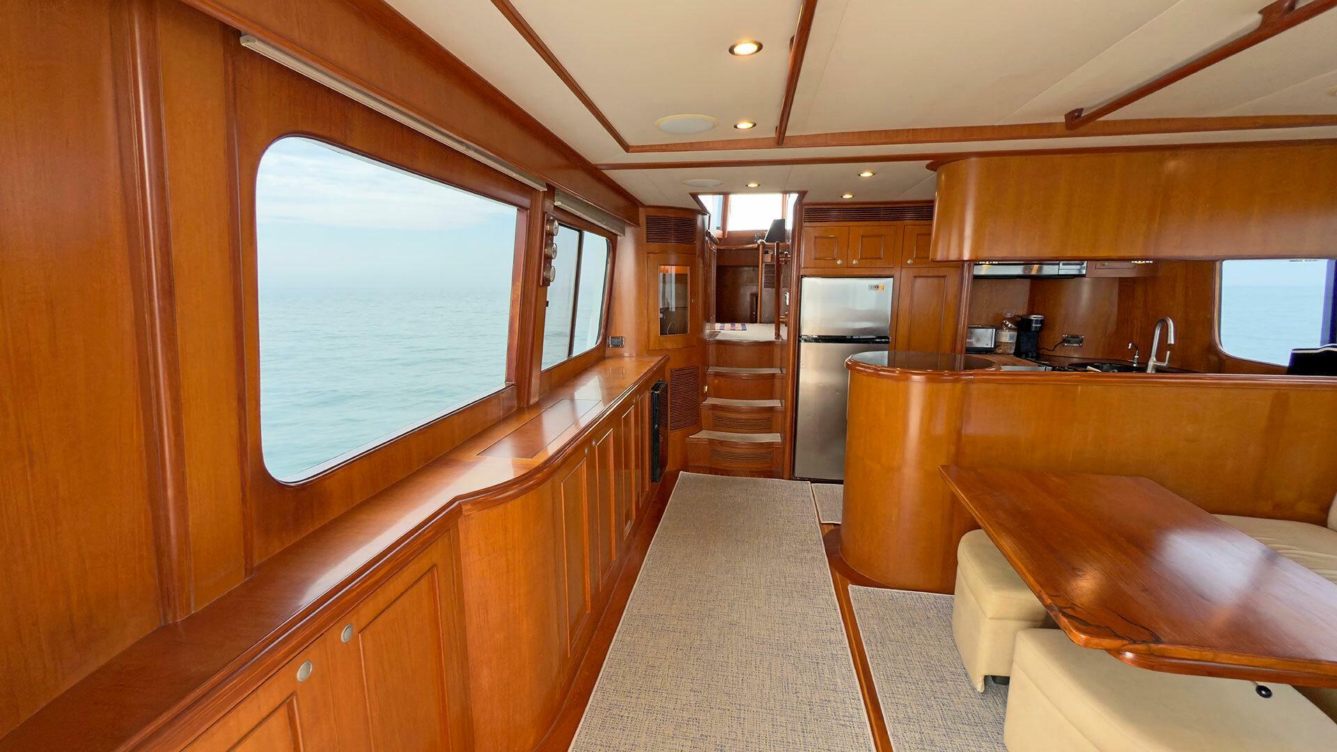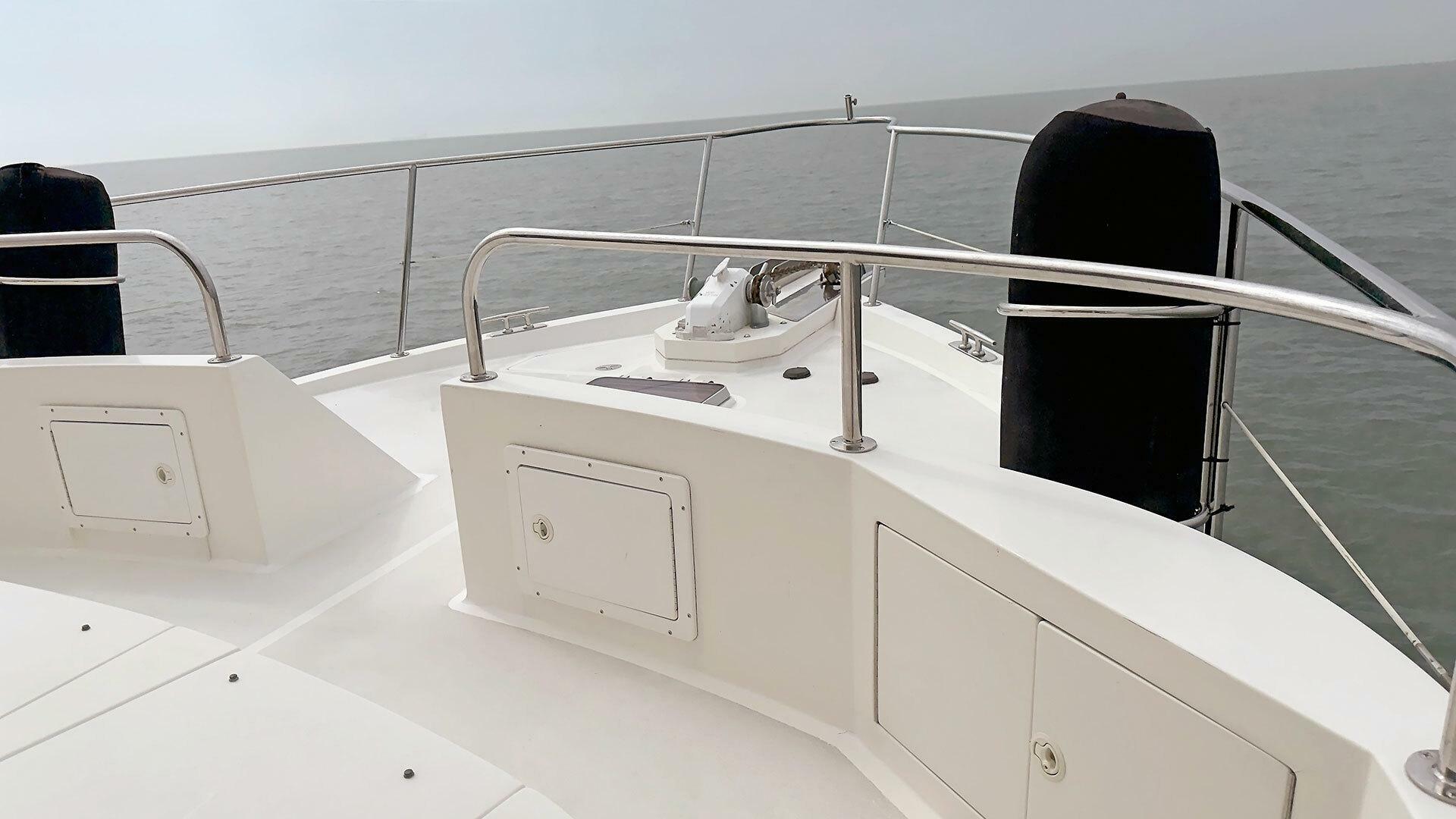 Looking for a fuel-efficient coastal cruising trawler that can head straight to the Bahamas or do the Great Loop? Lightning is a 2007 Ocean Alexander 50 Classicco powered by a 300 HP John Deere 6068 enjoying a smooth ride underway courtesy of her Key Power active fins stabilizers.