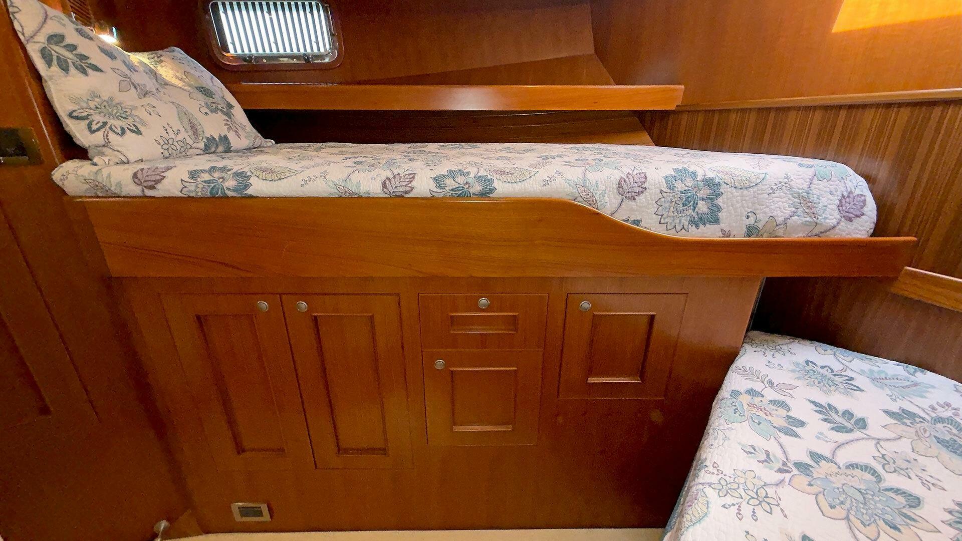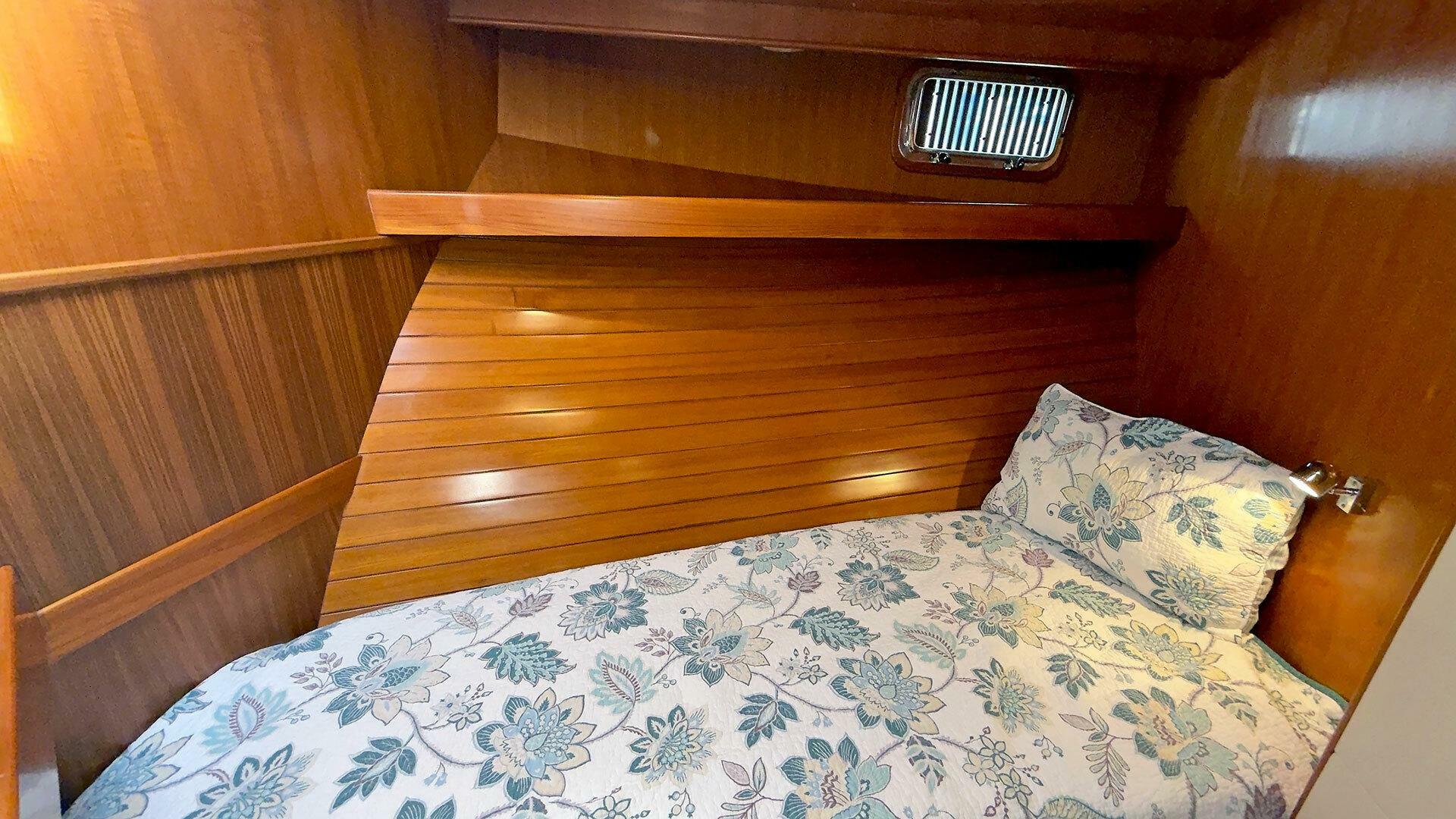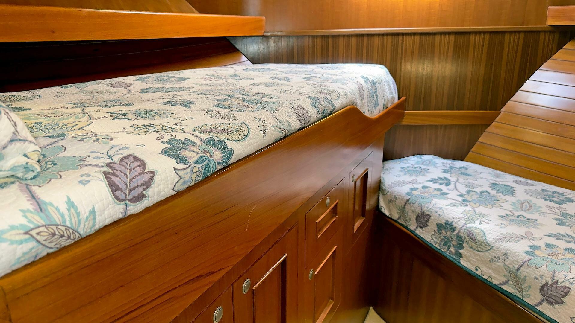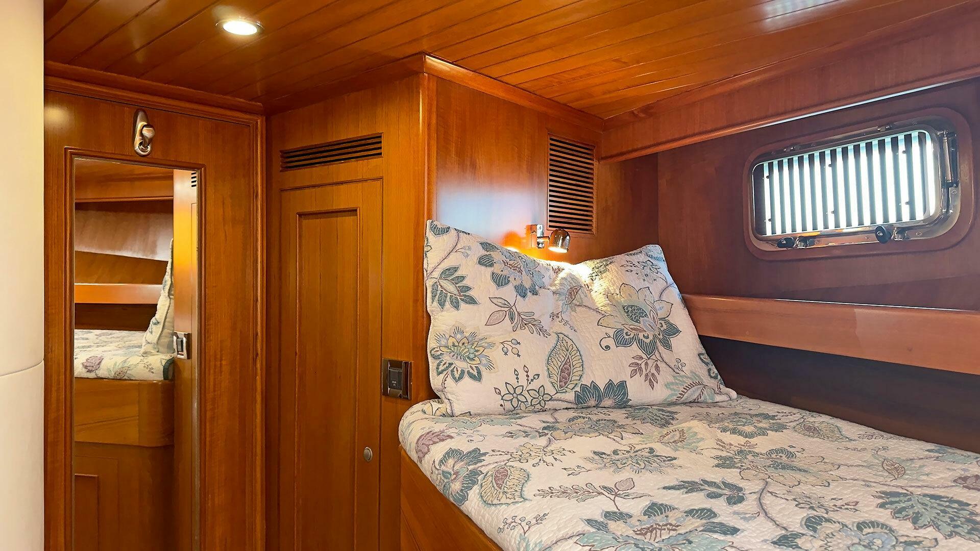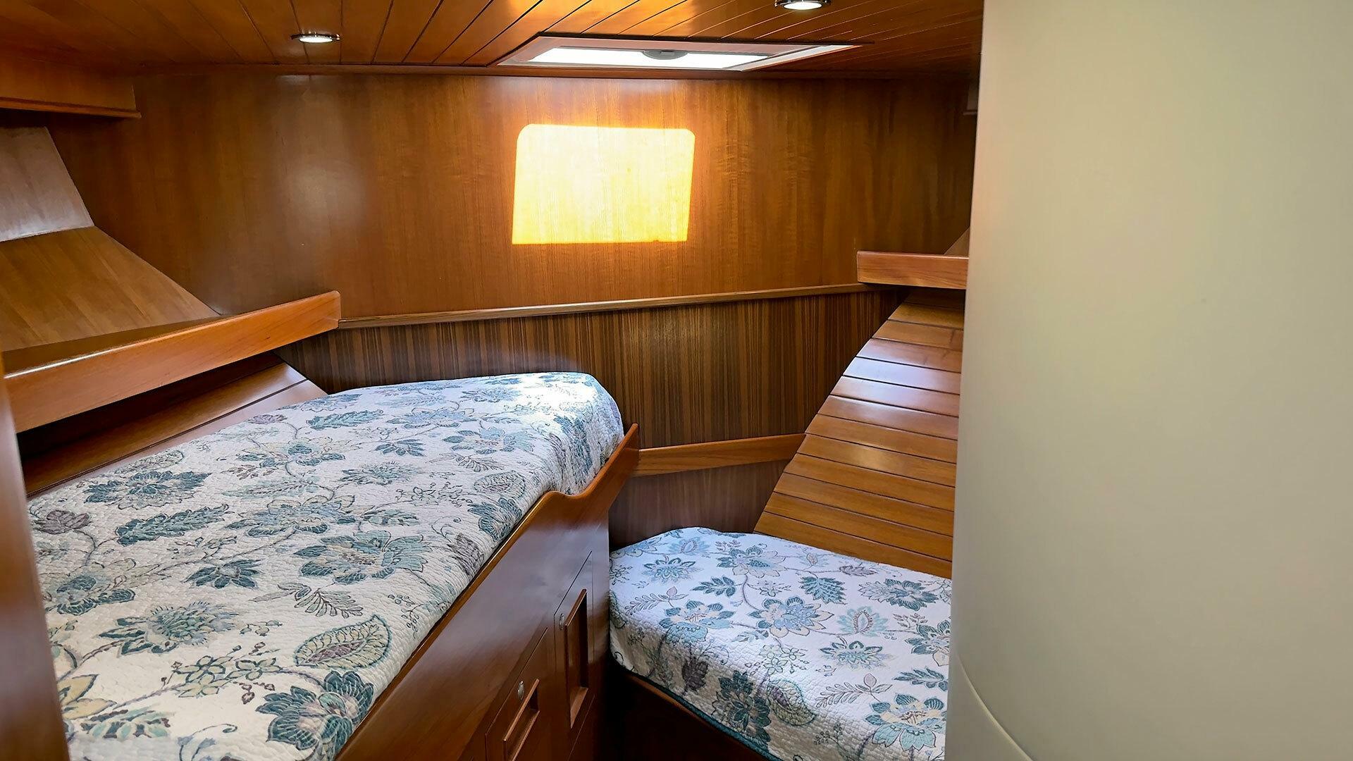 (Owner) amidship with custom mattress | (2) single berths in forward guest stateroom | Pilothouse watch berth