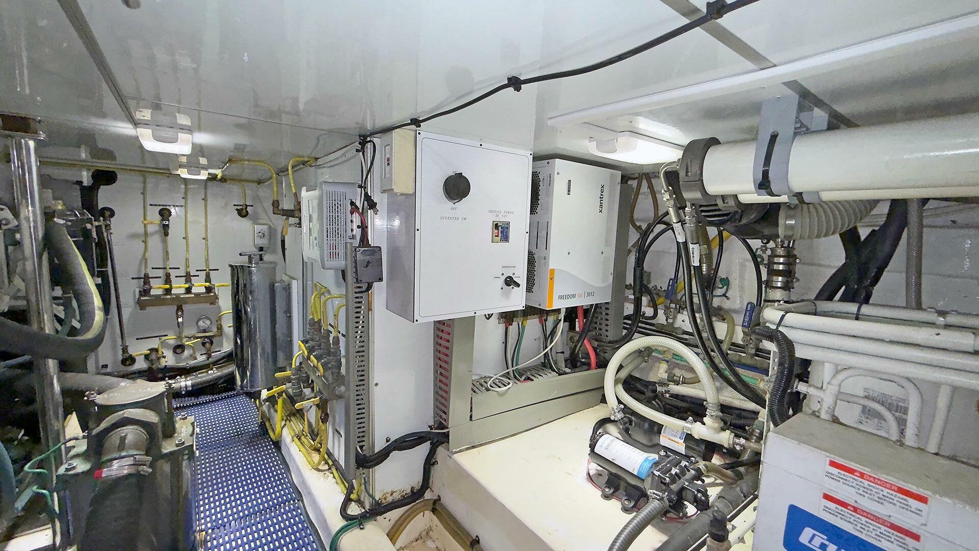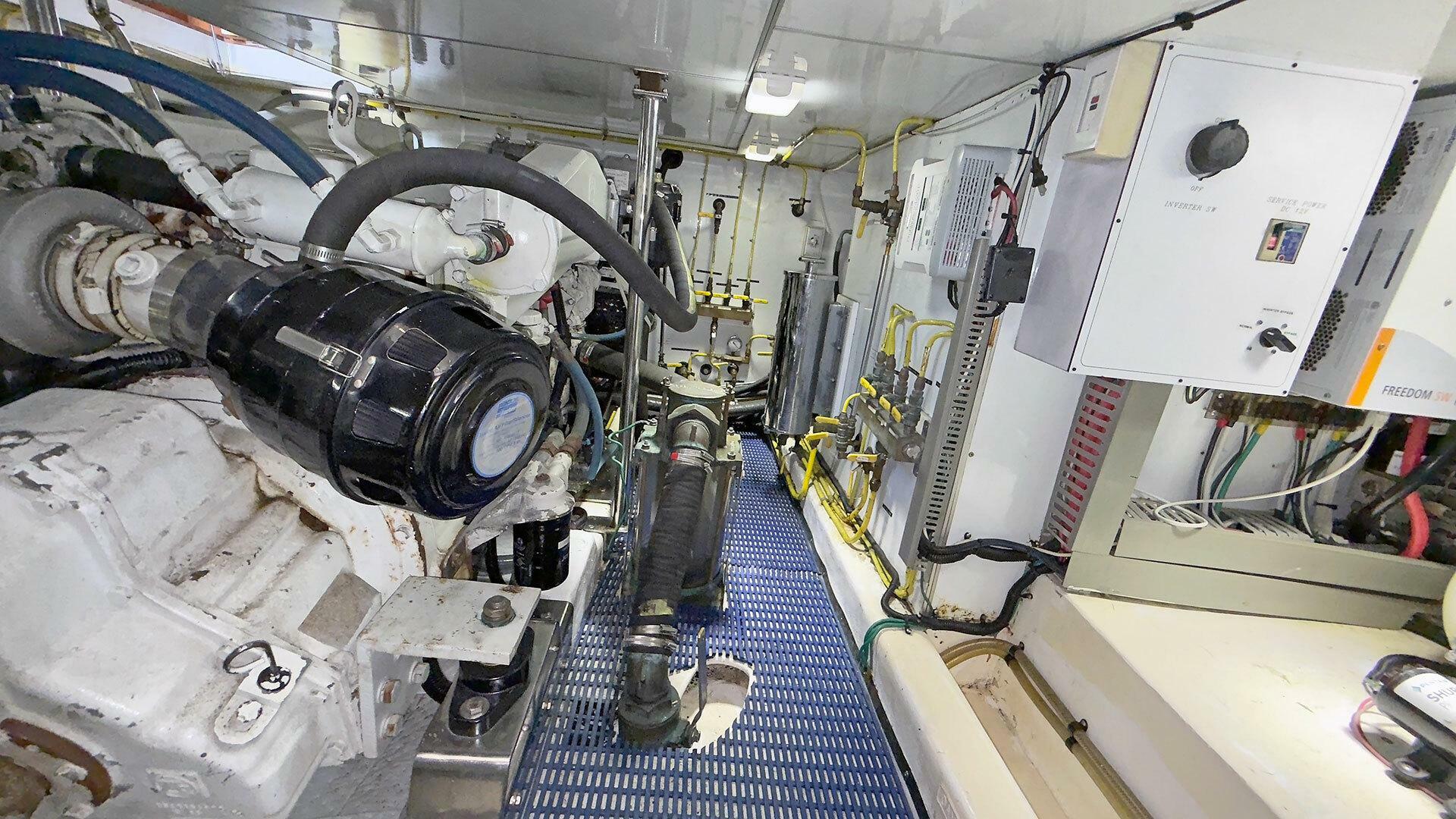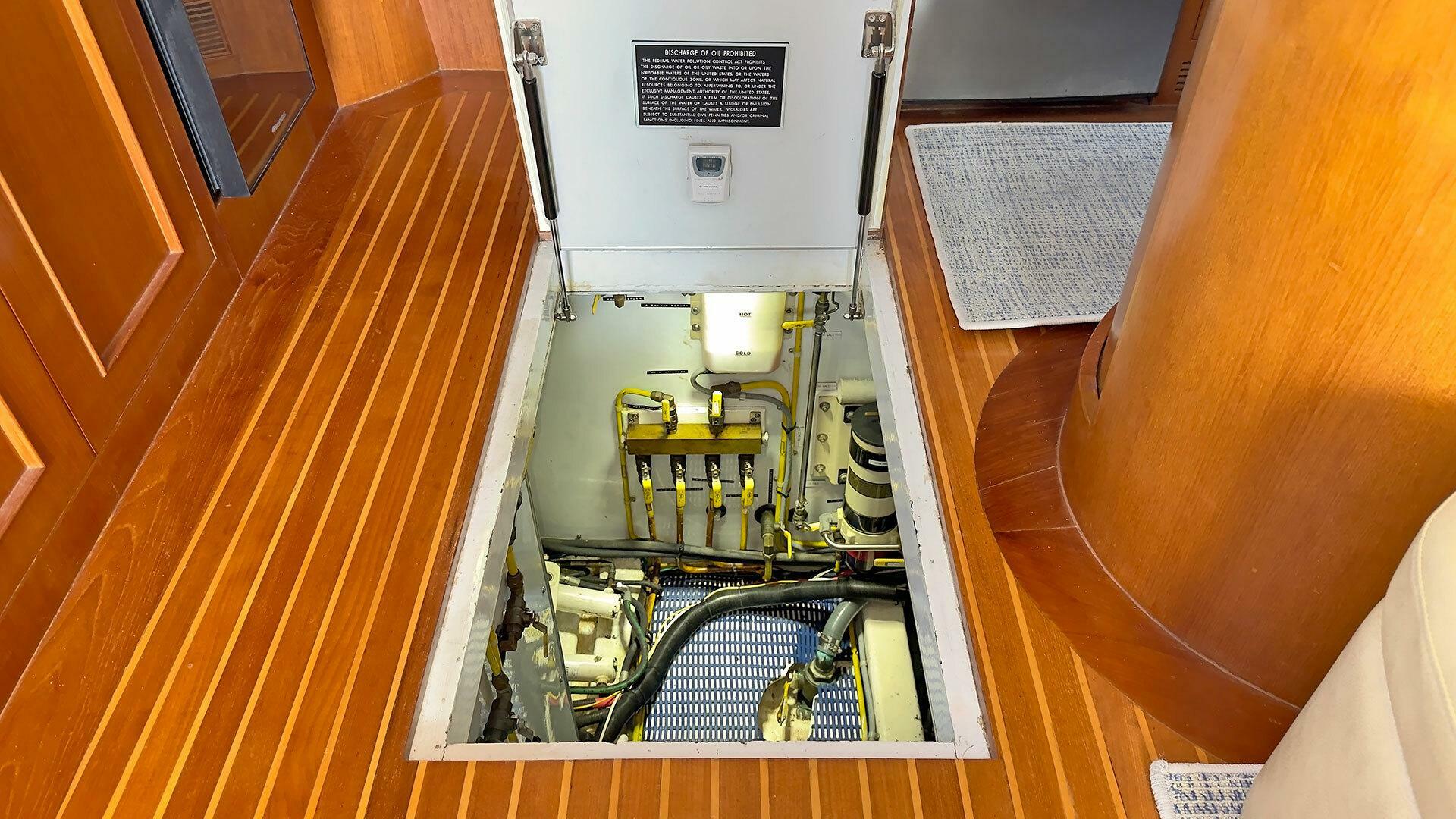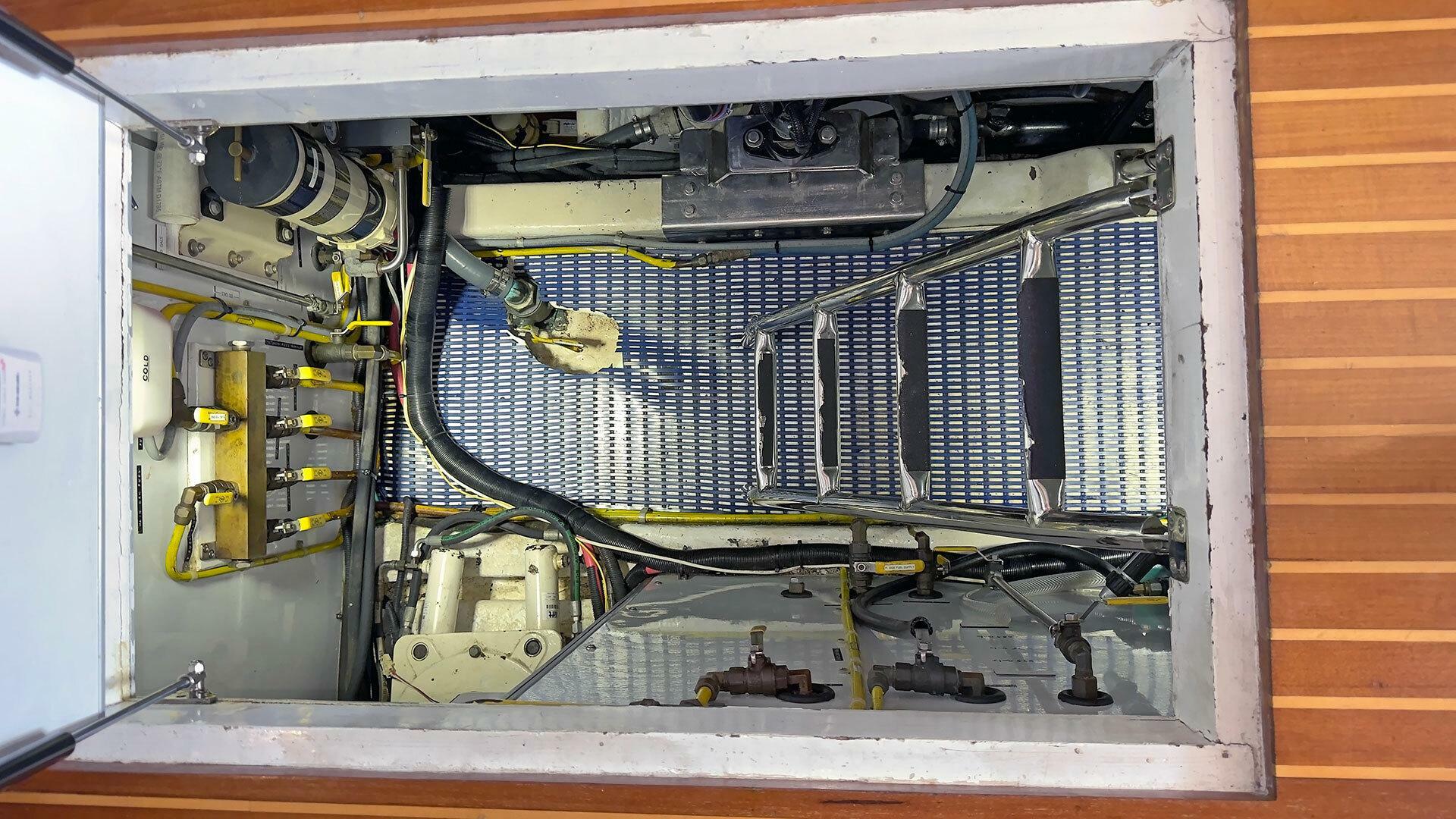 Engine Room: The engine room is under the saloon and galley. It is accessible via opening floor hatches, one forward to port, the other aft to starboard. The engine room machinery is easily accessible for service and inspection.