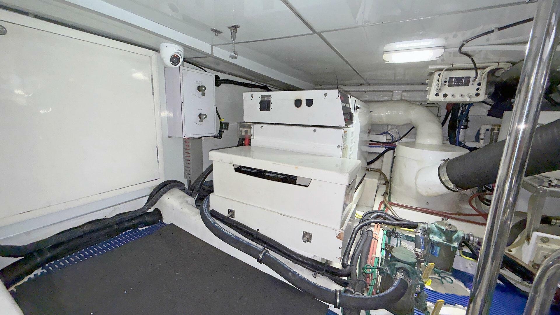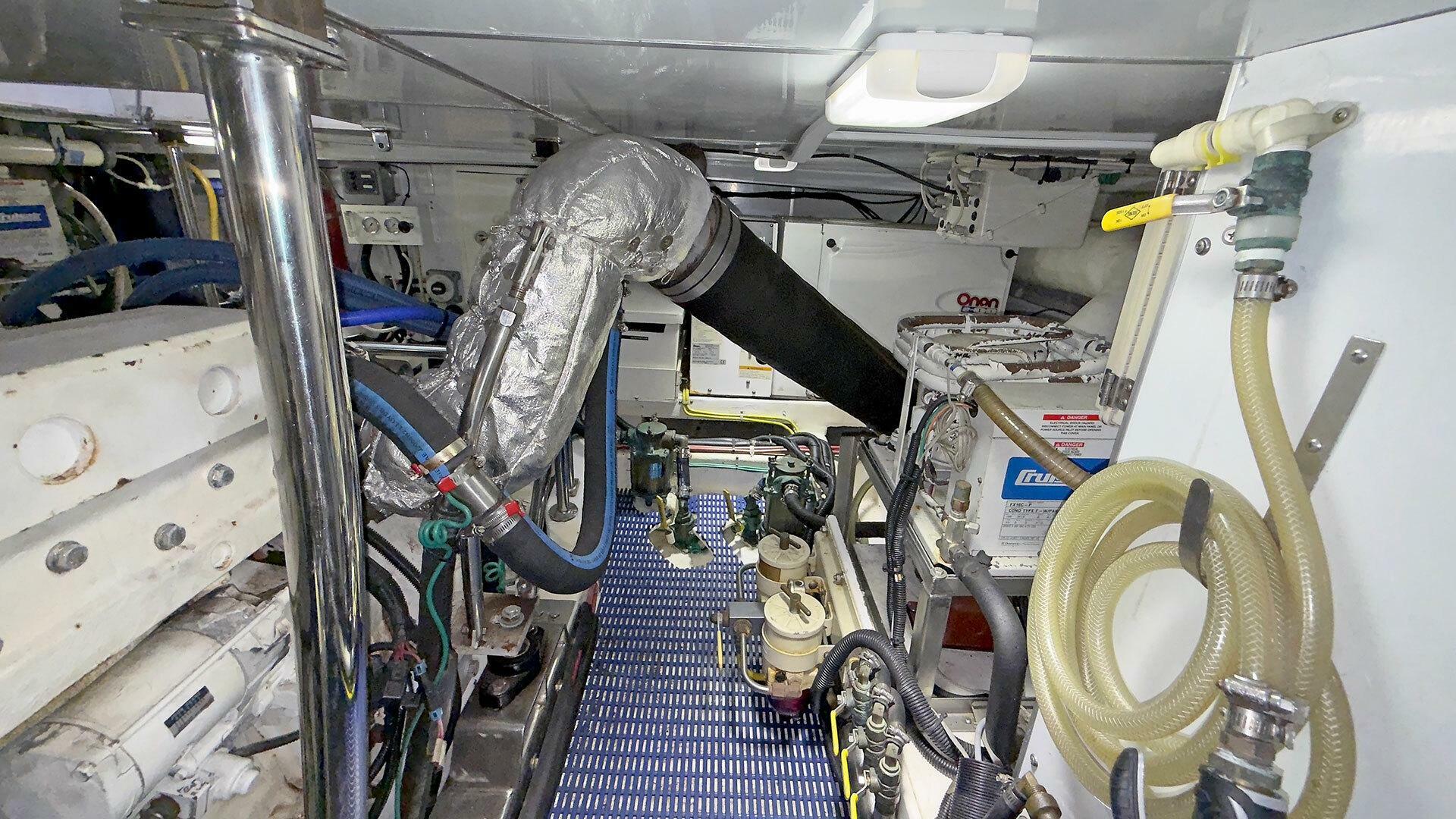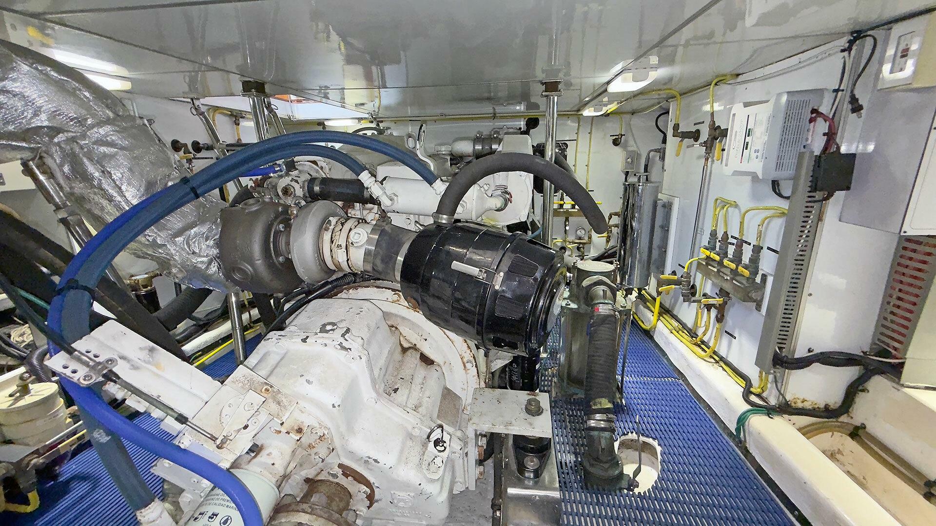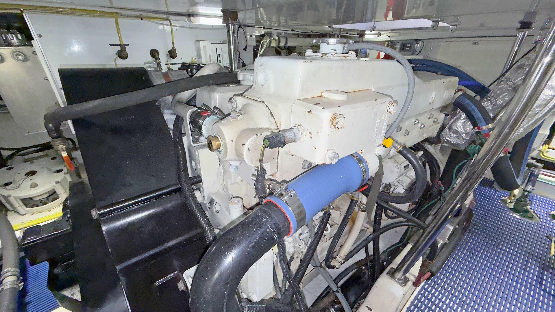 Engine Room: The engine room is under the saloon and galley. It is accessible via opening floor hatches, one forward to port, the other aft to starboard. The engine room machinery is easily accessible for service and inspection.