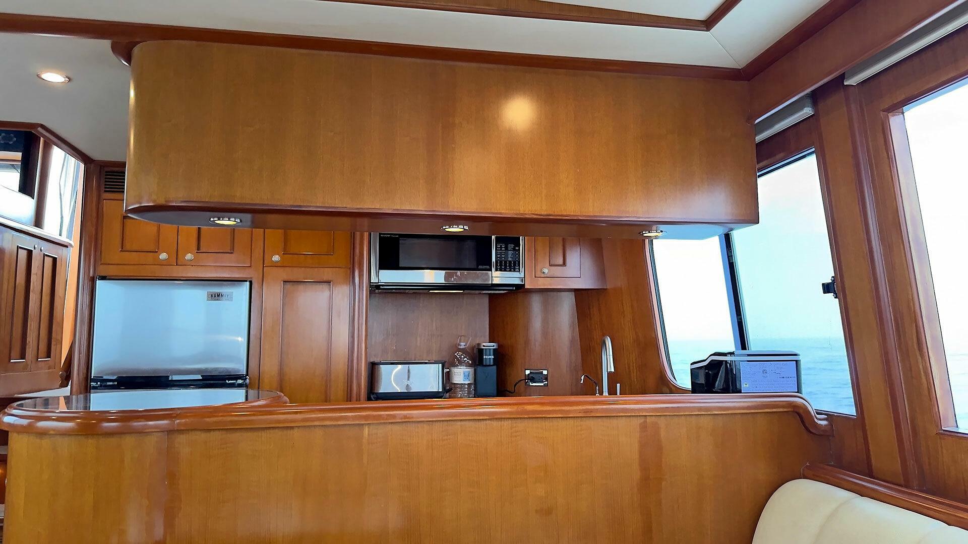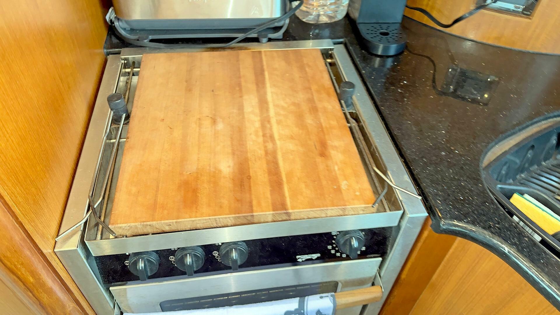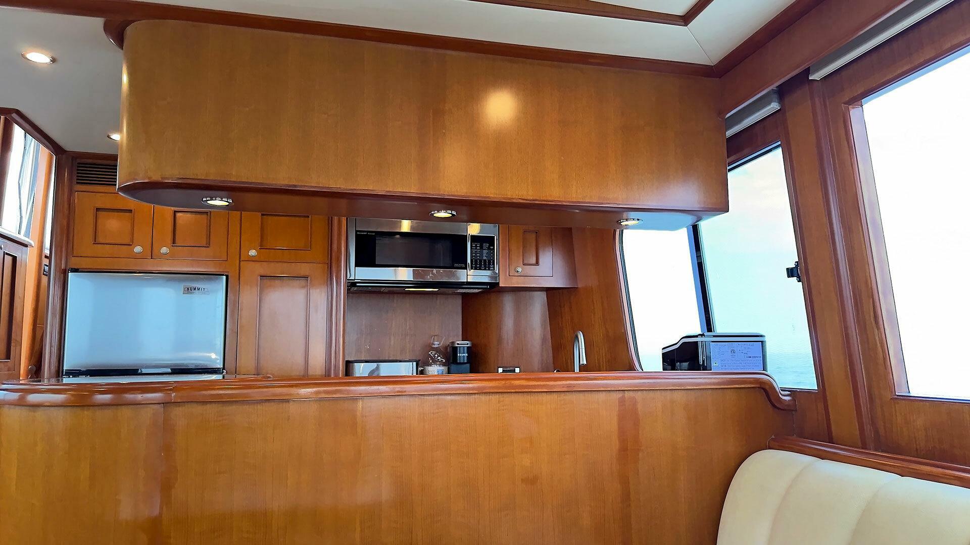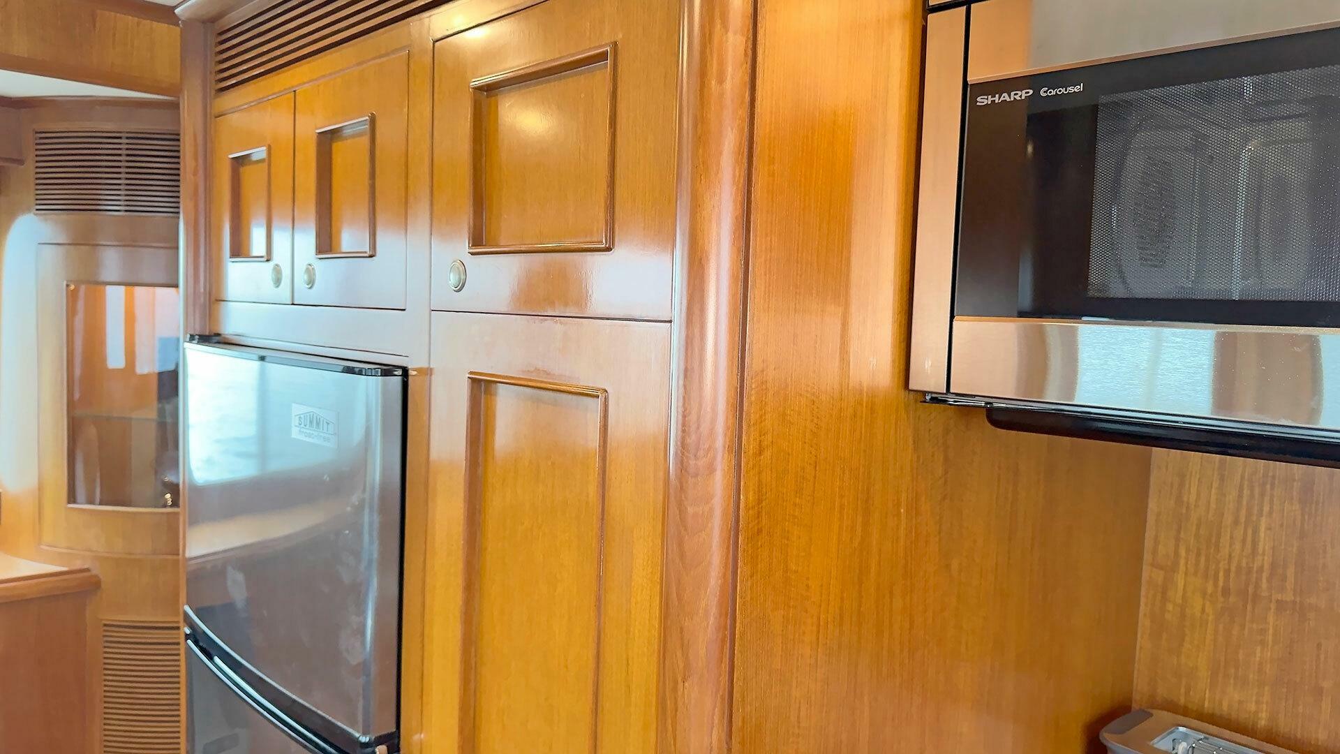 Summit refrigerator/freezer| Force-10 three-burner propane stove and oven with broiler | Sharp microwave / convection oven | GE garbage disposal | Franke stainless steel double basin sink with Moen faucet | Wine Enthusiast wine cooler