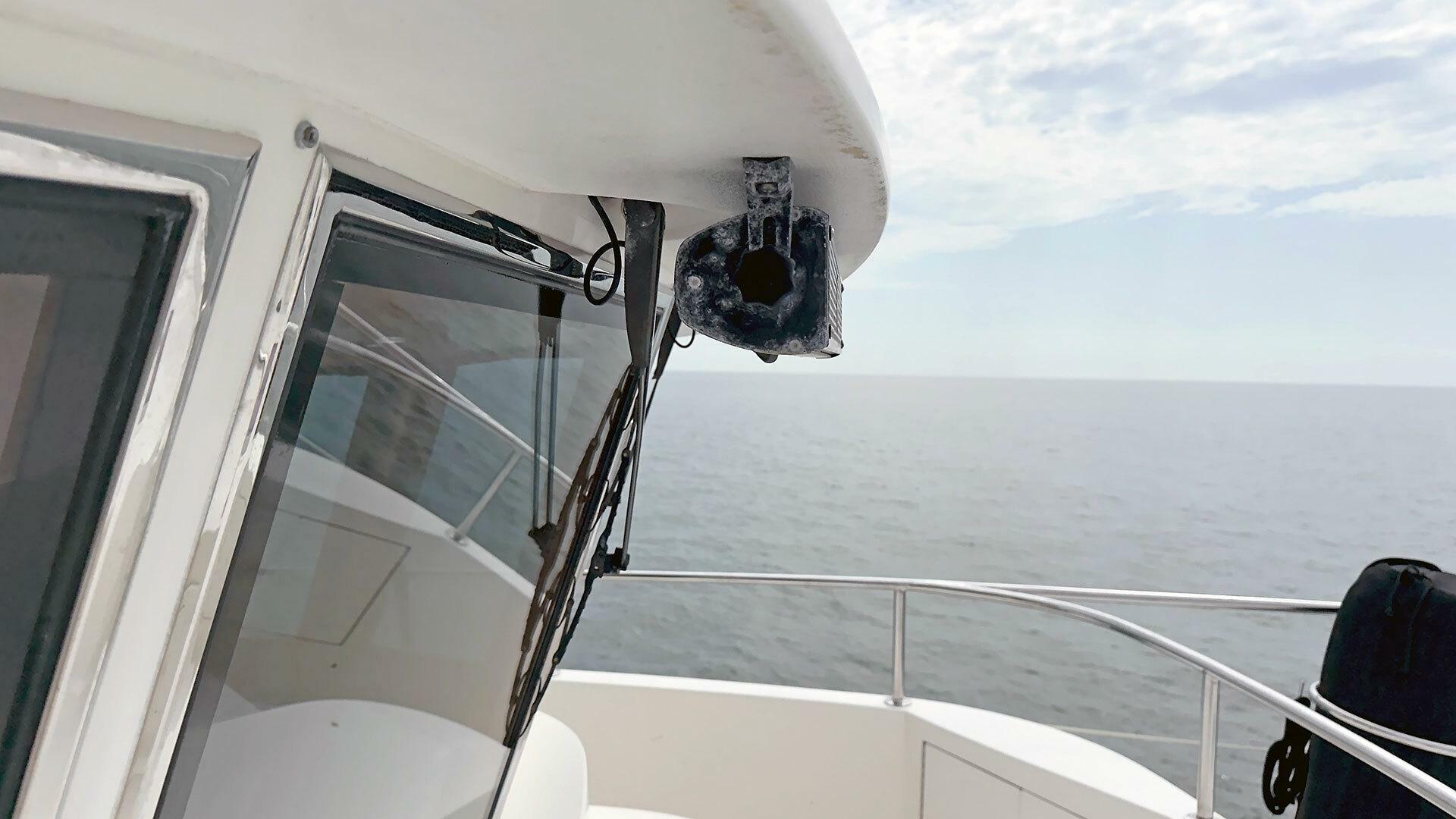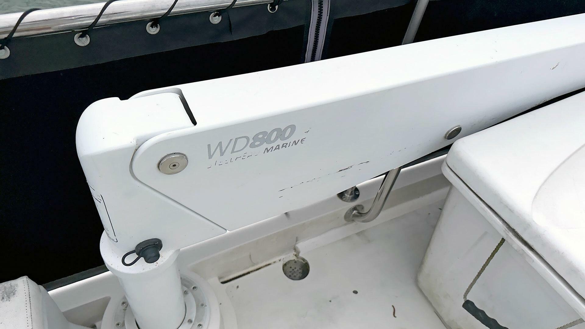 Fiberglass antenna mast with hinge for lowering at base| Steelhead Marine WD-800 800 lb. electric davit for dinghy