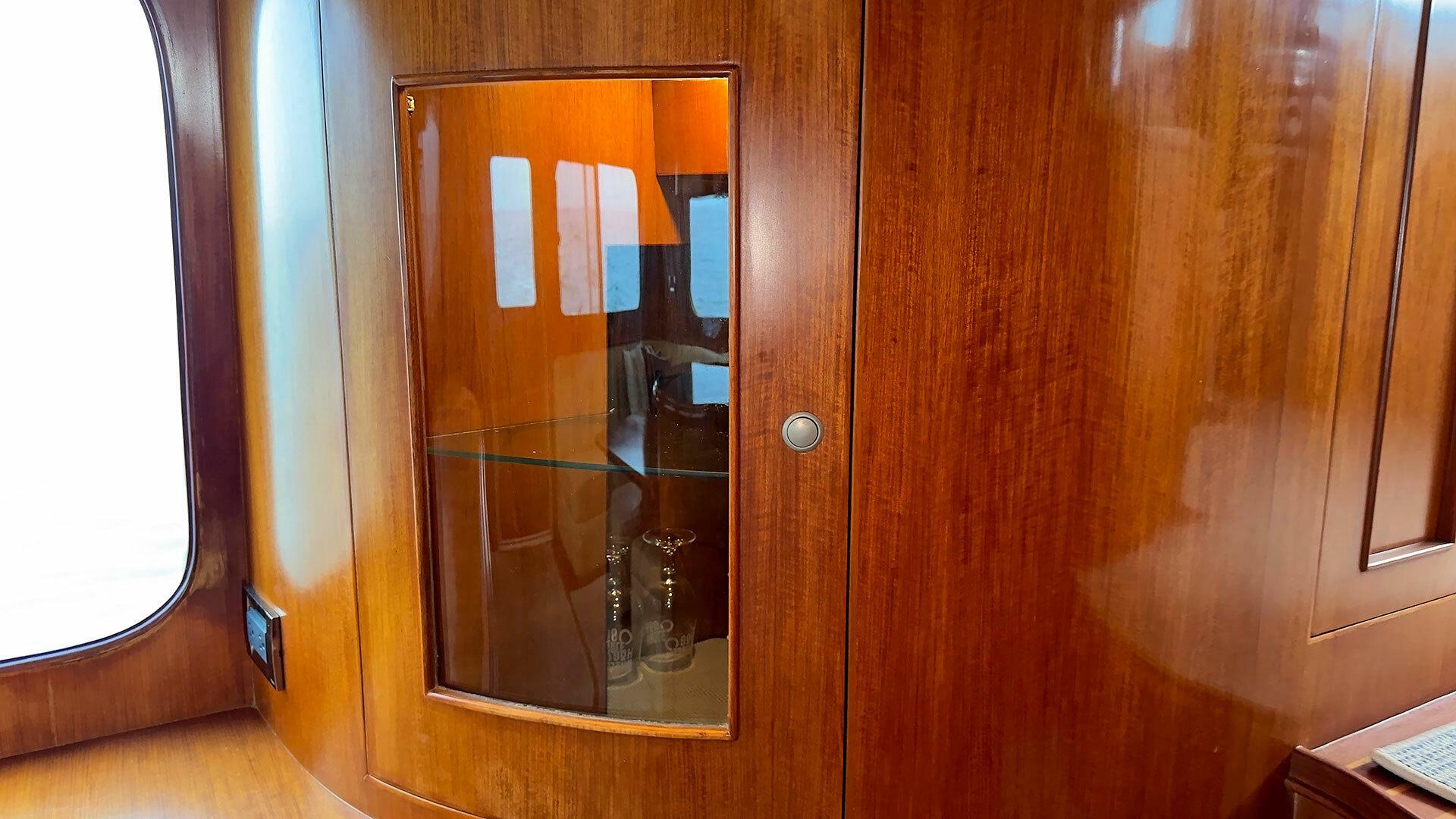 Saloon: The cockpit leads directly to the saloon through a large Diamond Sea Glaze sliding door with upper window. The absence of walking side decks outside maximizes the interior saloon area – creating an expansive interior, enhanced by the large windows outboard and aft. To port is a cabinet area with lockers. A large settee with moveable dining table is to starboard. The settee area has additional storage space under the cushions. There are two Ottomans with lift up tops for storage inside. The soles are teak and holly. There is a lighted cabinet forward with clear glass in the door for display purposes. Most interior lights are LED.