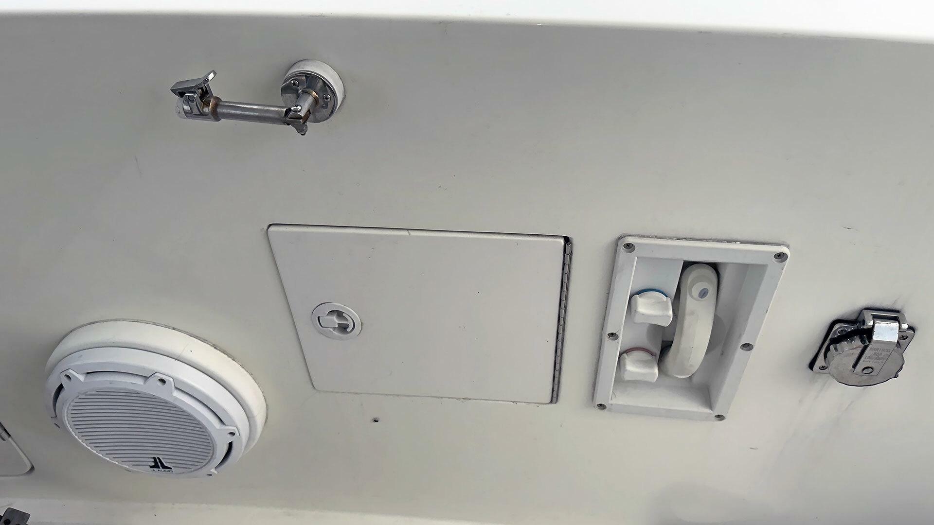 Cockpit: You can board Lightning through one of two entry gates positioned aft and to starboard. The swim platform makes it easy to step in or out of your tender and convenient for swimming off the back of the boat. The cockpit has tall bulwarks. All of the hawsepipes with cleat horns are recessed. There is a hot/cold cockpit shower and a separate locker with fresh and seawater hose bib and shore water connection.