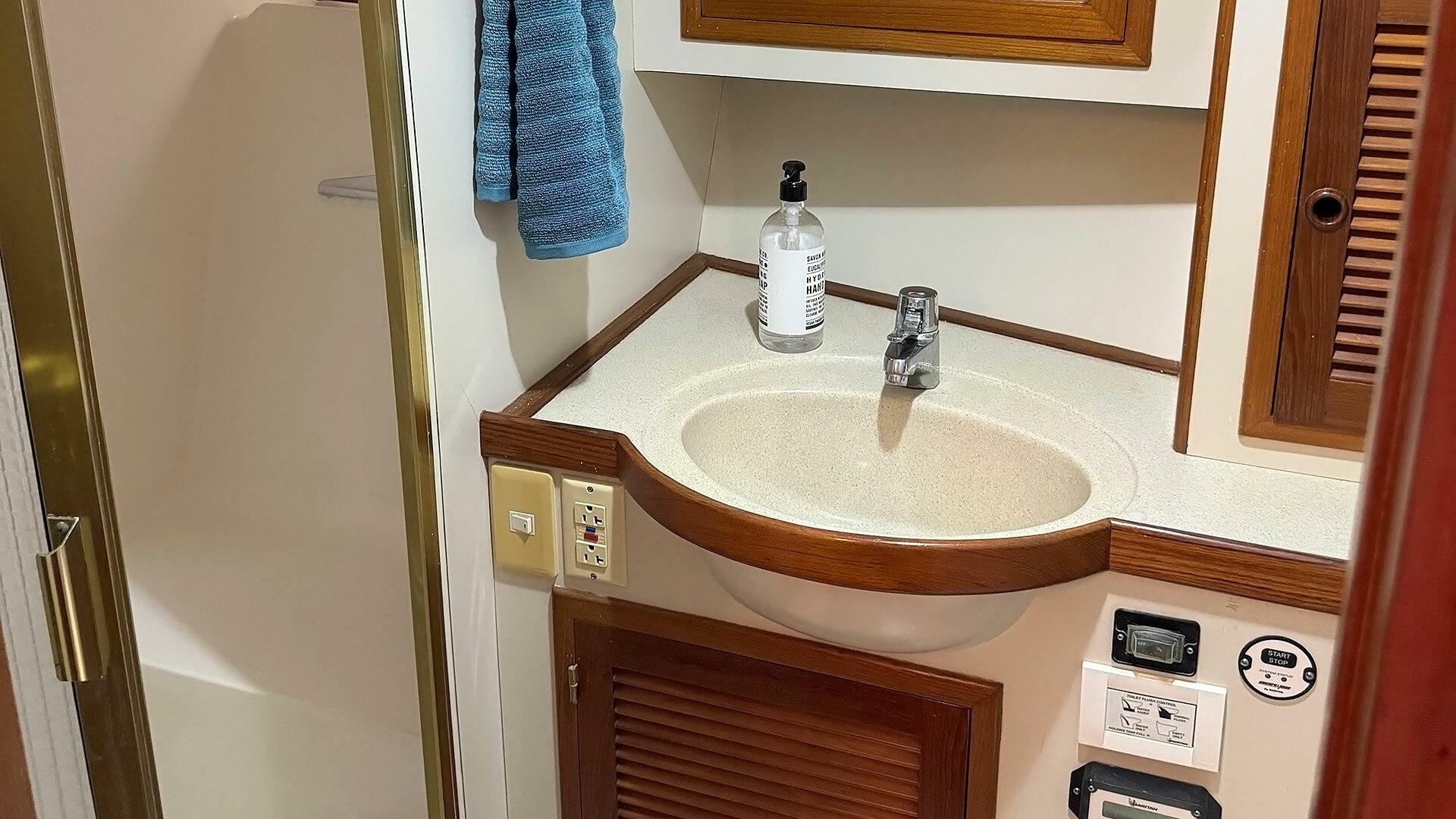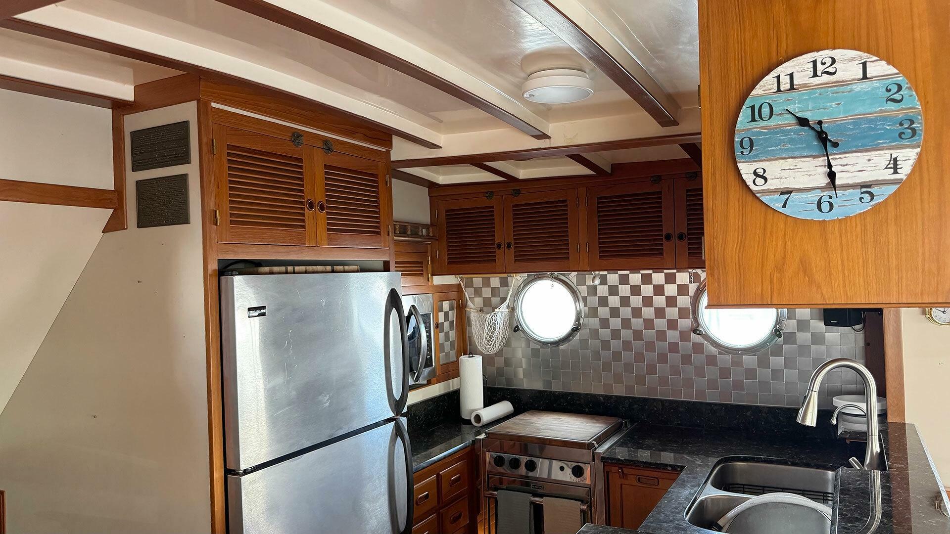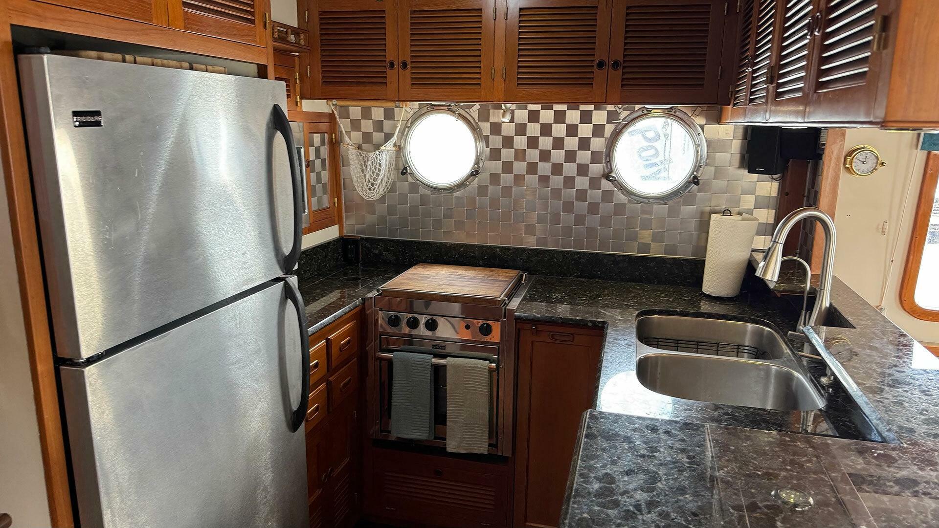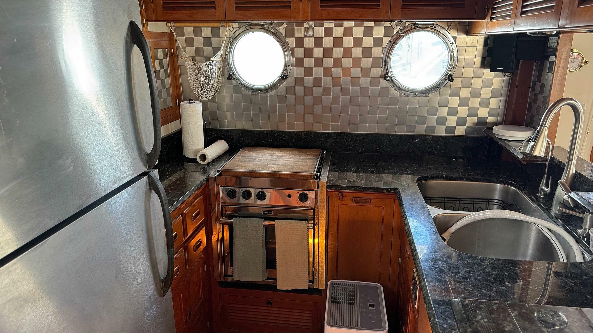 The galley is forward on the starboard side. Great Escape has enjoyed the preparation of numerous meals around the clock while underway or with style at rest. There is a Force 10 (3) burner LPG stove with oven, and a large dual basin stainless-steel sink. Frigidaire appliances: full-size refrigerator/freezer and microwave oven. There are louvered overhead lockers and under counter drawers for cutlery, utensils, pots, pans, plates and cookware.