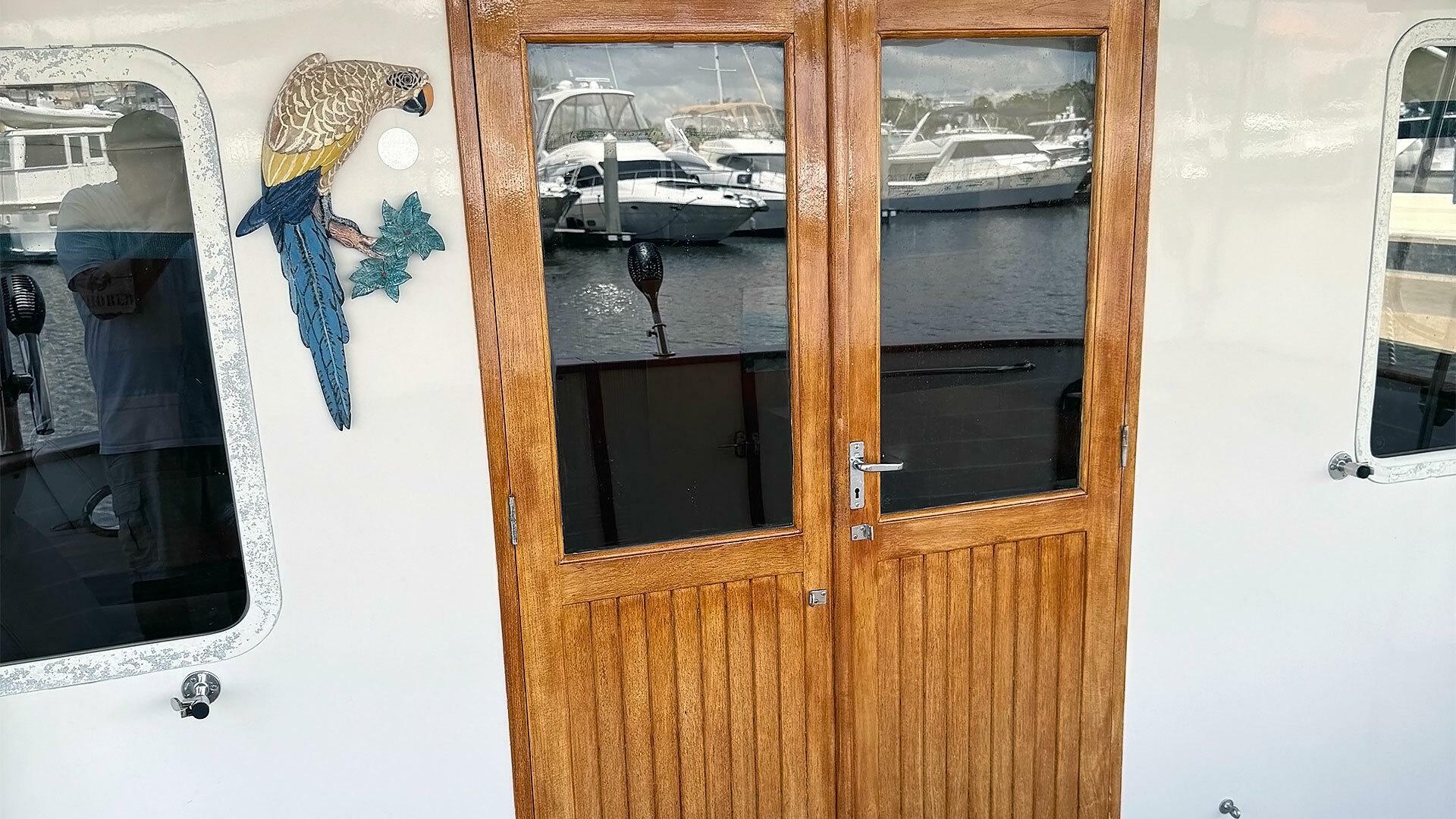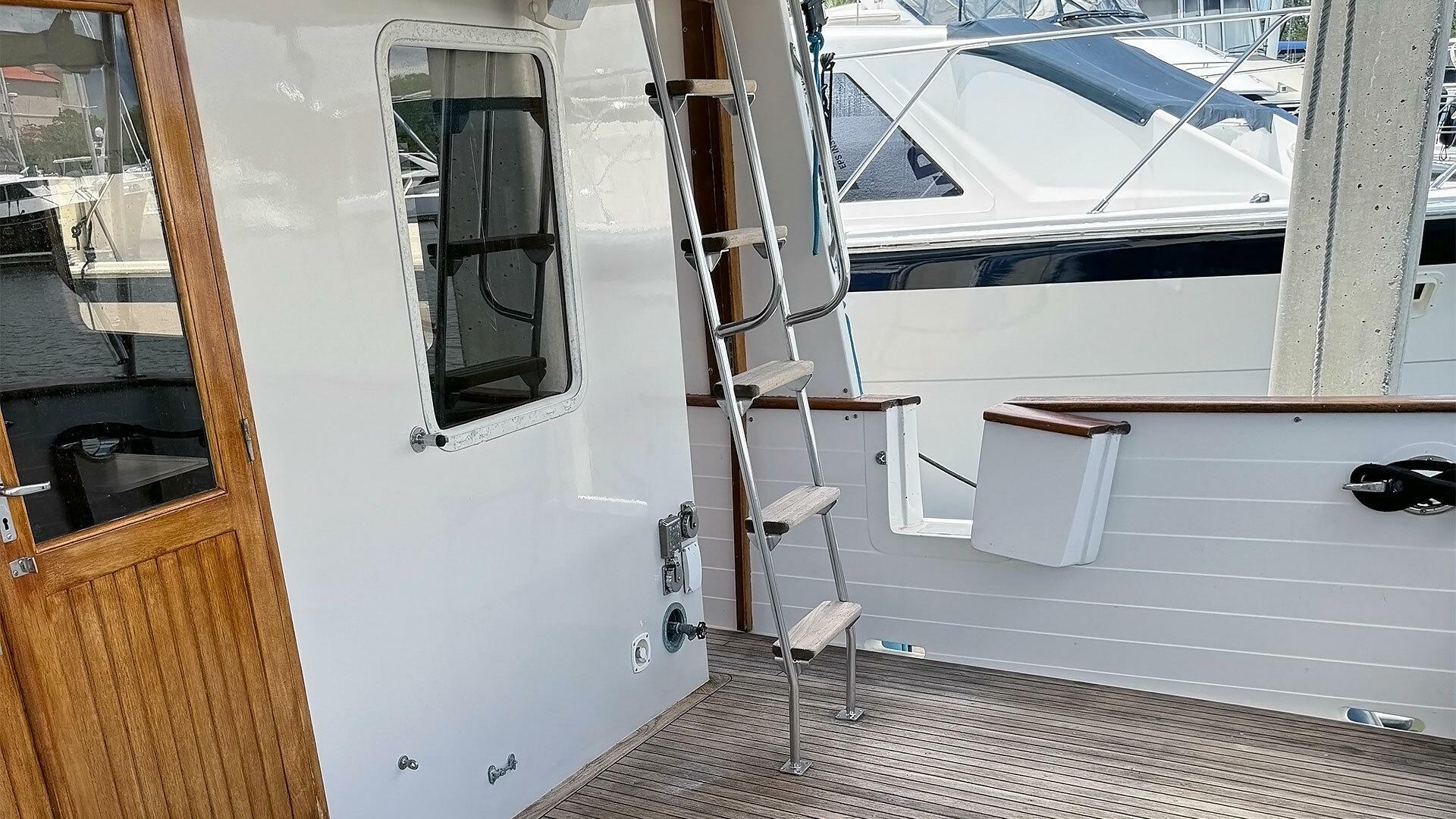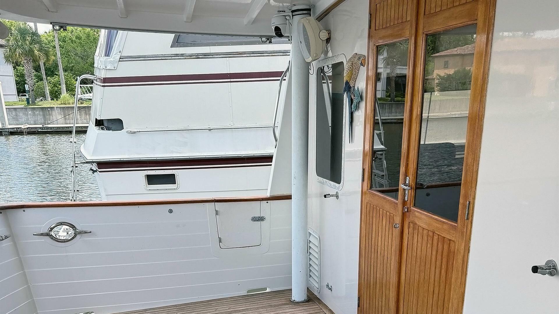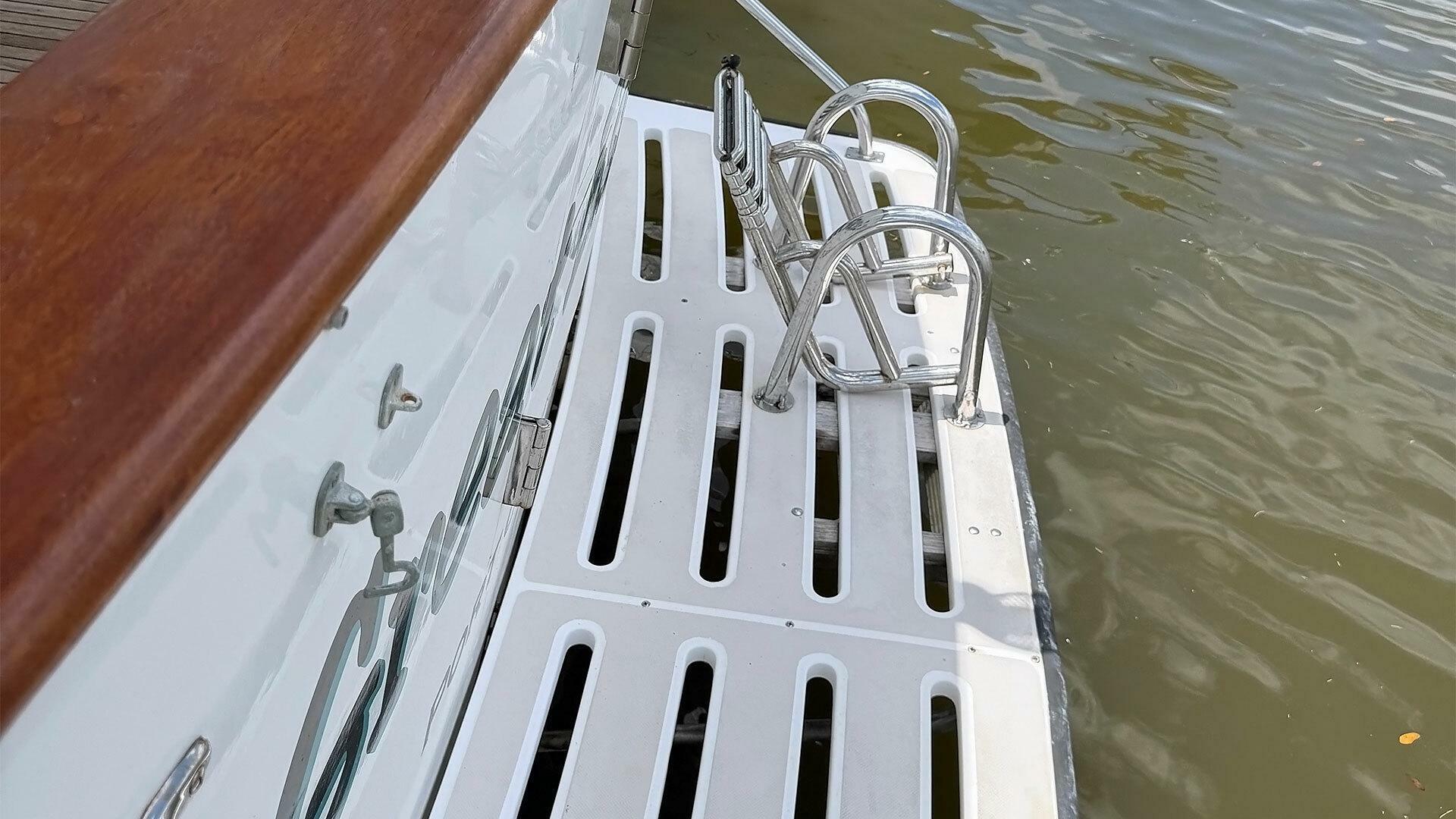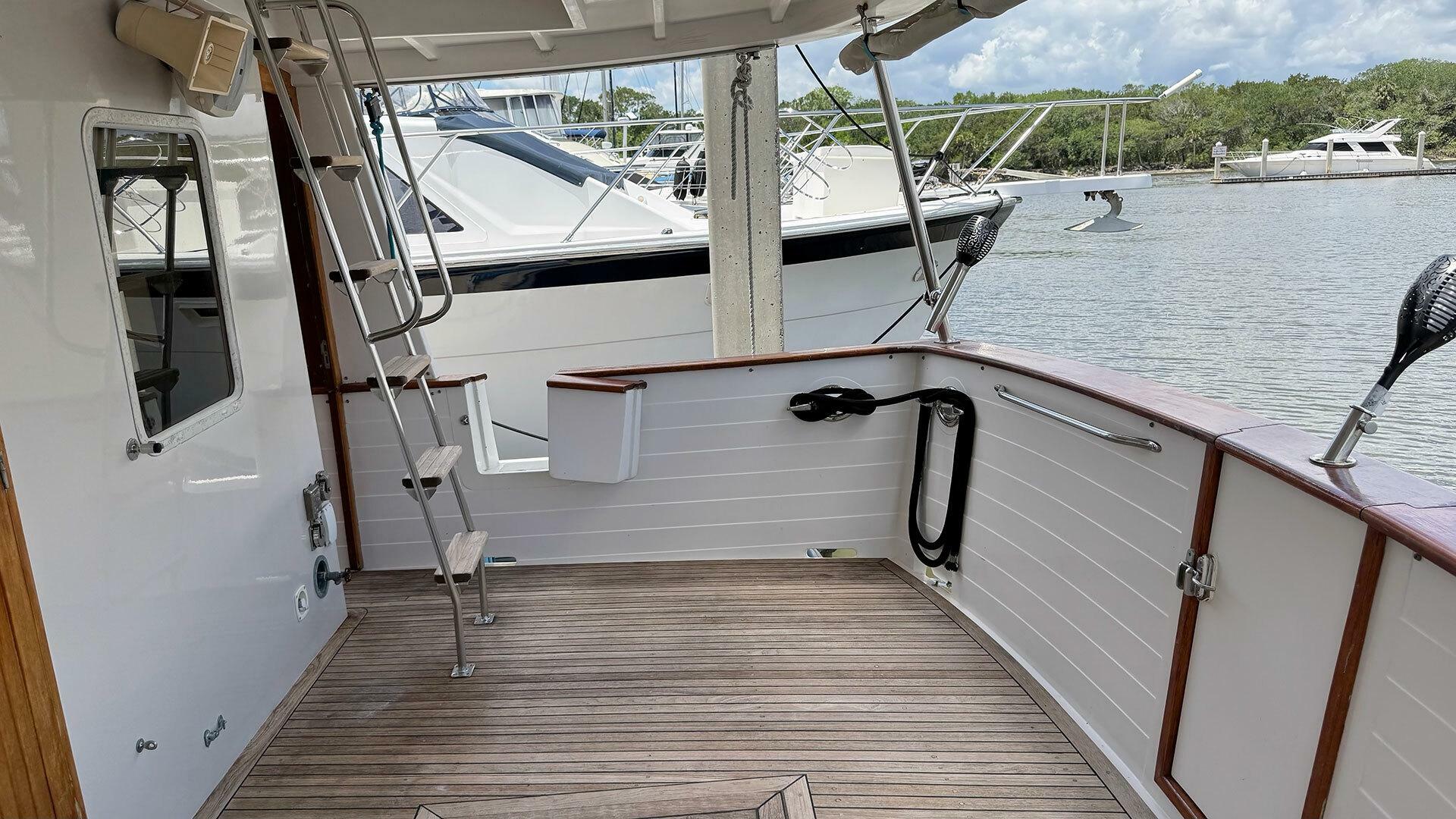 You can board Great Escape from the swim platform and then forward through the tall aft cockpit door. At a marina or dock, it is easier to get aboard via either the port or starboard cockpit side deck step over doors. You are protected overhead by the boat deck above. The entire lower deck surface is teak. This is a quiet place to relax.