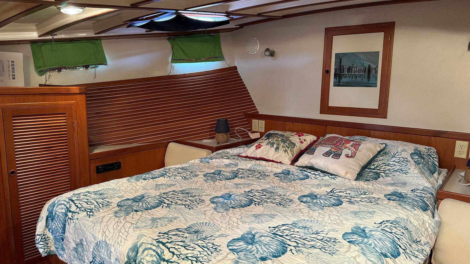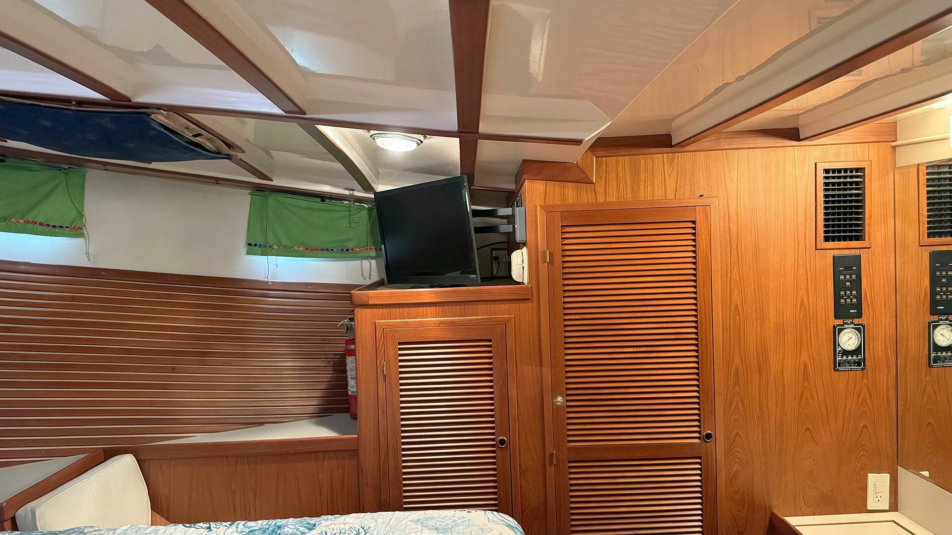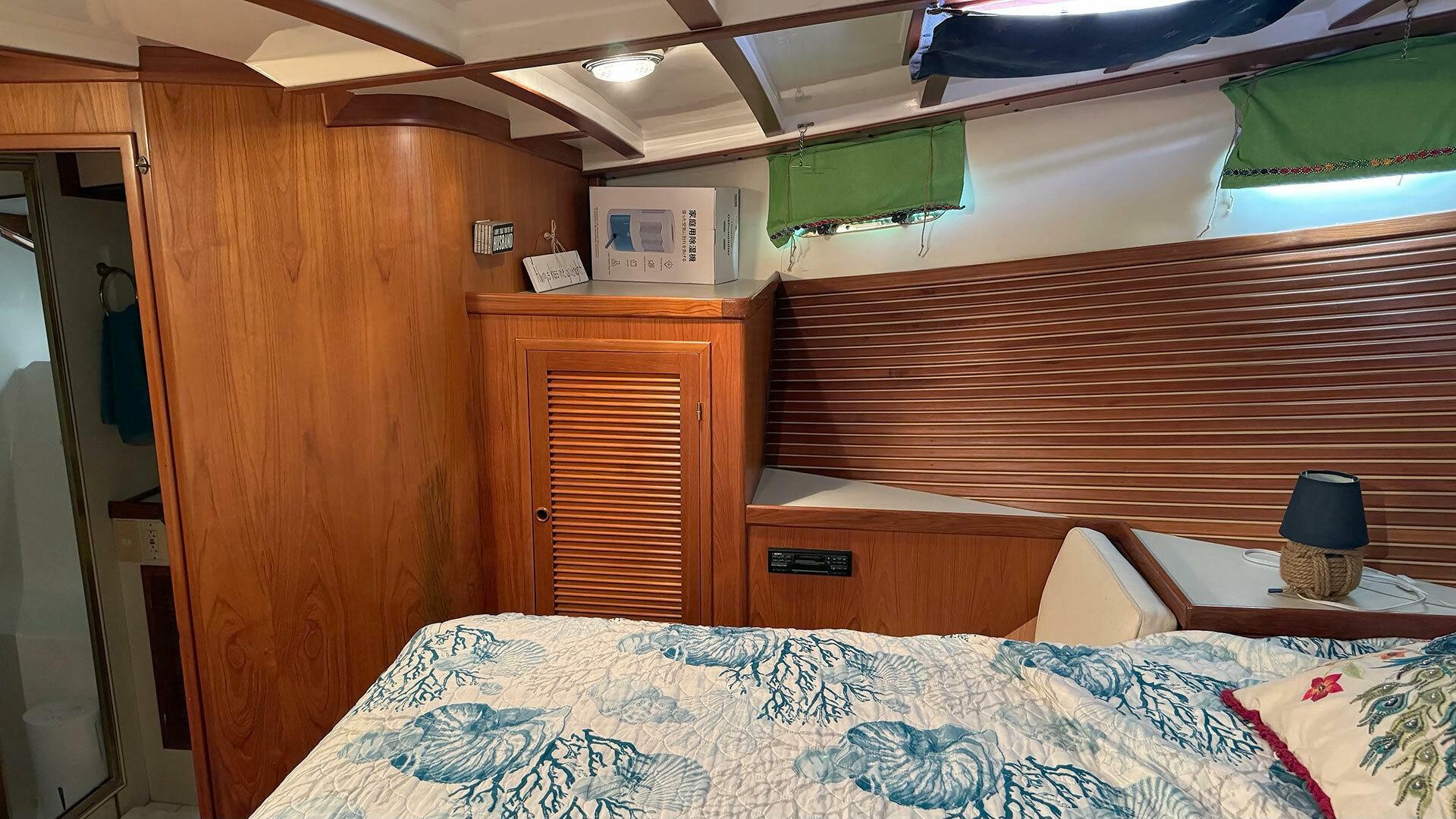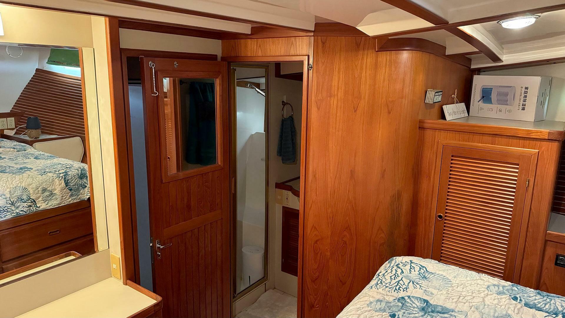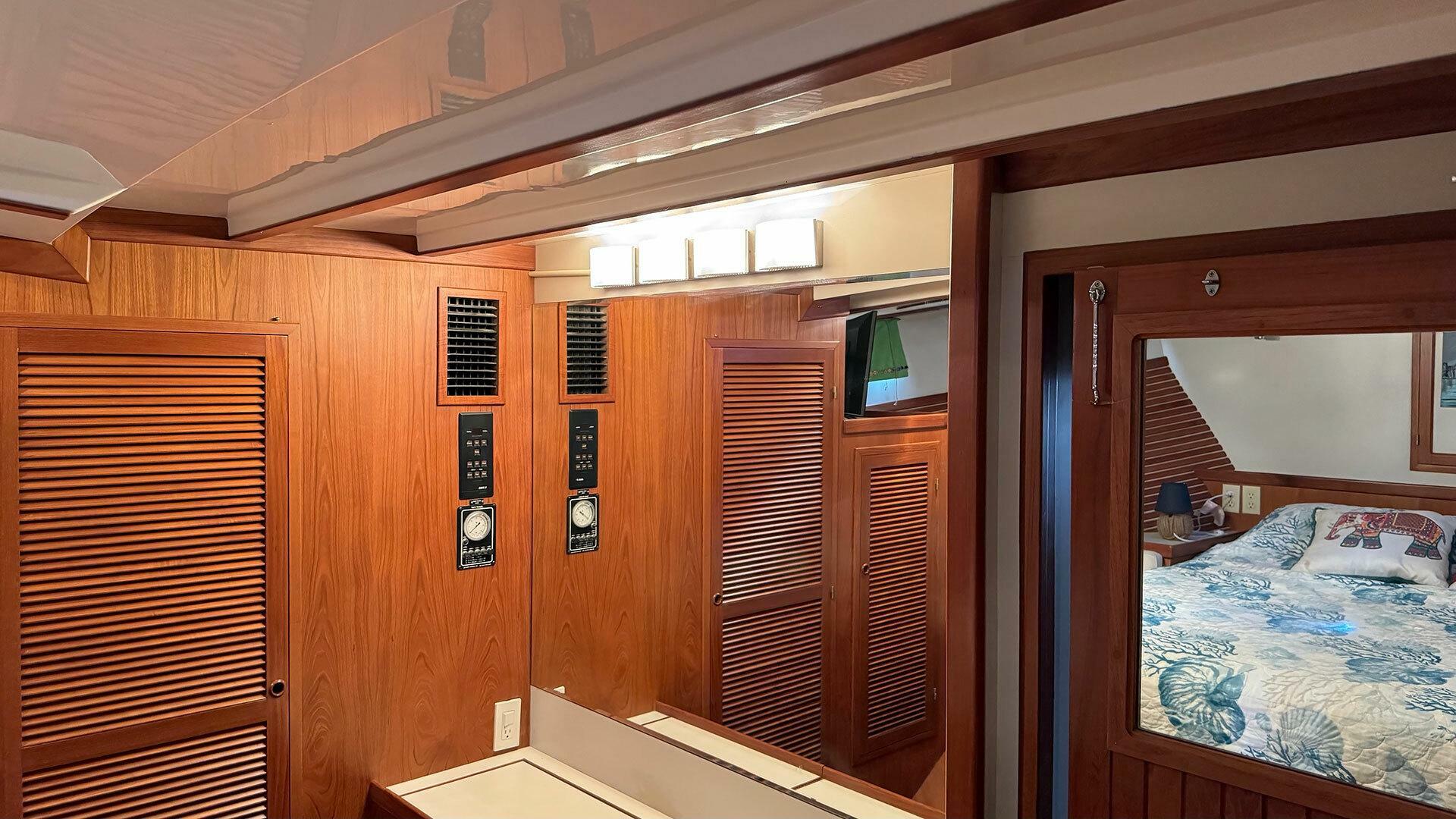 The forward Owner stateroom enjoys a spacious, queen-size island berth. This stateroom has teak ceiling trim outboard and teak cabinetry with louvered lockers. There are four stainless steel opening portlights and two overhead hatches giving plenty of light and ventilation. Storage for clothing in three hanging lockers and twelve large drawers. The bed lifts to provide access to a large compartment under the berth, and there is below sole machinery access as well.