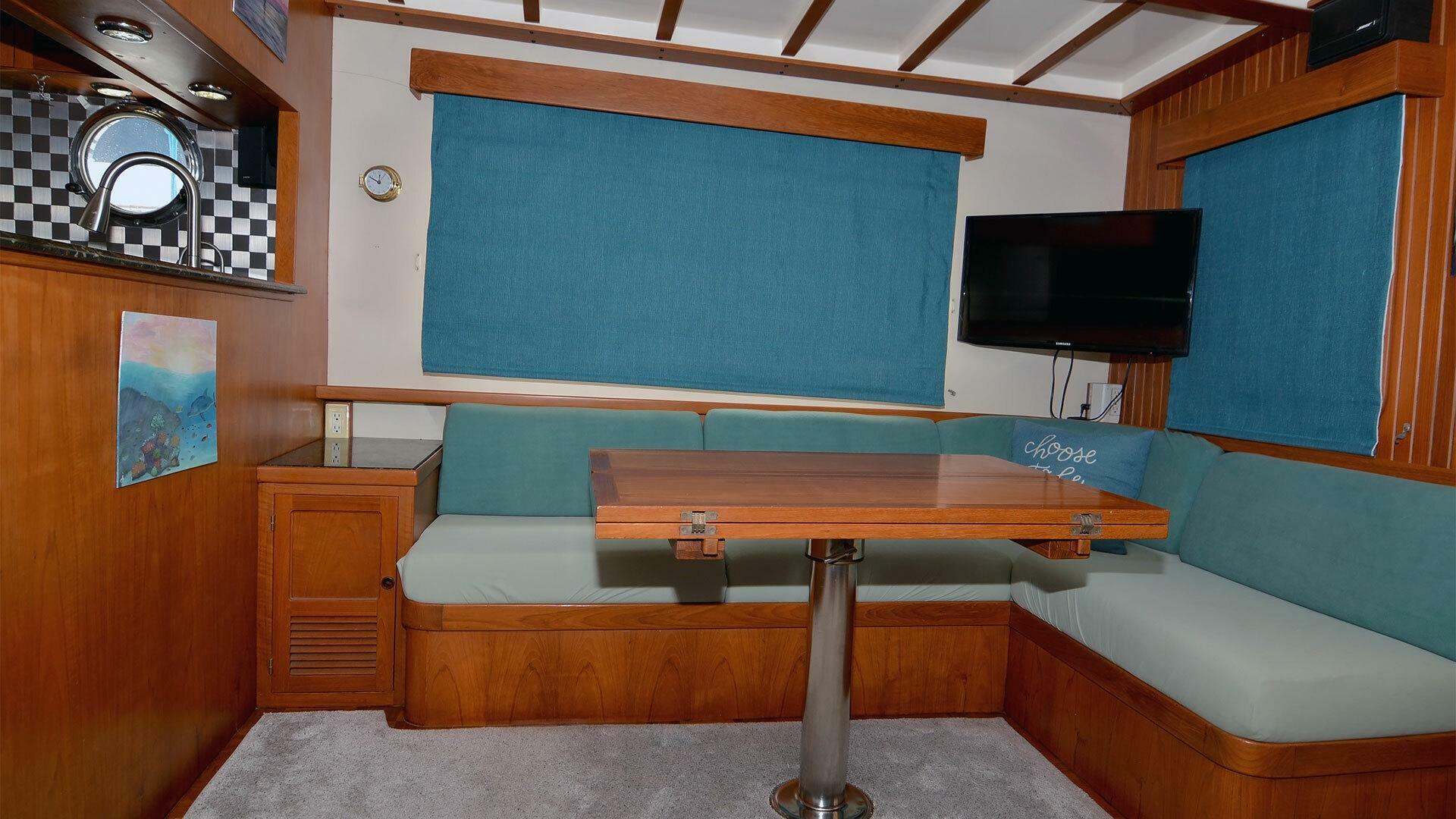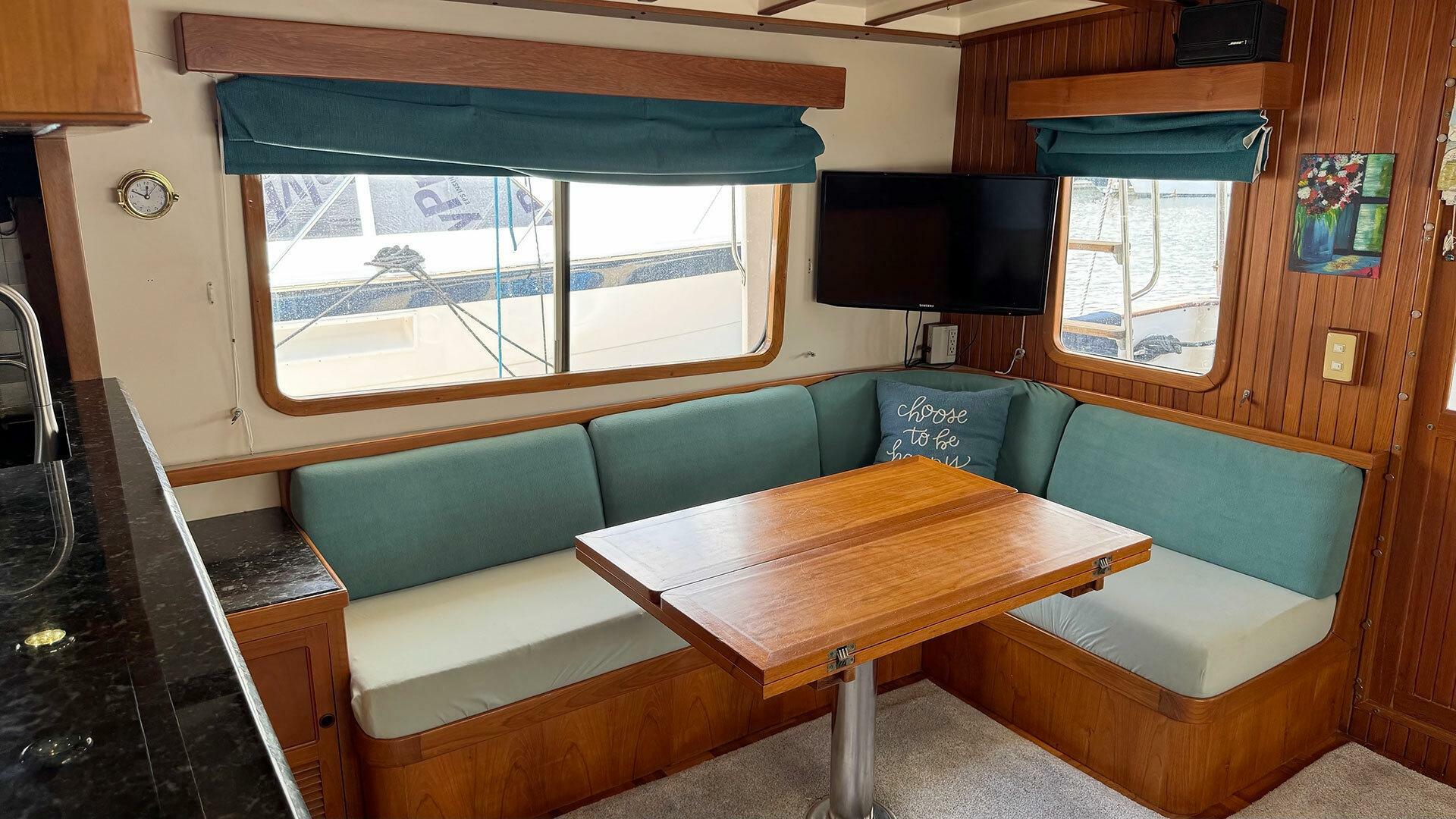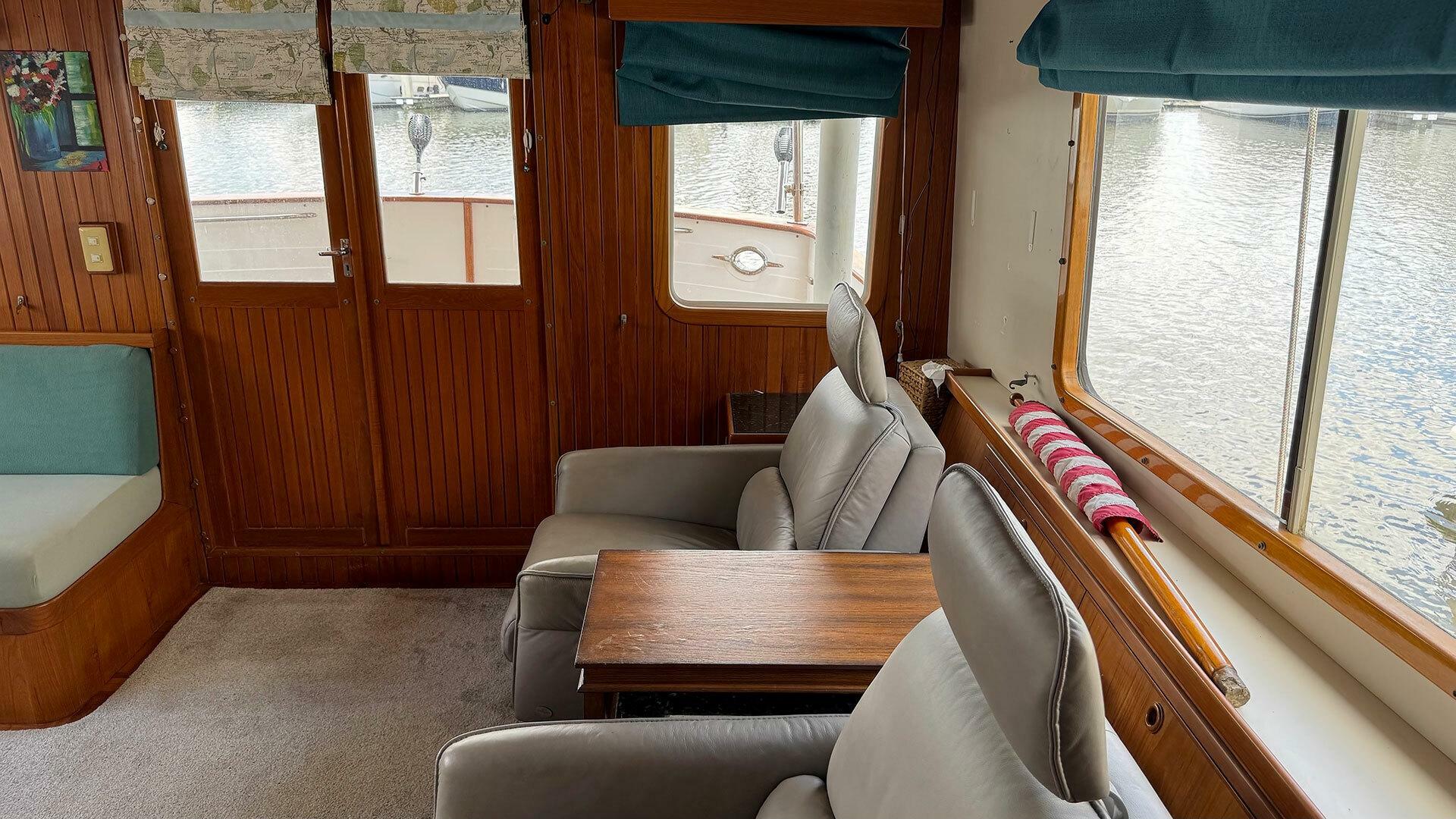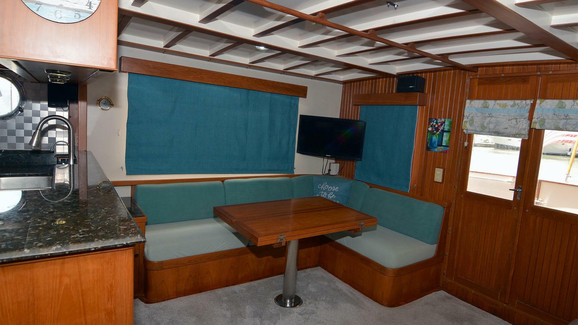 The saloon aboard Great Escape creates a very open, airy, and pleasant living space. For visibility, light and ventilation, there are large opening windows port and starboard as well as an opening window in the aft bulkhead. Great Escape has a roomier feel inside since she is a widebody configuration with the only walking deck to starboard. To starboard is an L-shaped settee with a teak wood hi-lo table. Forward of the settee is a cabinet for the entertainment center. To port there are two home style upholstered chairs. The engine room is accessed by a floor hatch forward in the sole.