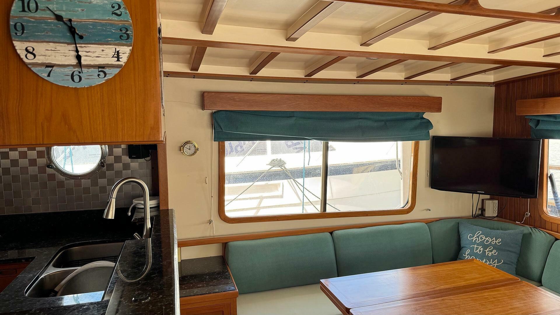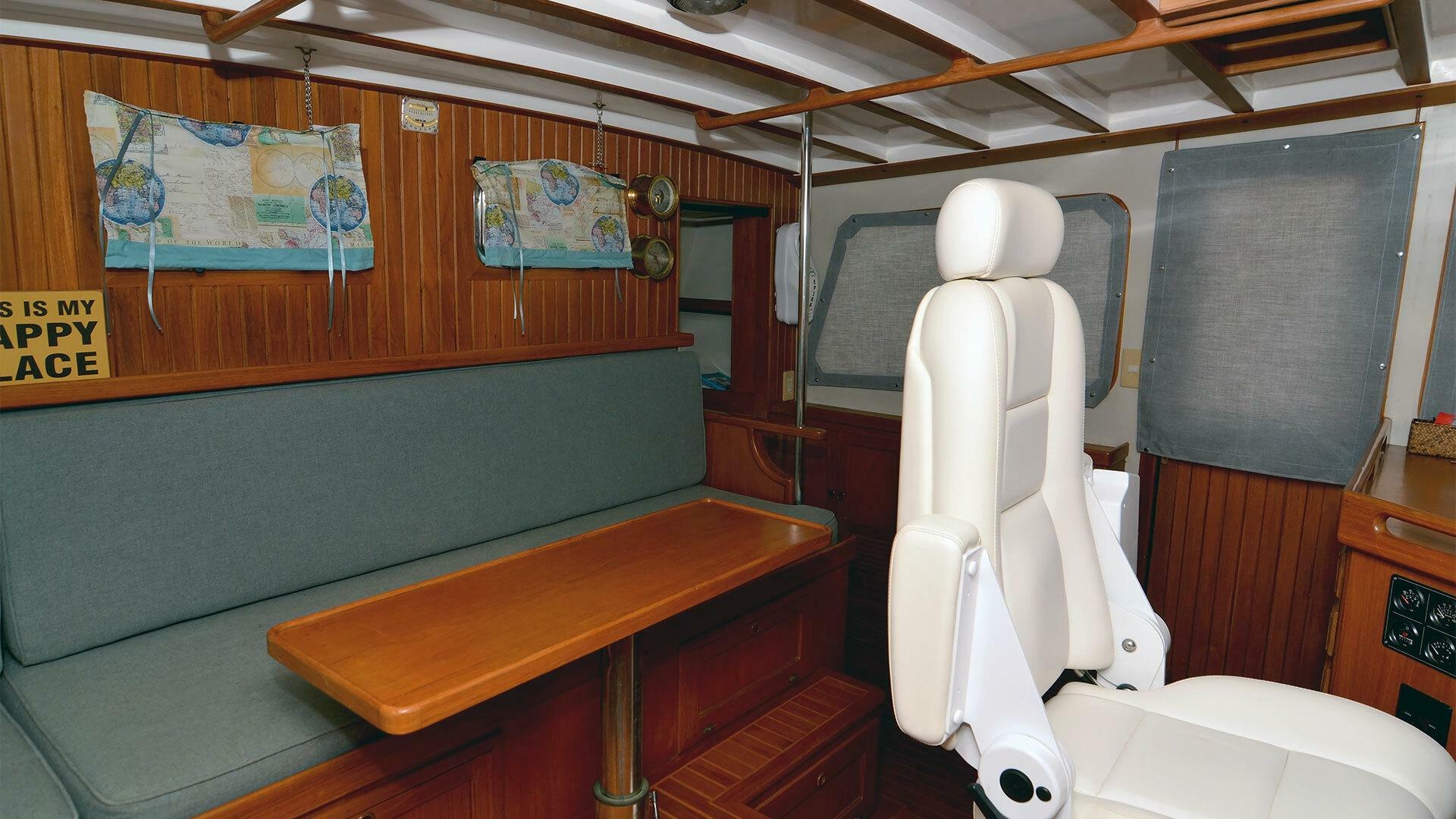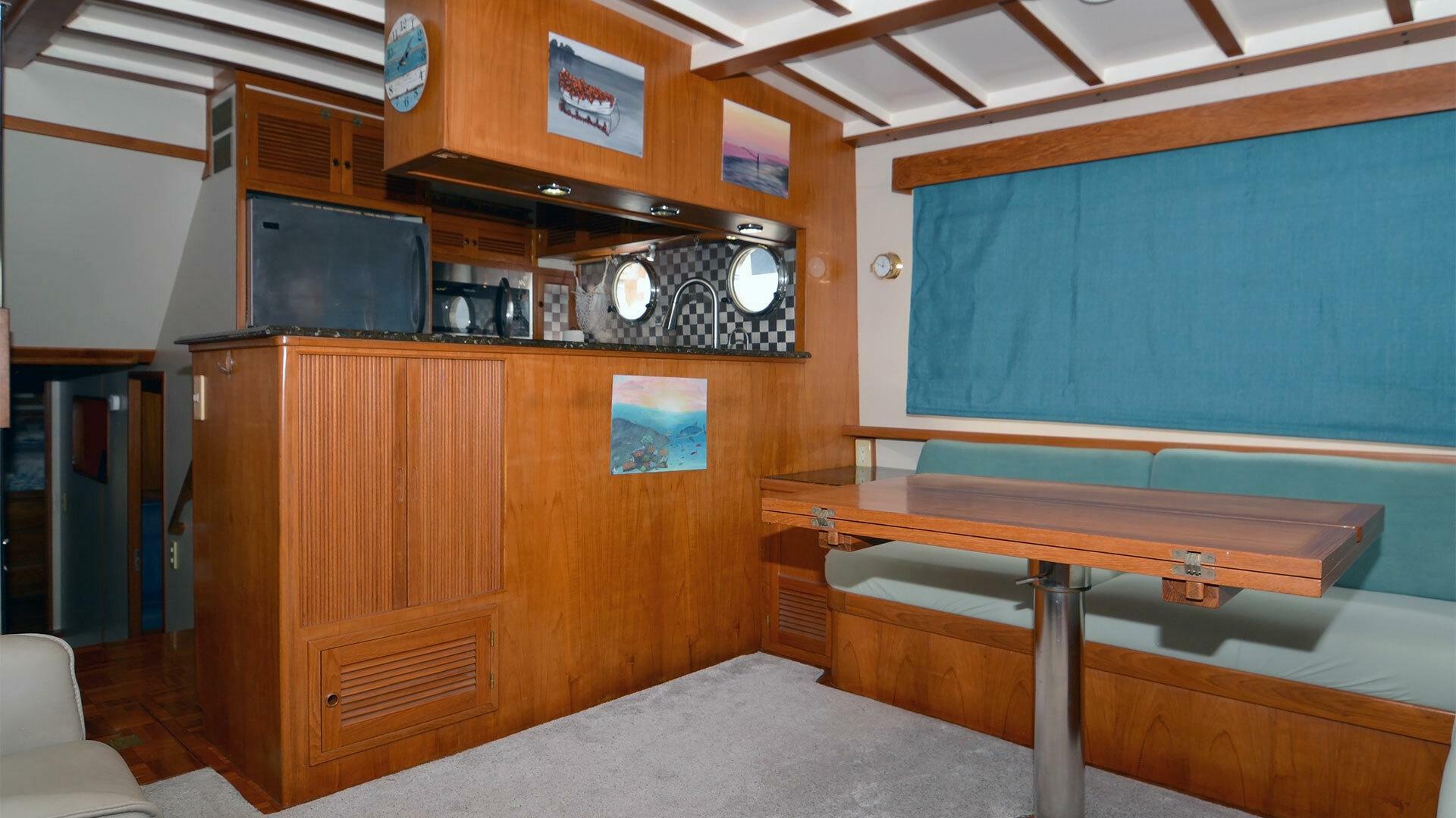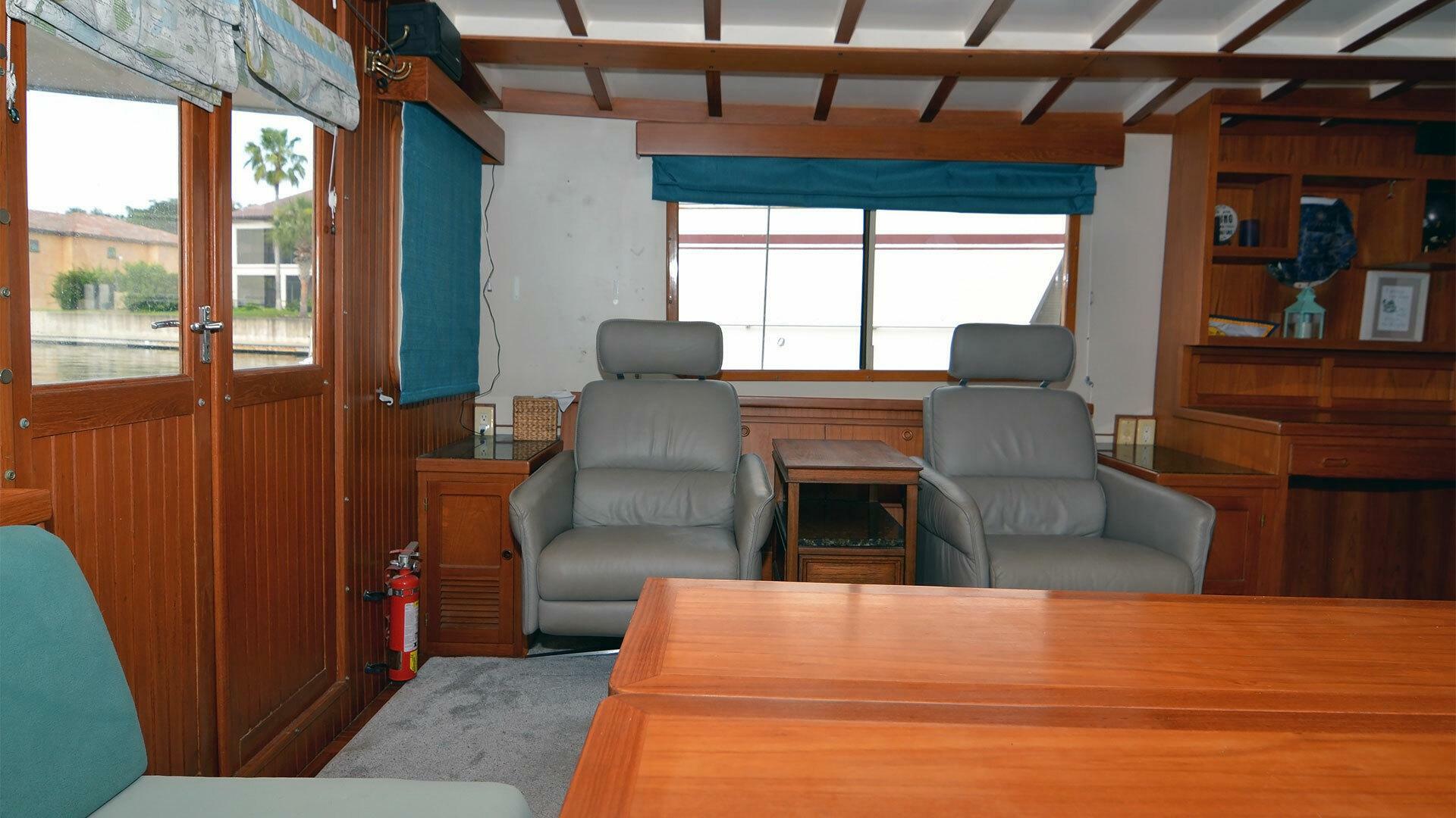 The saloon aboard Great Escape creates a very open, airy, and pleasant living space. For visibility, light and ventilation, there are large opening windows port and starboard as well as an opening window in the aft bulkhead. Great Escape has a roomier feel inside since she is a widebody configuration with the only walking deck to starboard. To starboard is an L-shaped settee with a teak wood hi-lo table. Forward of the settee is a cabinet for the entertainment center. To port there are two home style upholstered chairs. The engine room is accessed by a floor hatch forward in the sole.