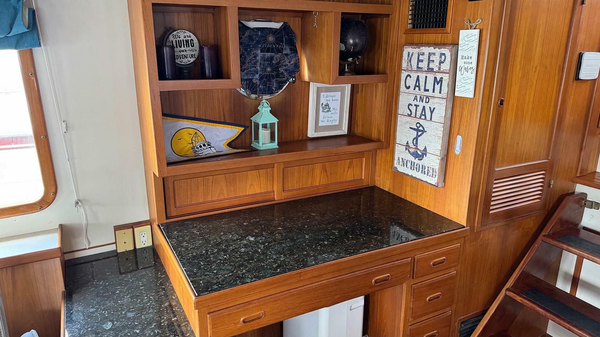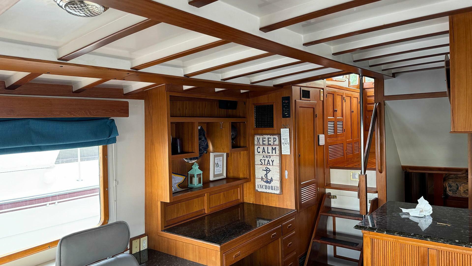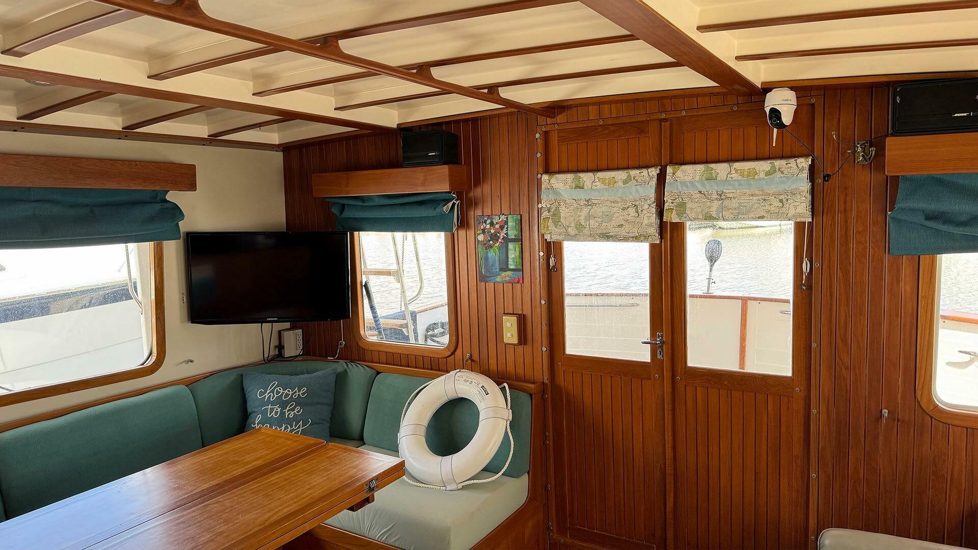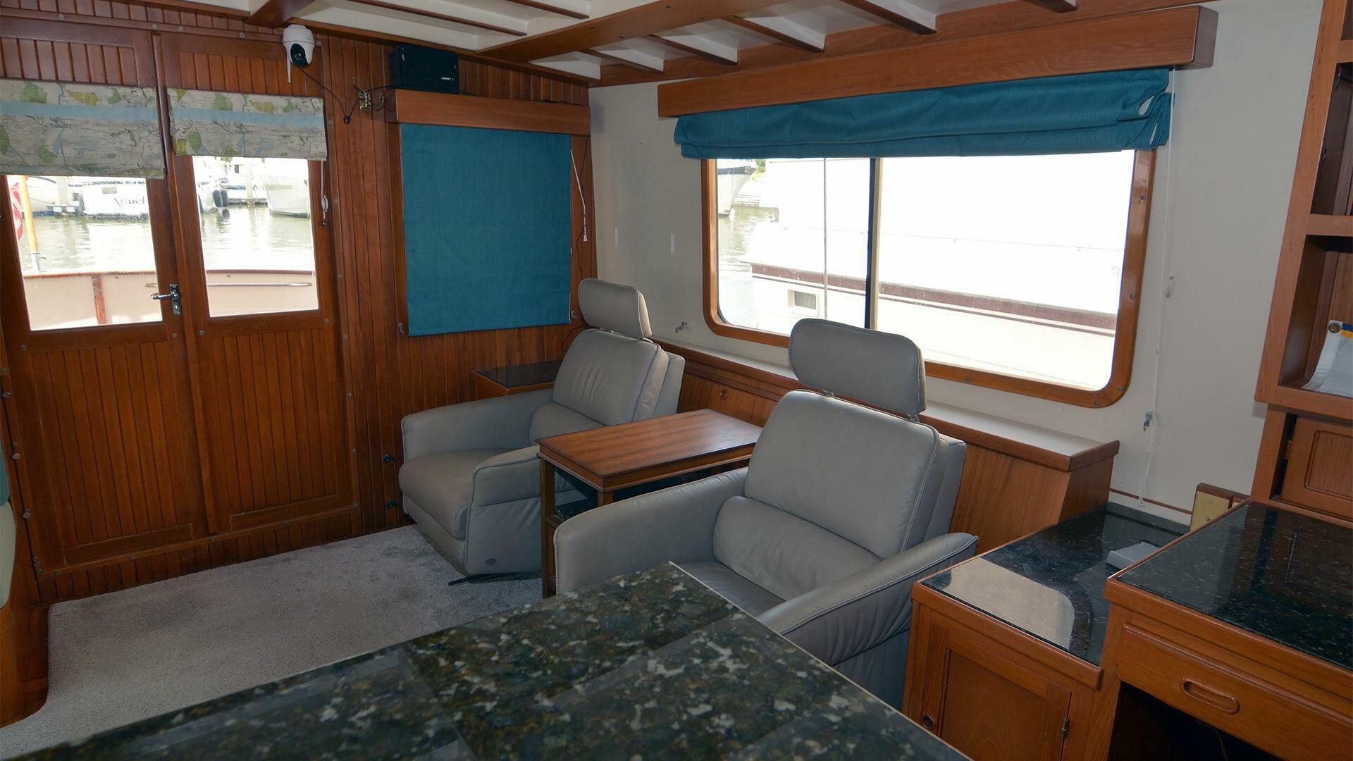 The saloon aboard Great Escape creates a very open, airy, and pleasant living space. For visibility, light and ventilation, there are large opening windows port and starboard as well as an opening window in the aft bulkhead. Great Escape has a roomier feel inside since she is a widebody configuration with the only walking deck to starboard. To starboard is an L-shaped settee with a teak wood hi-lo table. Forward of the settee is a cabinet for the entertainment center. To port there are two home style upholstered chairs. The engine room is accessed by a floor hatch forward in the sole.