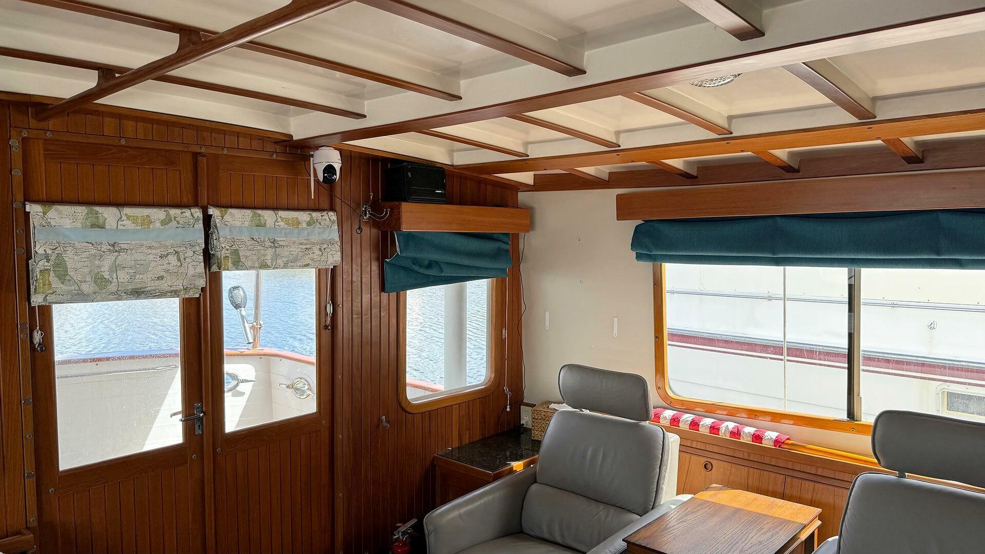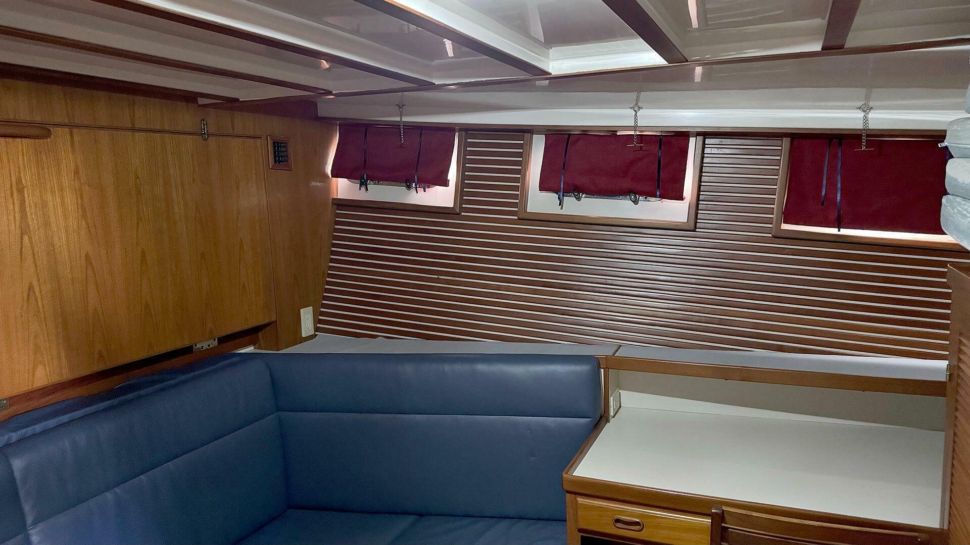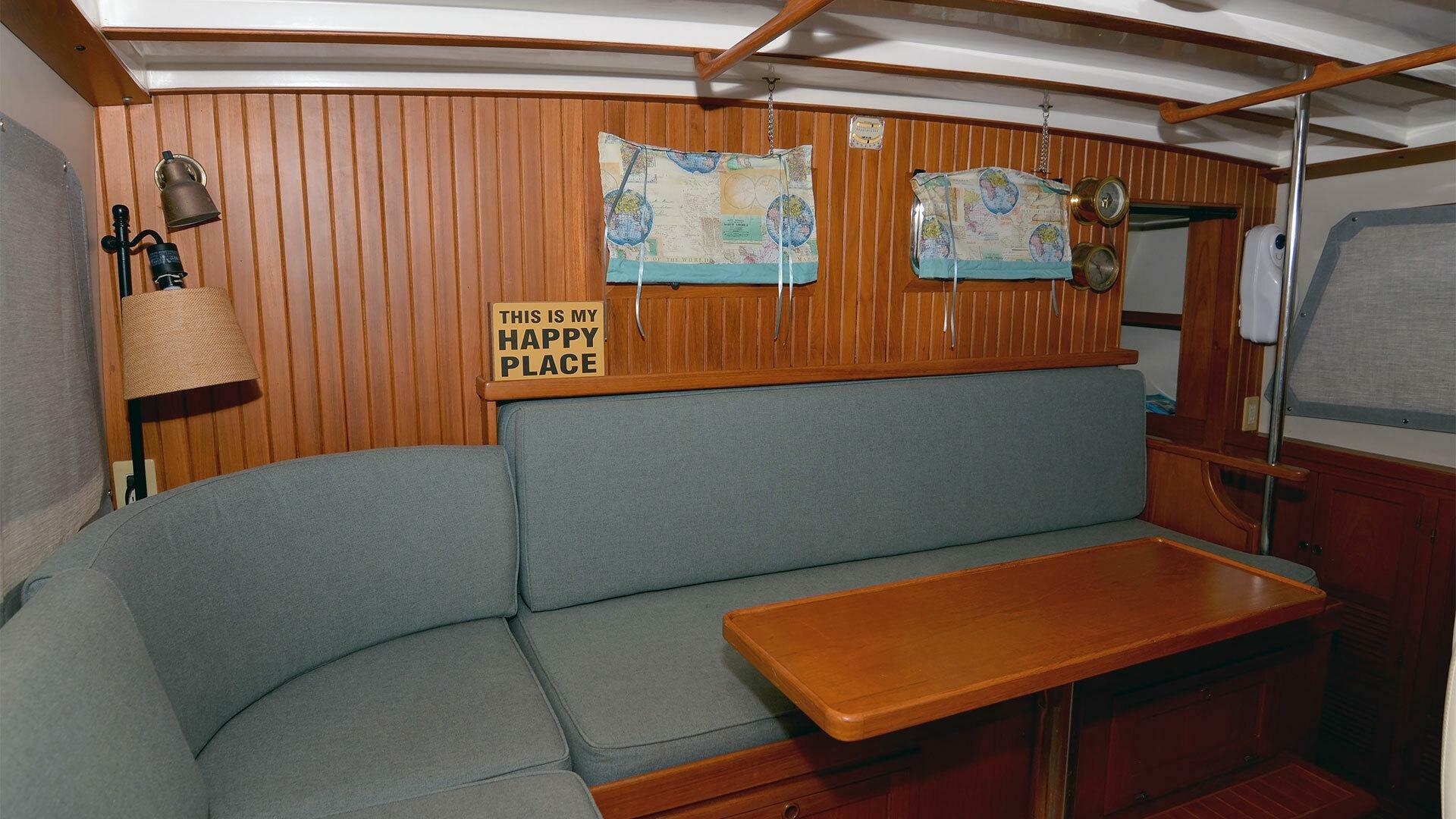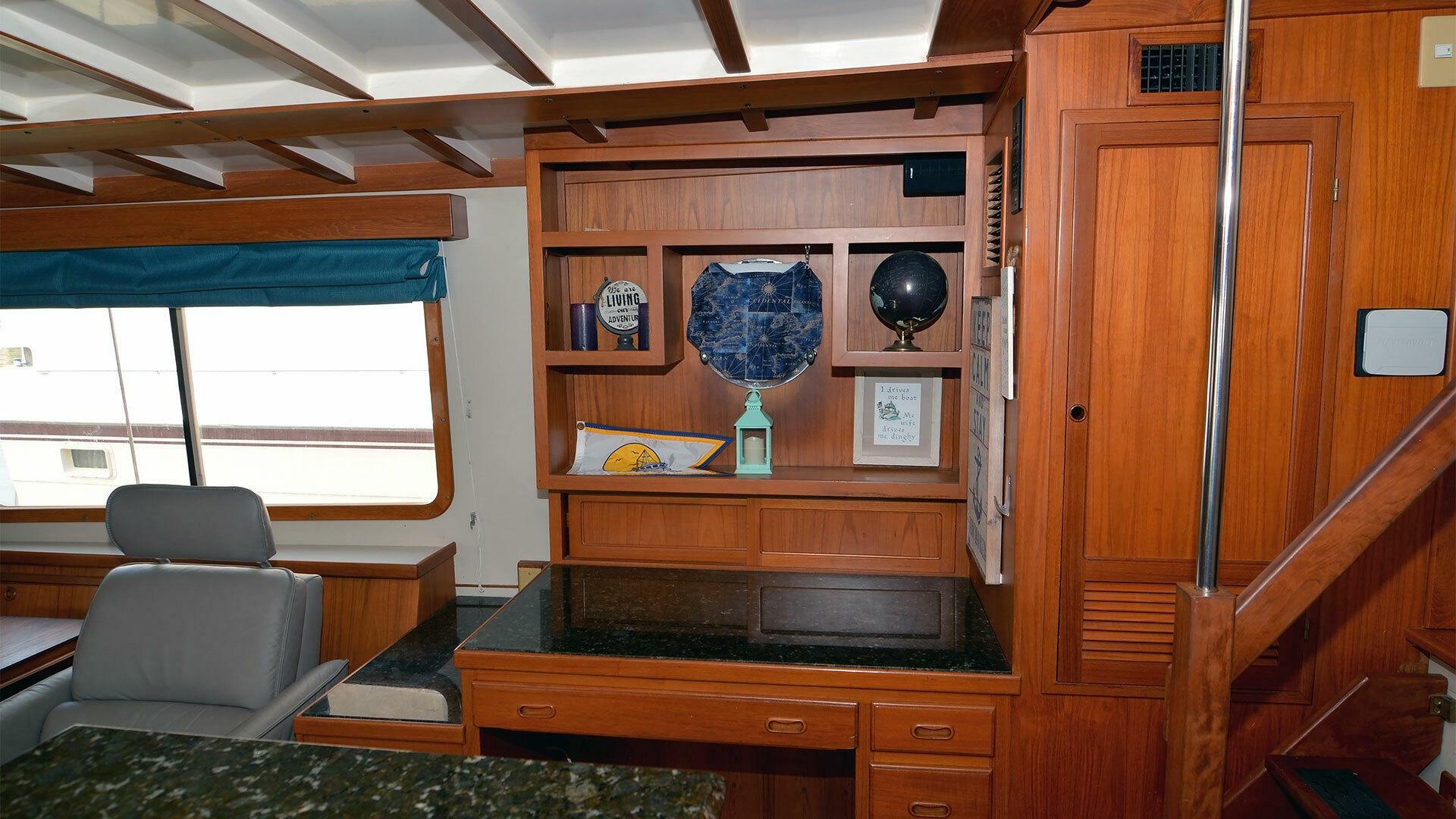 The saloon aboard Great Escape creates a very open, airy, and pleasant living space. For visibility, light and ventilation, there are large opening windows port and starboard as well as an opening window in the aft bulkhead. Great Escape has a roomier feel inside since she is a widebody configuration with the only walking deck to starboard. To starboard is an L-shaped settee with a teak wood hi-lo table. Forward of the settee is a cabinet for the entertainment center. To port there are two home style upholstered chairs. The engine room is accessed by a floor hatch forward in the sole.