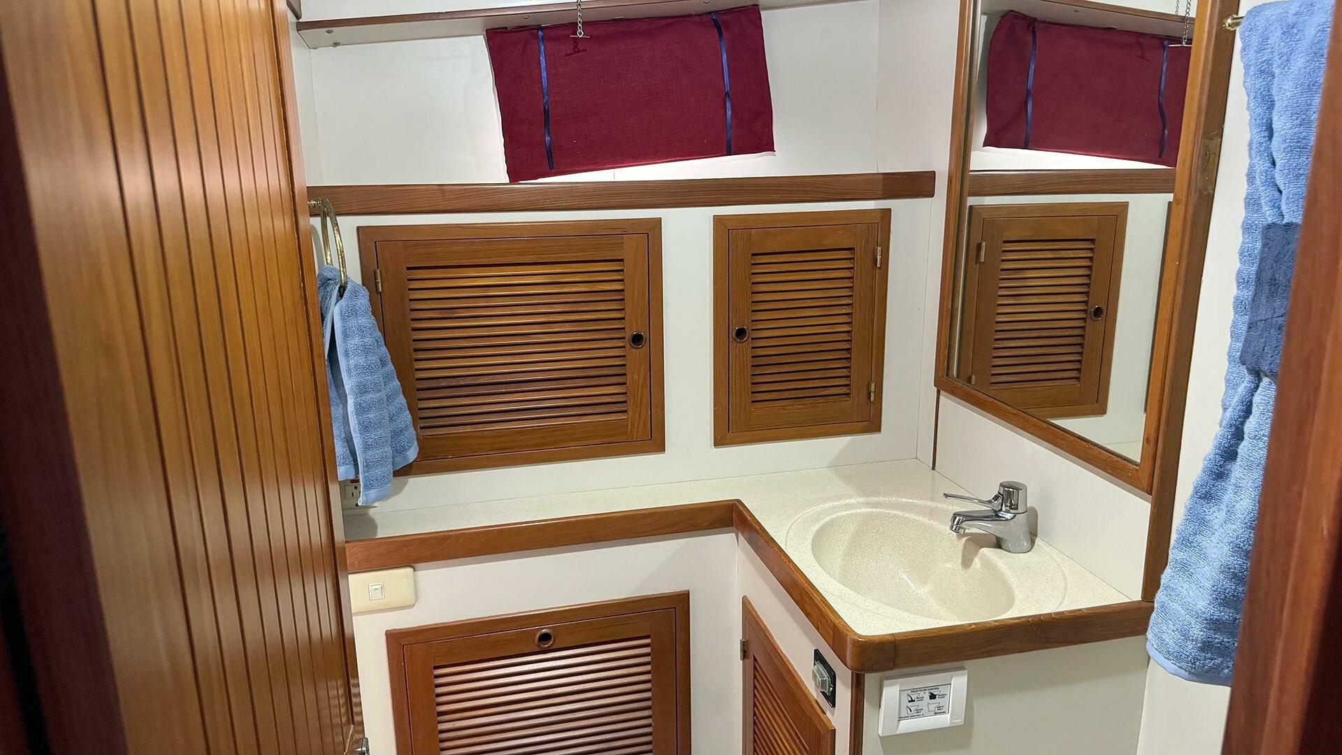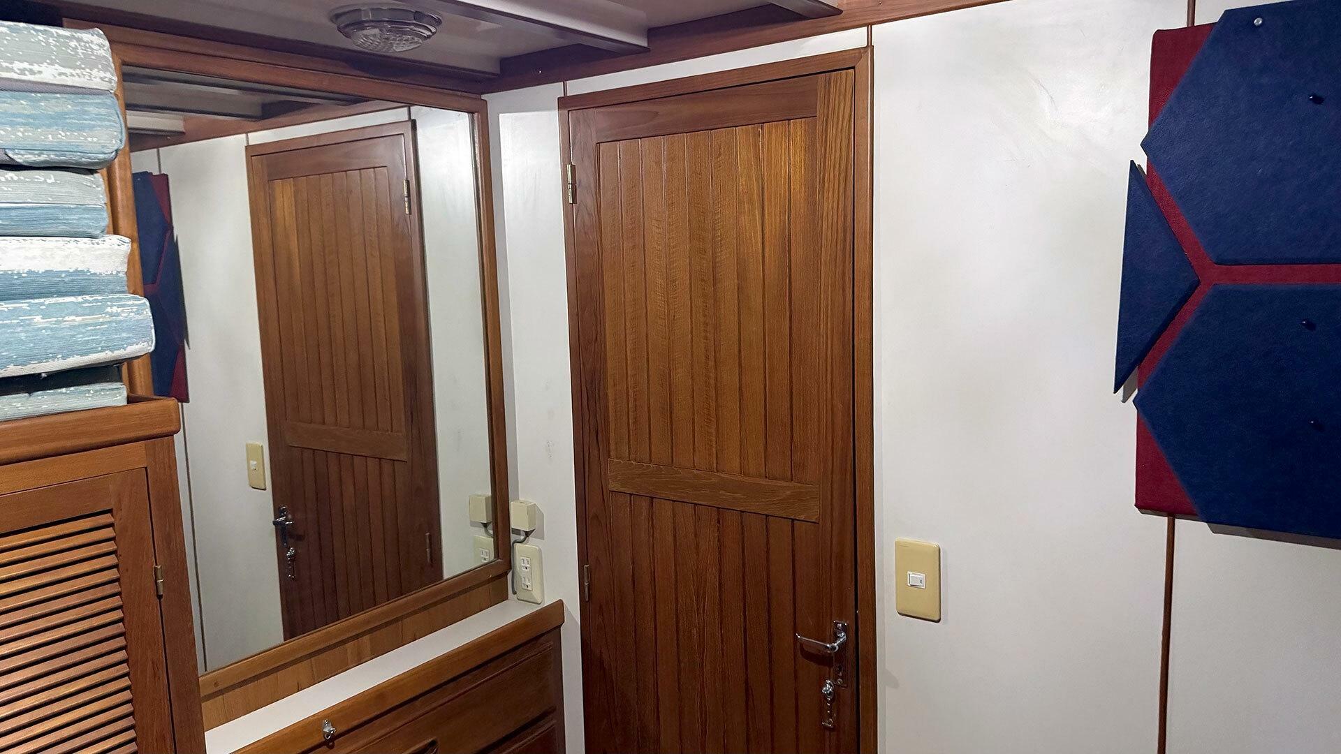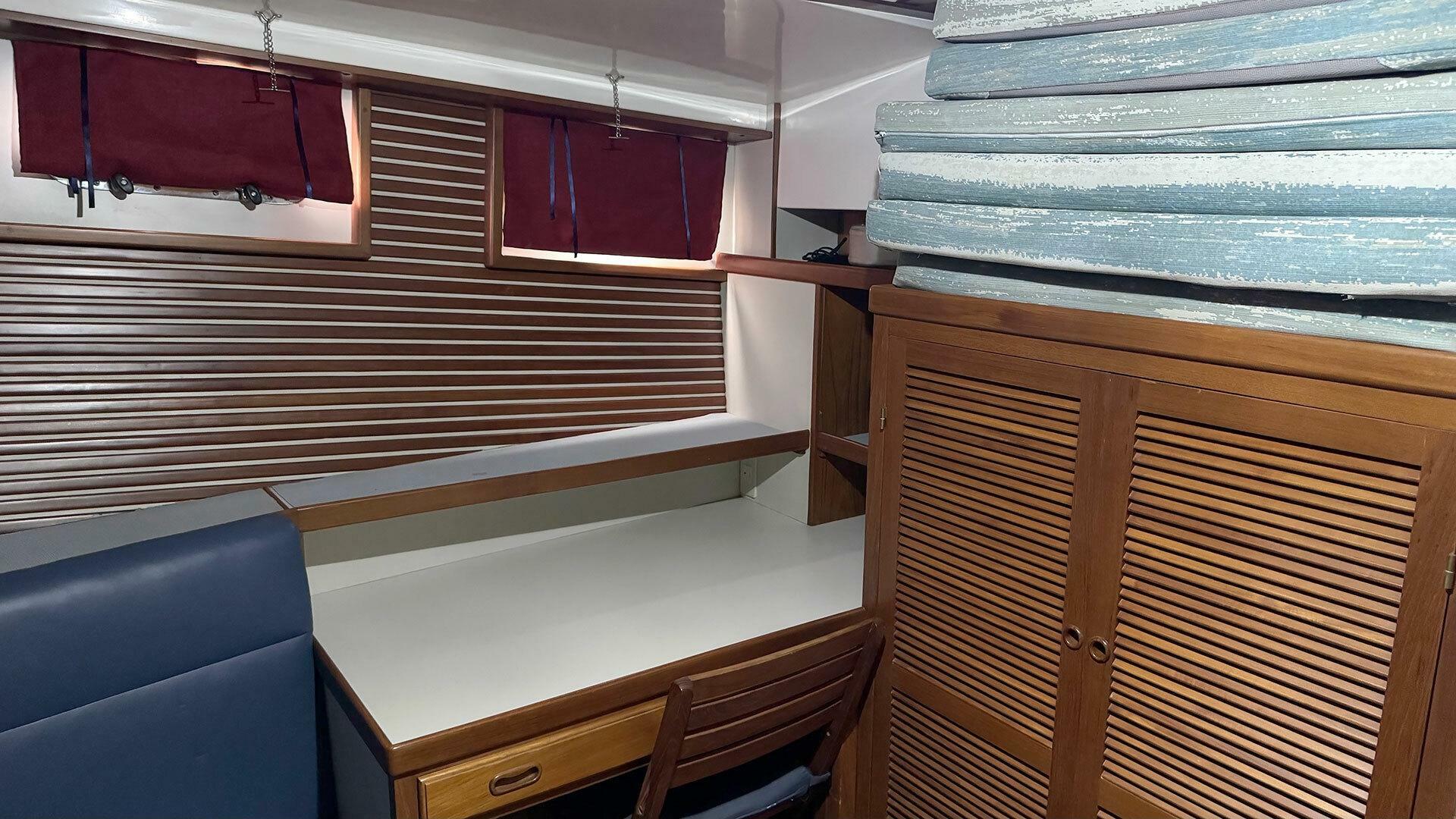 The guest stateroom to starboard can sleep two and serve as an on-board office. There is an athwartship double bed at seat height and a Pullman “shelf-type” bunk bed above. For working aboard, there is a desk with a chair and drawers. The teak ceilings along the hull sides blend with the three opening portlights. Large hanging locker with louvers.