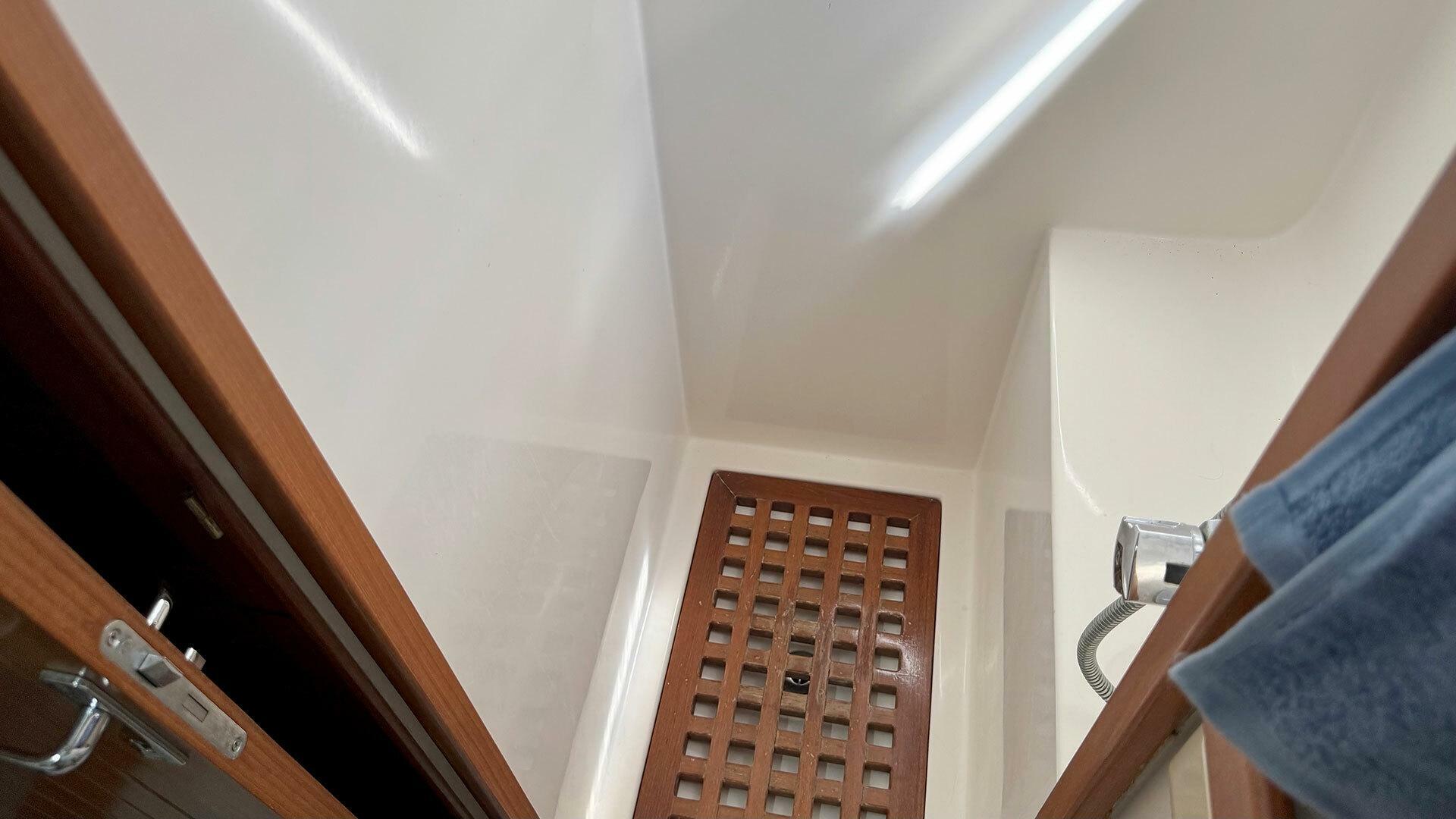 The guest head (independent/day head) is across to port from the guest stateroom. The single basin sink is below the mirror. The toilet is freshwater Raritan Elegance electric. The standup shower has a built-in seat. The guest head also contains the stacked GE clothes washer/dryer.