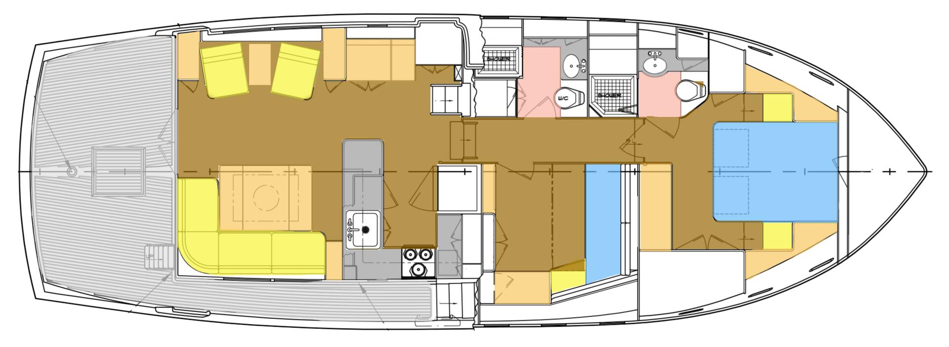 Two: Owner stateroom (island berth) | Starboard guest stateroom (two single berths)