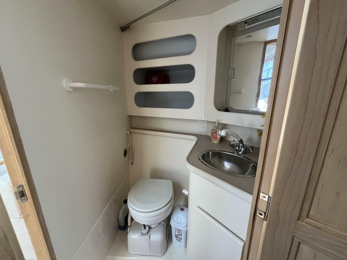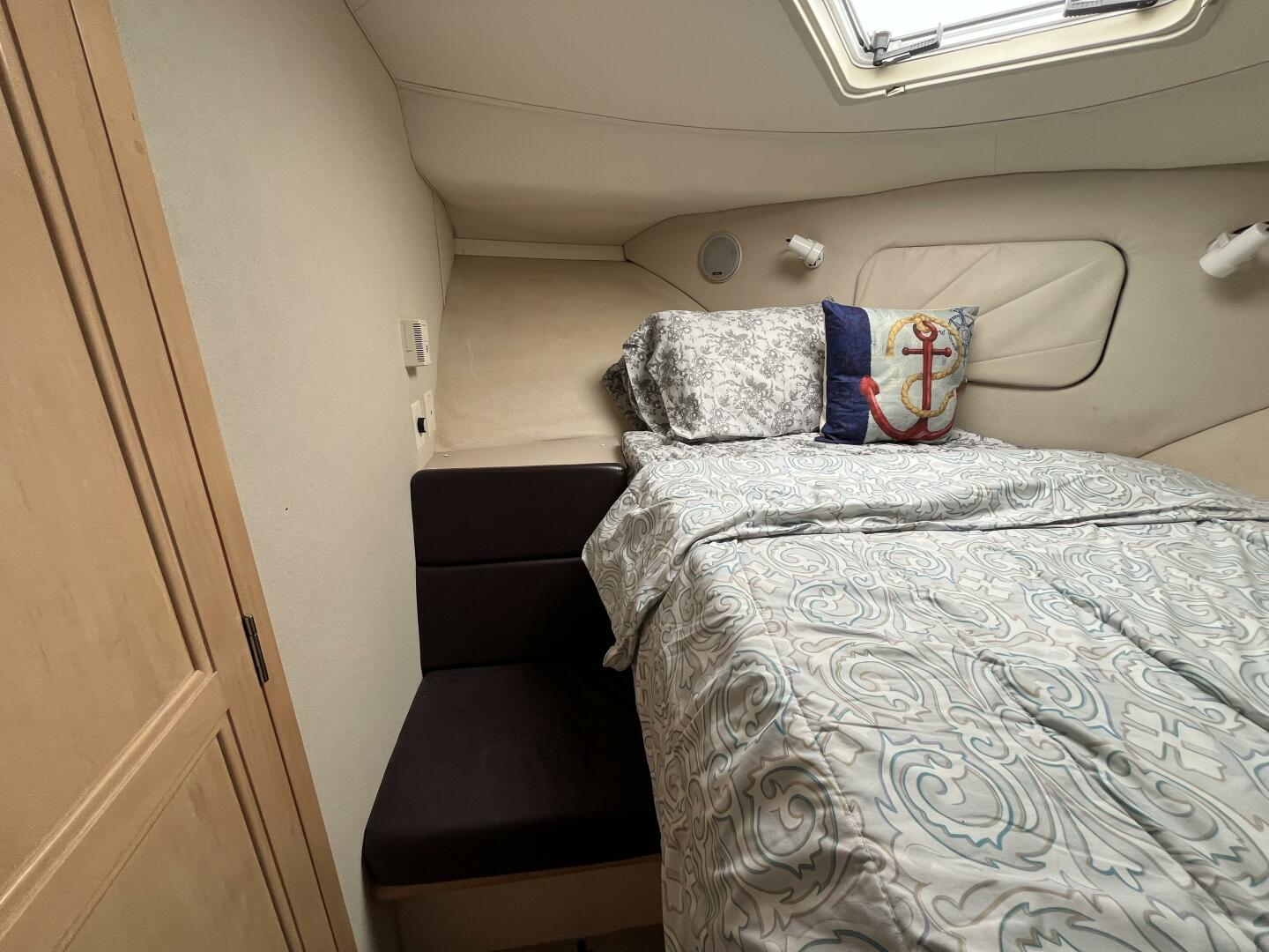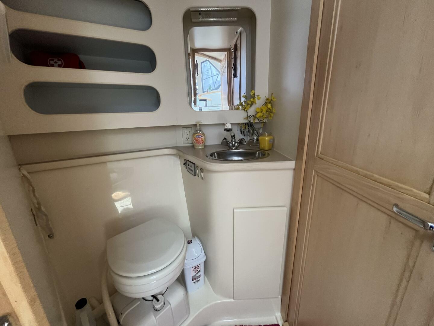The aft Stateroom offers a queen size walk-around berth, built-in wall units for storing and hanging your clothes, a seat on either side of the berth, and access to it's own private full Head! The V-Berth is an angled double berth and features a built in cabinet and a bed side seat. It also has semi-private access to a full Head.