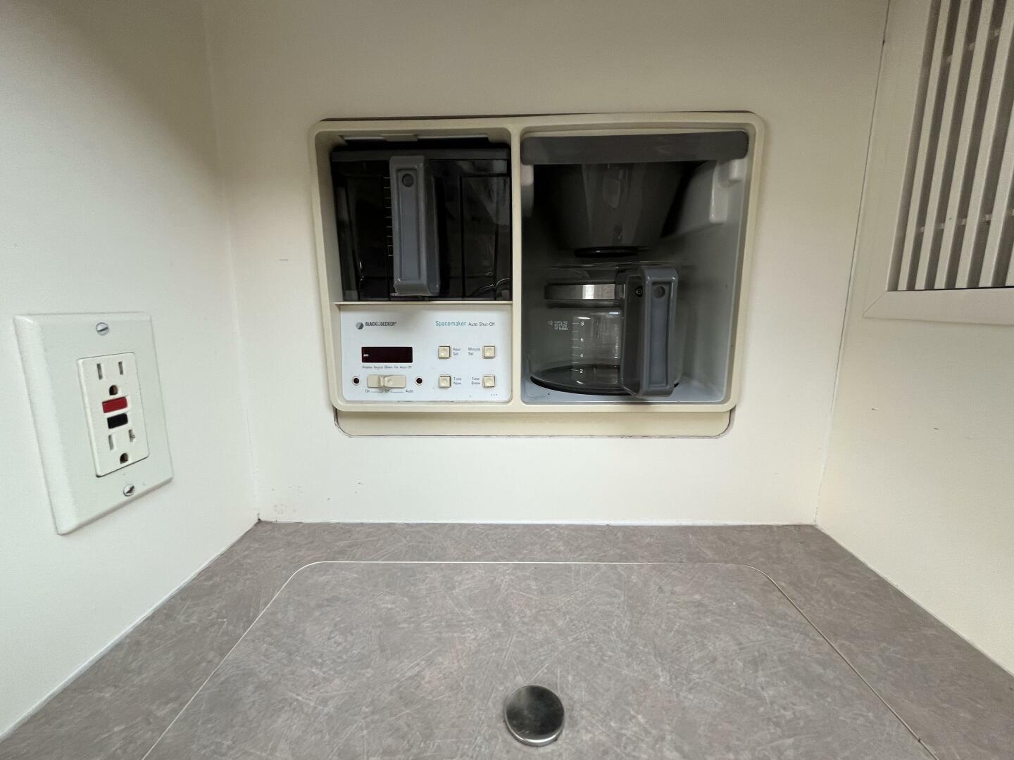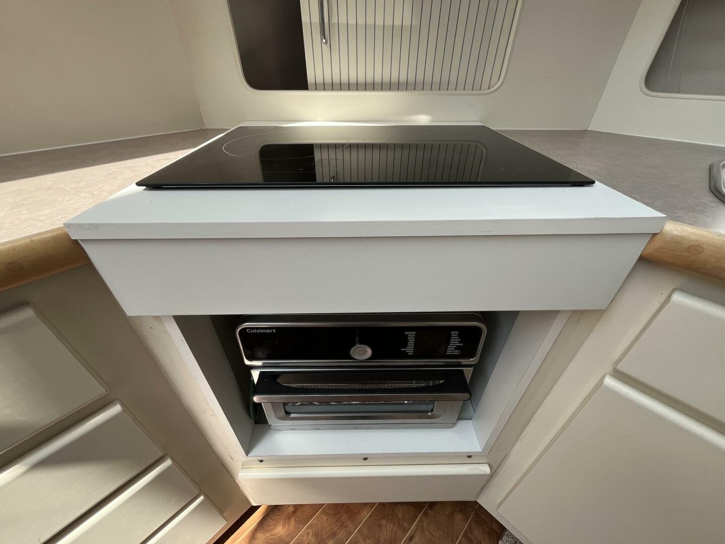 The Galley is huge! There is a full-size fridge/freezer, a microwave oven, an air fryer, and a new 2-burner Induction stove top - all surrounded by plenty of counter space. There is a large C-shaped booth-style dinette in the Galley for family meals.
