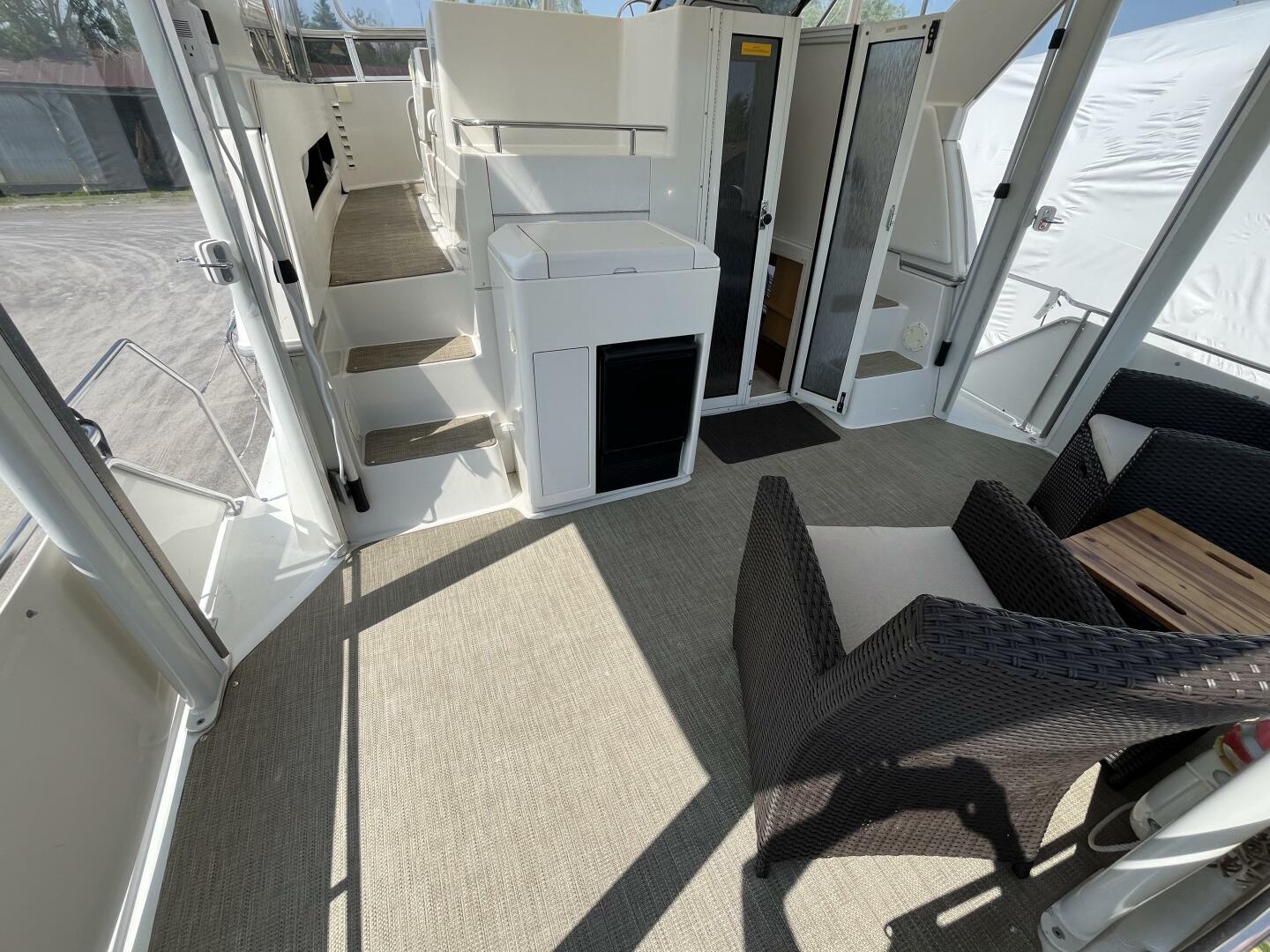 The aft deck is very welcoming with comfortable furniture, a wet bar, and tall-door access to the cabin. There is even an plexiglass door on each side to gain access to the bow. The area is covered with a hardtop!